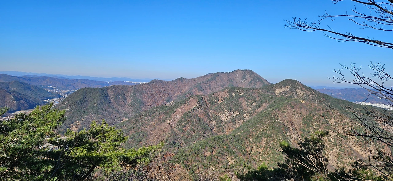 갑하산으로 간다. 왼쪽에는 대전현충이 있고 오른쪽에는 계룡산이 있다. 갑하산을 오르면 오늘의 세 번째 정자다 정산에 개인묘가 있다고 주의 표시를 해두었다. 갑동마을로 내려갈 수도 있지만 오늘은 삽재를 거쳐서 도덕봉을 오르고 난다음 그다음 일정을 결정하기로 한 만큼 삽재로 내려간다. 삽재로 내려가면서 가파른 내리막을 경험한다. 갑하산이 466m이고 삽재가 160m이니 무려 300m를 그대로 내려가는 것이다. 삽재로 내려가는 길에서 바라다보는 계룡산은 우리가 통상적으로 걷는 삼불봉, 자연성능, 관음봉 코스가 그대로 보인다. 그리고 동학사지구의 위락시설도 그대로 나타난다.