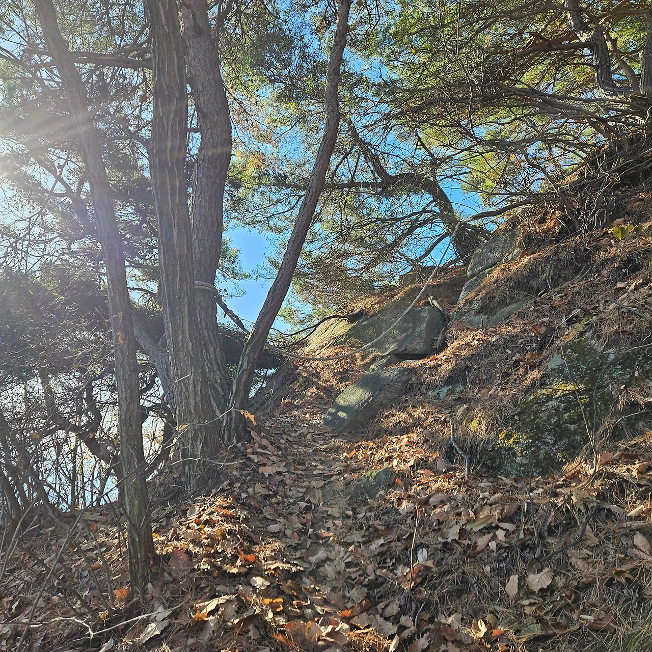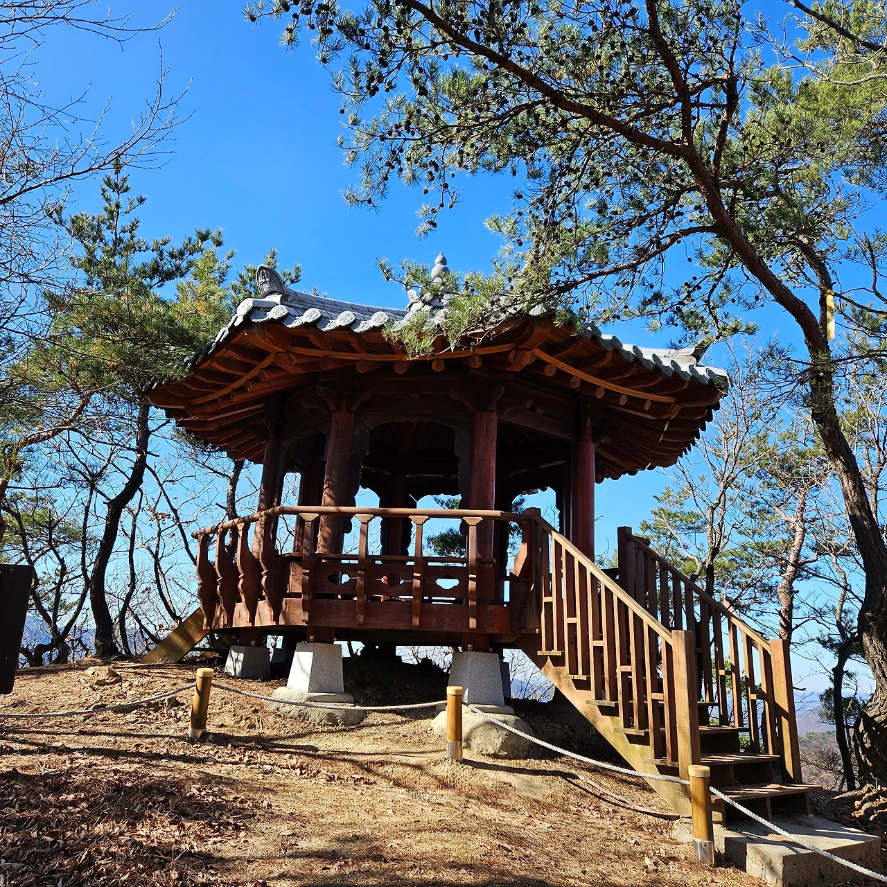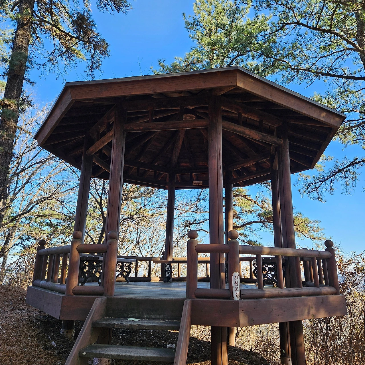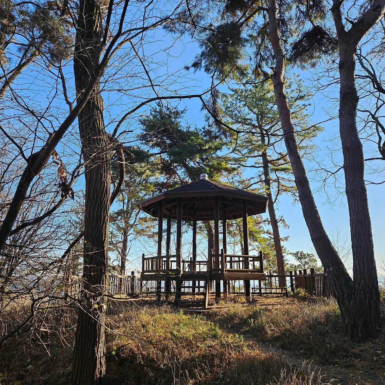 왼쪽은 군부대 오른쪽은 우산봉을 오르는 등산로가 지속적으로 나타난다. 군부대의 경계선을 따라 올라가면 좀 더 가파른 만큼 지인을 생각하여서 좀 더 우회하면서 산을 오른다. 한 번씩 비틀면서 산을 오르고 산의 가파름이 좀 더 여유를 가지면서 산을 오른다. 그리고 첫 번째 봉우리를 오른다. 이름이 없는 봉우리이지만 해발이 250m 정도이고 이 봉우리를 오르는 것이 해발 80m에서 시작하여 갑자기 해발을 끌어올리는 것이고 몸이 준비가 덜 되어서 힘들다고 할 수 있다. 그리고 첫 번째 오른 것이고 첫 번째 정자를 만났다.