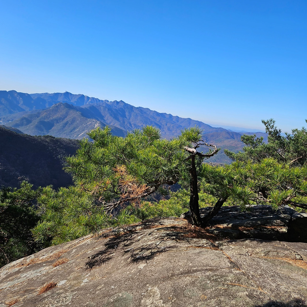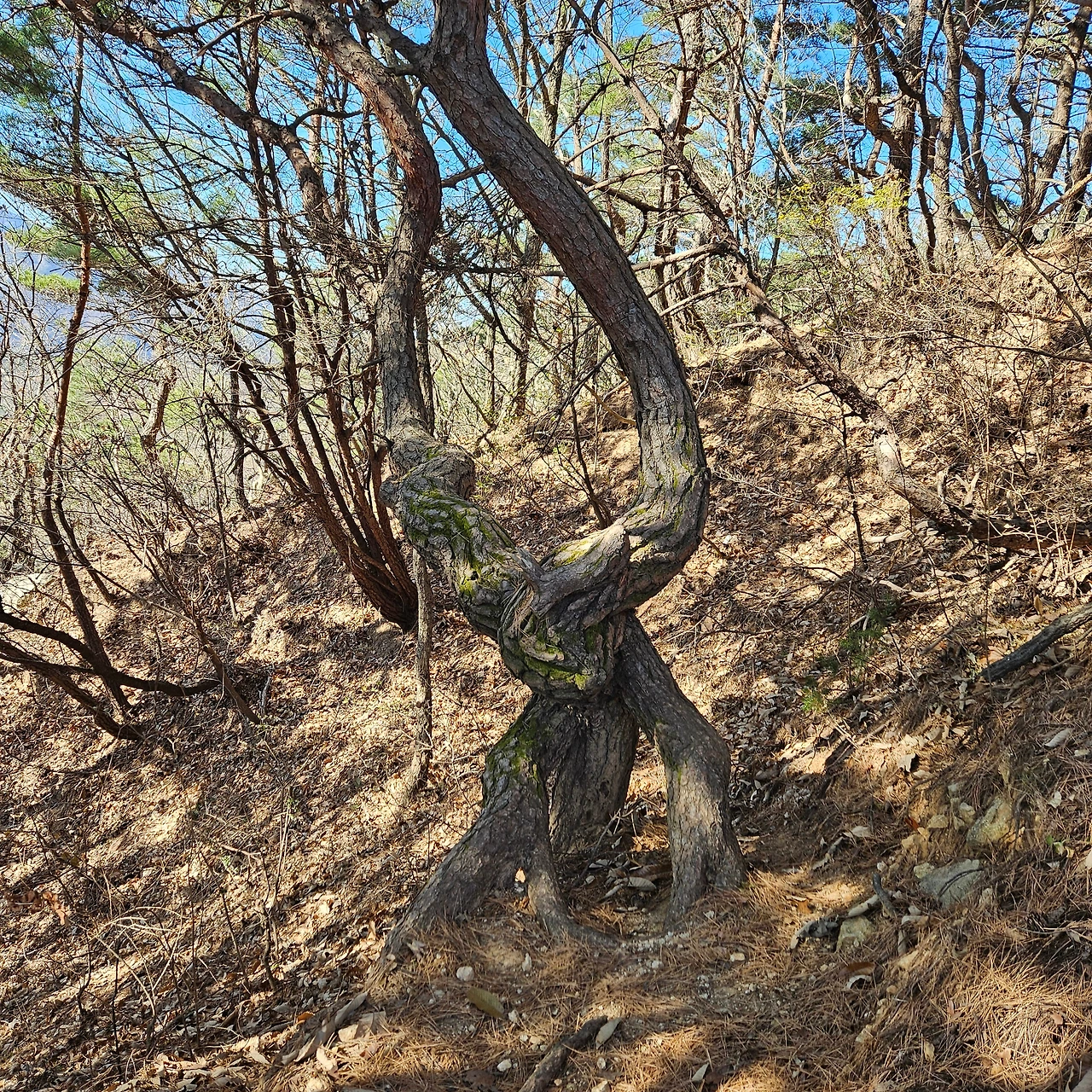 이제 우리는 그 가파른 길을 내려가야 한다. 내가 기억하기로 거북바위가 있고 요괴소나무가 있는 곳이다. 거북바위를 찾아서 오르내린 기억이 있다. 두 번째 산행할 때도 그것이 거북바위라고 하면서 지나갔는데 오늘은 기억코 보았다. 사진을 담으니 진짜로 거북바위처럼 보인다. 요괴소나무가 왜 소나무인지를 지인이 이야기를 한다. 앞으로 나온 모습하고 두 팔을 벌린 것처럼 줄기가 뻗어 있고 다리가 세 개다. 그것이 요괴소나무인 것이다. 사람이 생각한 모습으로 그것을 보일 수도 있고 첫인상으로 그것을 볼 수도 있는 것이다. 나무나 바위 등은 첫인상으로 그것을 보아야 한다고 본다.