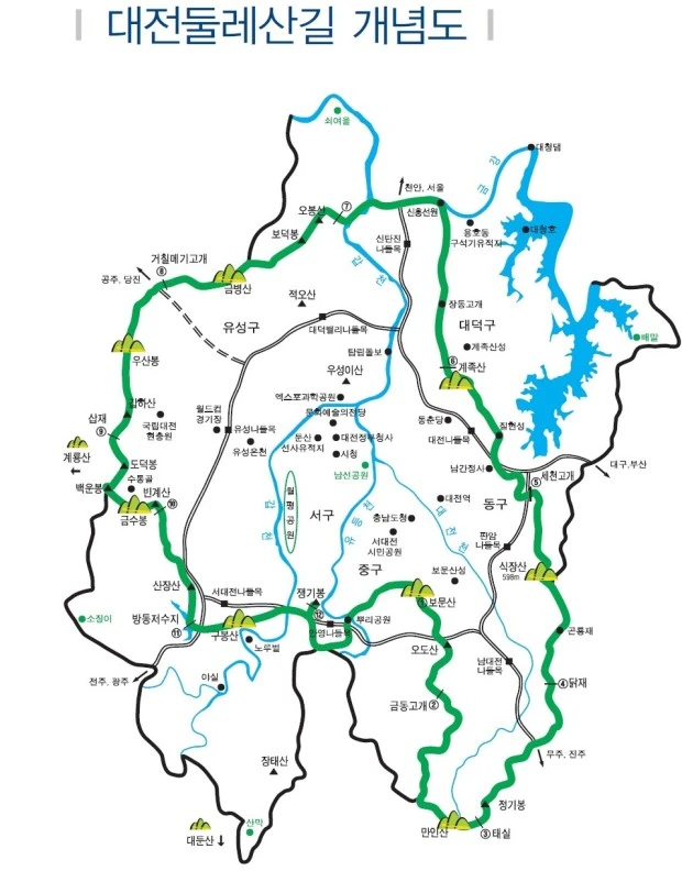 대전의 둘레길은 다르다. 무조건 산의 정상으로 가야 한다. 그래서 대전은 둘레길이라고 정의하지 않고 둘레산길이라고 정의하고 있다. 서쪽의 산인 우산봉을 지나는 8구간과 도덕봉과 금수산, 빈계산을 지나는 9구간이 있다. 오늘은 8구간과 9구간을 걸어본다. 대전시에서 홈페이지에서 "8구간은 대전 서편의 우산봉과 갑하산을 중심으로 최고의 눈 맛을 자랑하는 구간이다. 숲 속길과 능선길이 잘 조화를 이르고 있고 특히 서쪽 편으로 펼쳐지는 계룡산 산줄기를 한눈에 조망할 수 있어 장쾌함을 선사한다"이고, "9구간은 삽재에서 도덕봉을 오르는 초입에 소나무 숲이 정겨우며 약간은 힘이 들지만 그리 어렵지 않다. 이곳은 산이 높고 계곡이 깊어 다양한 야생동물들이 서식하고 있는 꼭 보전해야 할 자연유산이다."라고 설명되어 있다.