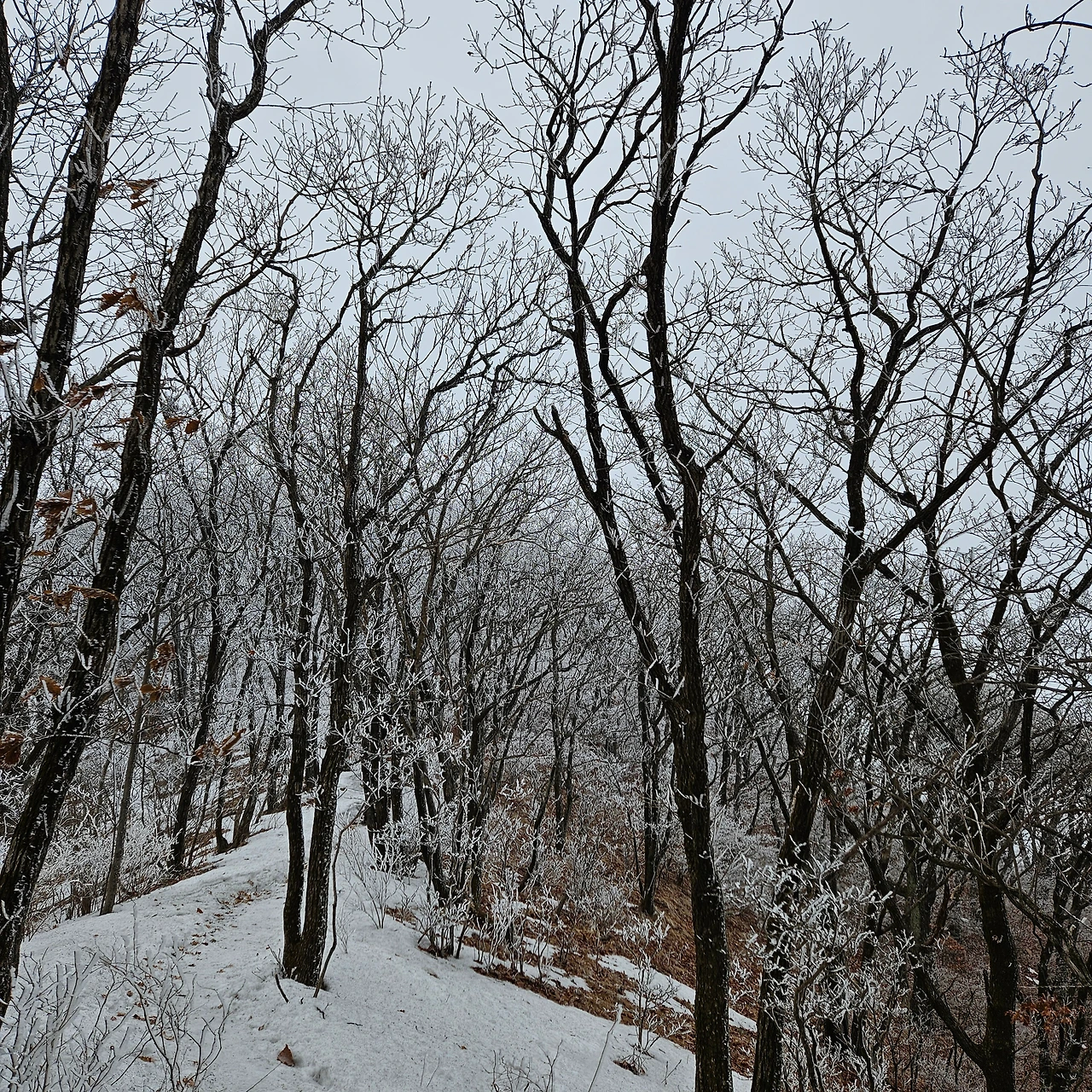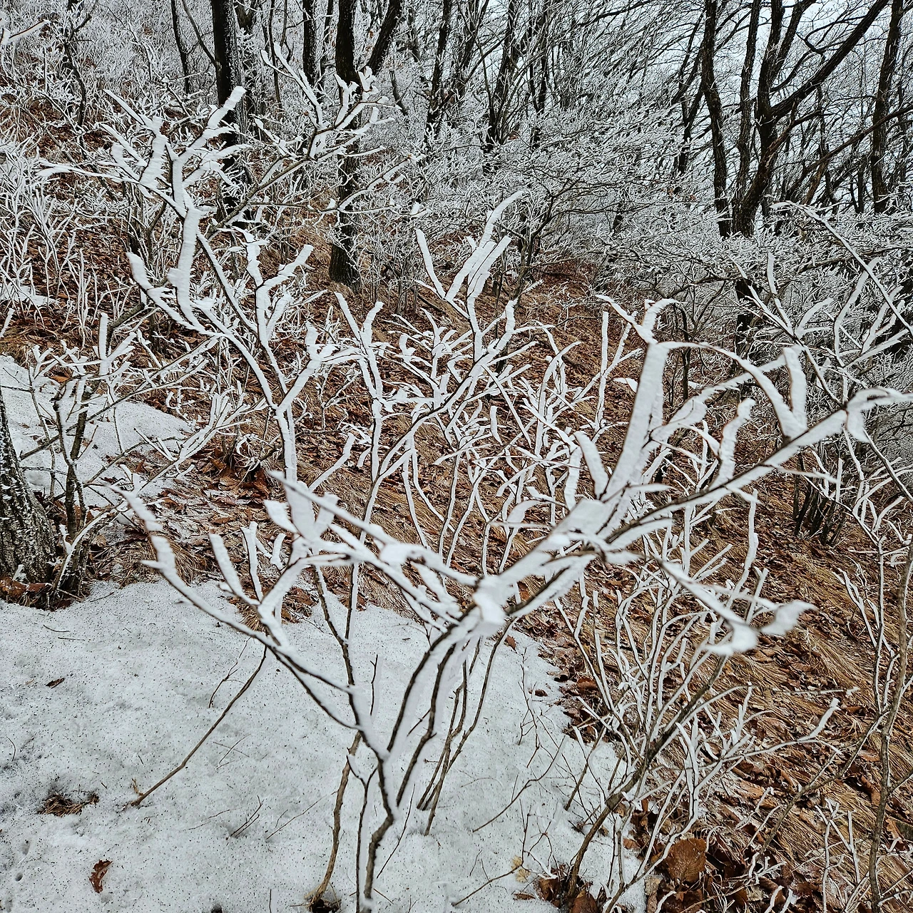 암릉지대가 끝나는 지점에서 2 관문으로 갈 것인지 3 관문으로 갈 것인지 이정표가 나타난다. 그 이정표에 따르면 2 관문은 가깝다. 그리고 내려가는 길이 가파를 것 같다. 3 관문으로 간다. 3 관문으로 가는 길이 이제 암릉이 아니니 이제는 편안한 길의 연속이라고 보아야 할 것이다. 오르고 내리지만 암릉에서 힘들게 지나왔기에 이 길은 그냥 평범한 길로 보인다. 이곳에서 다시 눈꽃이 보이기 시작한다. 그동안 힘들어서 눈꽃도 보이지 않았는데 이제는 편안한 길이 되어서 보이는 것이다. 사람들이 한곳에 집중을 하면 다른 것이 보이지 않았다는 것을 실험을 통해서 확인을 한 것을 본 기억이 있다. 이것이 오늘 우리에게 있었던 것이다. 그동안 눈도 오고 눈꽃도 있었지만 암릉 구간을 통과하는 것이 우선시되어 그것을 보지 못한 것이다.
