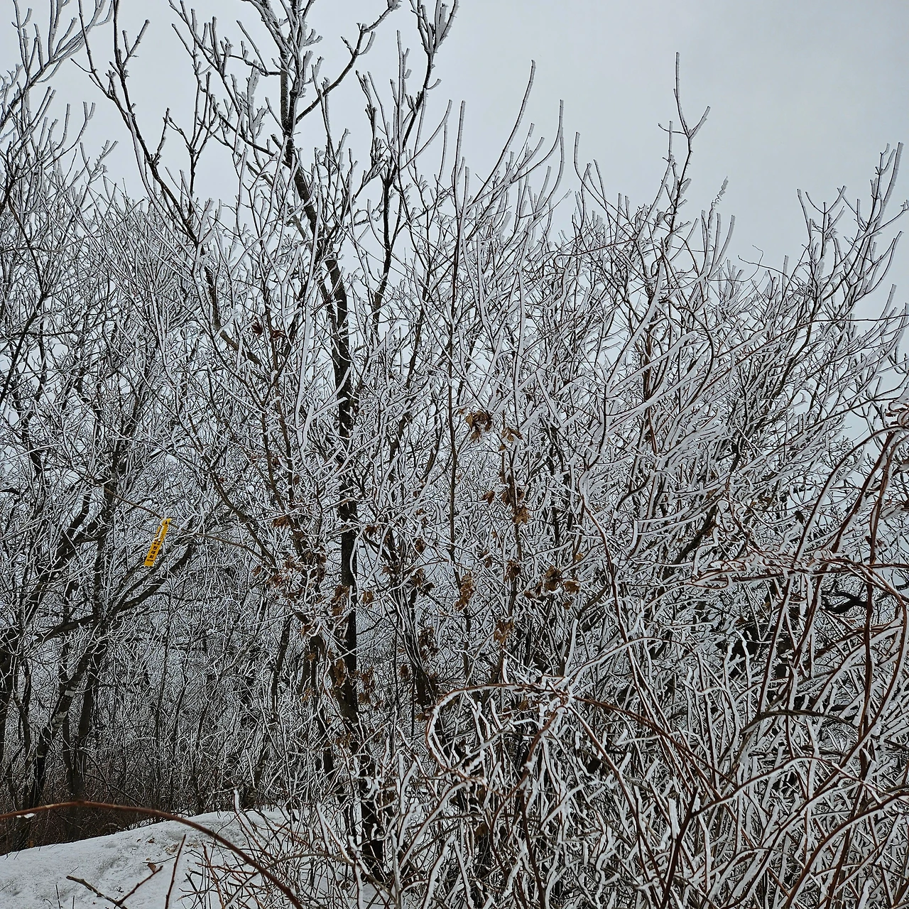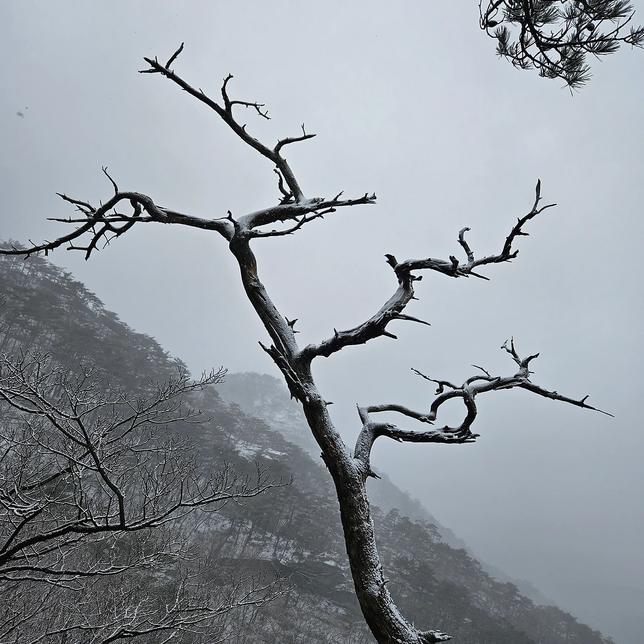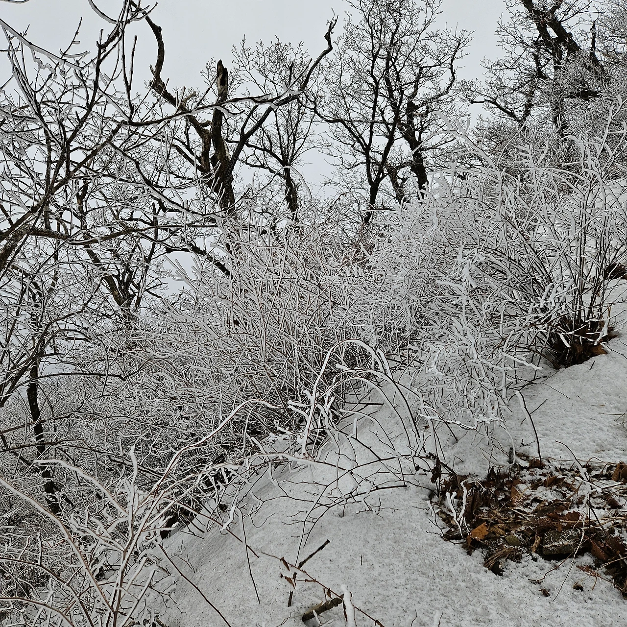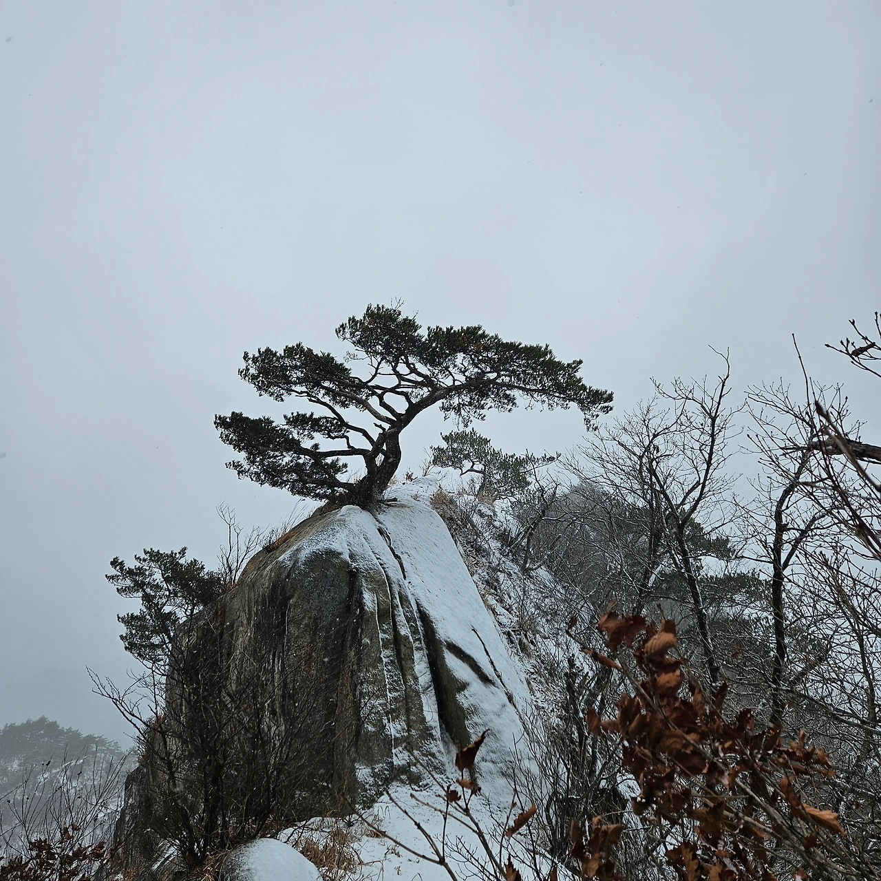 조령샘을 지나면서 눈이 오고 상고대도 피고 하여서 산은 온통 설산이 되었다. 지난주 설산을 보기 위하여 남덕유산을 갔을 때는 보지 못하였던 상고대도 보았다. 소나무 위에 눈꽃이 피었다. 주변의 나무들이 설경을 이루고 있다. 바람이 남에서 북으로 불고 우리는 남에서 북으로 가면서 이상한 경치를 본다. 우리의 왼쪽은 온통 설산인데 오른쪽은 그냥 비가 오는 것처럼 눈이 보이지 않는다. 그것을 이상하게 보면서 그 이유를 2시간이 지난 후에 알게 되었다. 우리가 가는 길에 왼쪽으로 바람이 불고 있기에 그것만 보인 것이다. 착각인 것이다. 착각을 하고 이상한 경치라고 생각을 한 것이다.