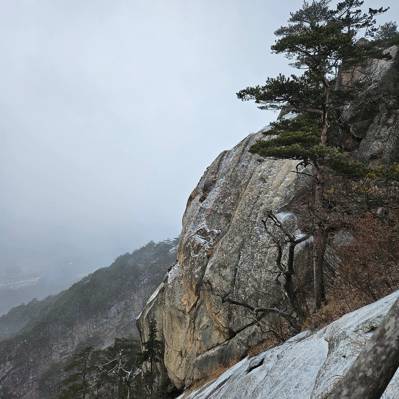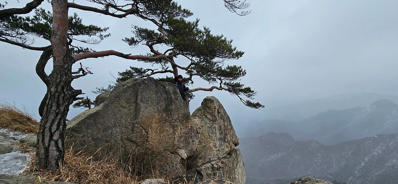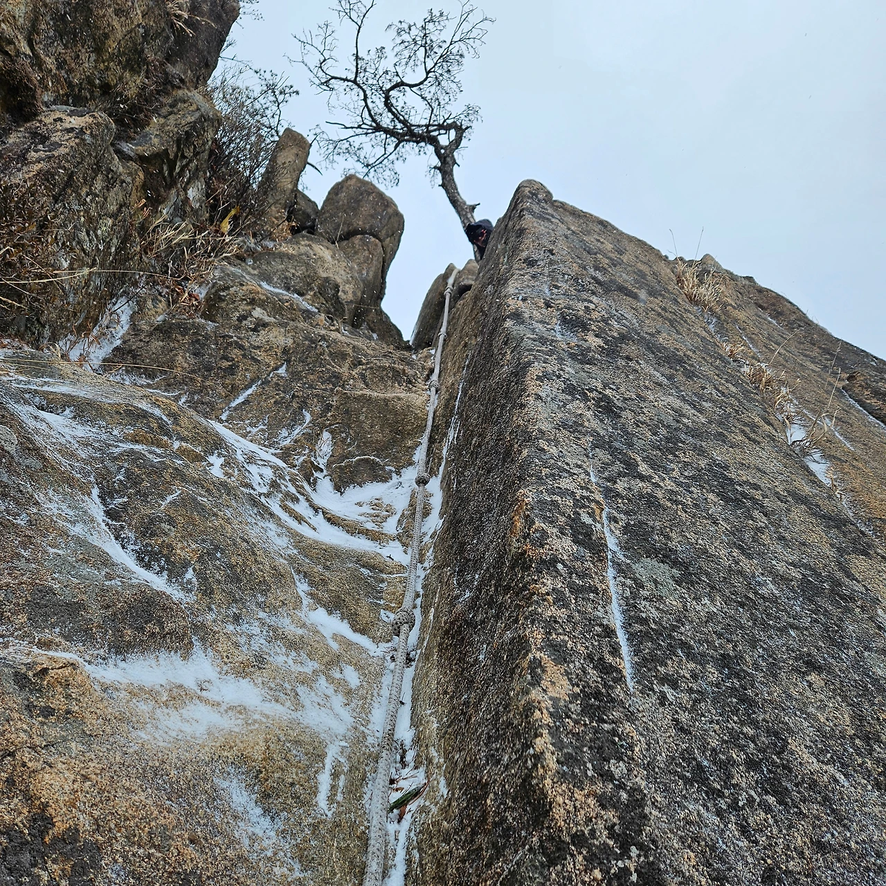 암릉지대에 들어선 후 우리는 어드벤처 한 하루를 보냈다. 암릉지대가 그저 그렇다고 보면 안 된다. 겨울의 암릉지대는 위험하였다. 바위에 있는 눈이 녹으면서 얼음이 되어 바위길은 얼음길이 된 것이다. 밧줄을 잡고 오르고 내린다. 어떤 곳은 밧줄이 연속으로 되어 있고 이동을 하는 것이 어려움이 있었다. 밧줄도 눈과 한 덩이가 되어 있어서 장갑도 이제는 축축하다. 그리고 밧줄은 뻣뻣하다. 미끄러운 밧줄에 매듭이 있어서 미끄러움을 해소할 수 있었다. 암릉지대가 끝나기를 바라지만 1시간 가까이 이동을 하여도 끝이 보이지 않고 밧줄의 연속이다. 여름날이면 재미가 있겠지만 겨울날은 그것이 아니다. 겨울에는 이제 안전을 생각하여야 할 것 같다. 온몸이 노곤할 정도다. 스트레칭이 저절로 된다고 보아야 할 것이다.