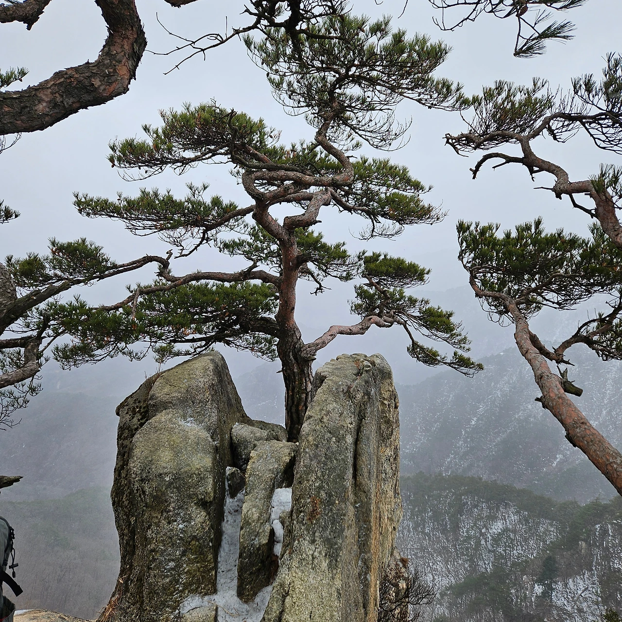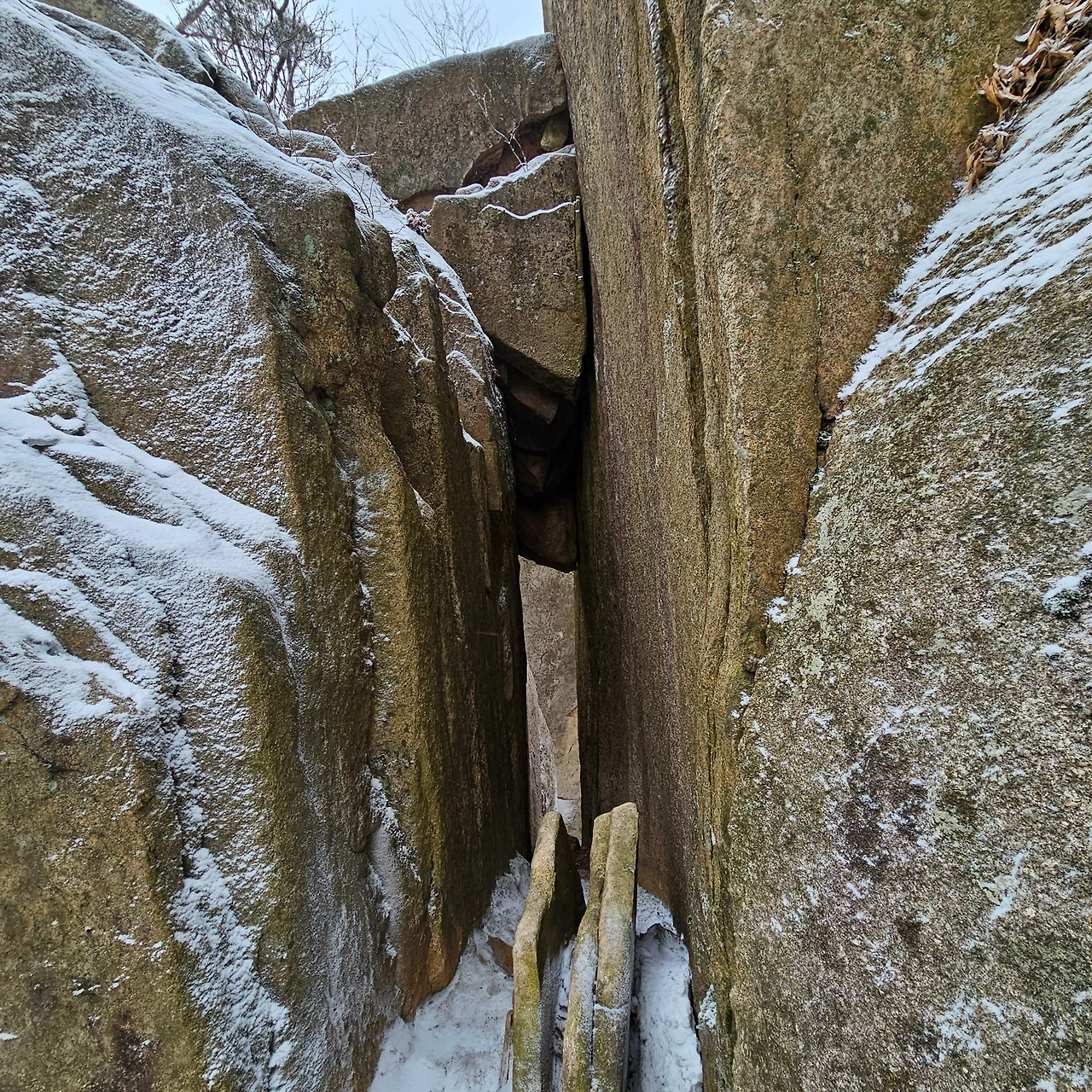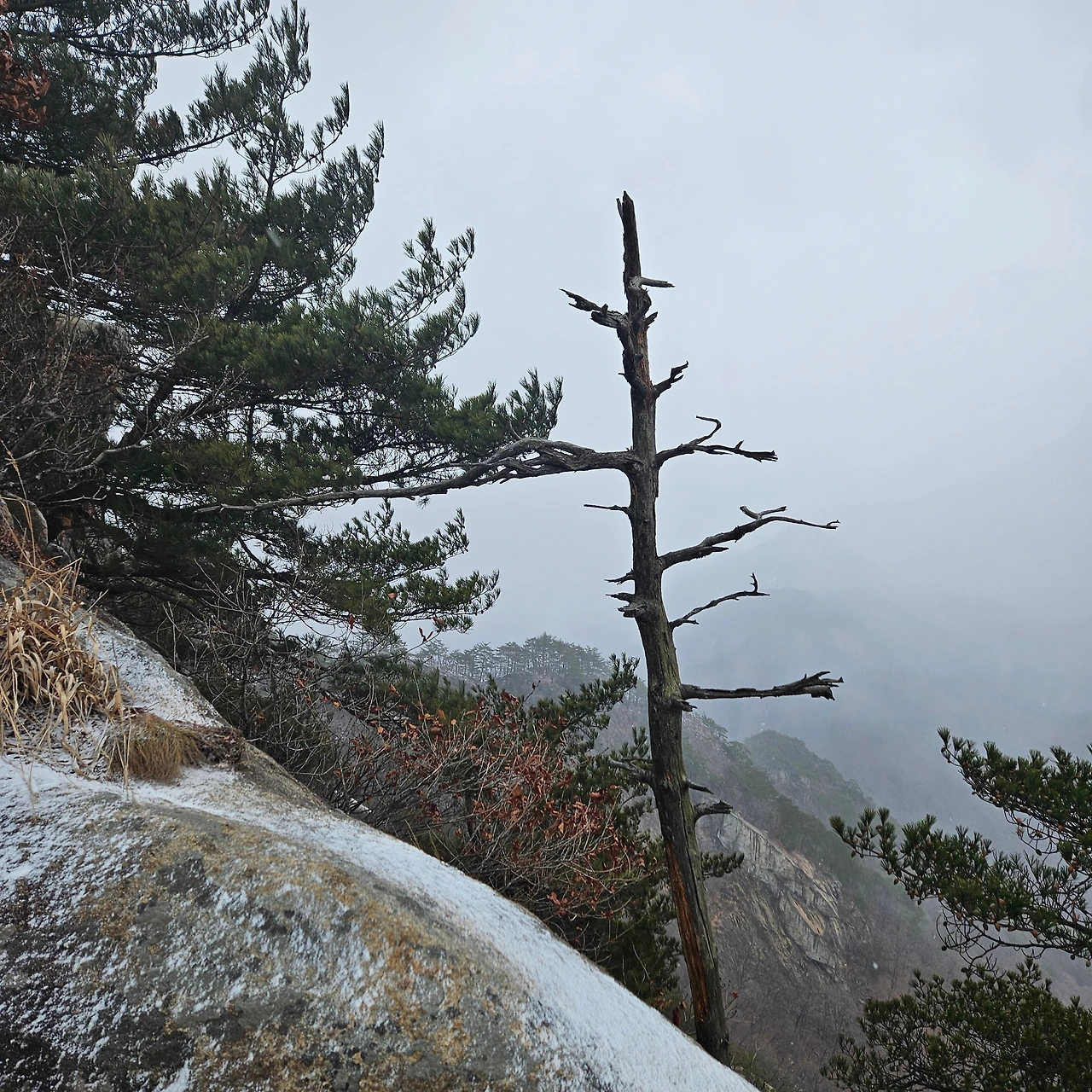 암릉지대에 들어선 후 우리는 어드벤처 한 하루를 보냈다. 암릉지대가 그저 그렇다고 보면 안 된다. 겨울의 암릉지대는 위험하였다. 바위에 있는 눈이 녹으면서 얼음이 되어 바위길은 얼음길이 된 것이다. 밧줄을 잡고 오르고 내린다. 어떤 곳은 밧줄이 연속으로 되어 있고 이동을 하는 것이 어려움이 있었다. 밧줄도 눈과 한 덩이가 되어 있어서 장갑도 이제는 축축하다. 그리고 밧줄은 뻣뻣하다. 미끄러운 밧줄에 매듭이 있어서 미끄러움을 해소할 수 있었다. 암릉지대가 끝나기를 바라지만 1시간 가까이 이동을 하여도 끝이 보이지 않고 밧줄의 연속이다. 여름날이면 재미가 있겠지만 겨울날은 그것이 아니다. 겨울에는 이제 안전을 생각하여야 할 것 같다. 온몸이 노곤할 정도다. 스트레칭이 저절로 된다고 보아야 할 것이다.
