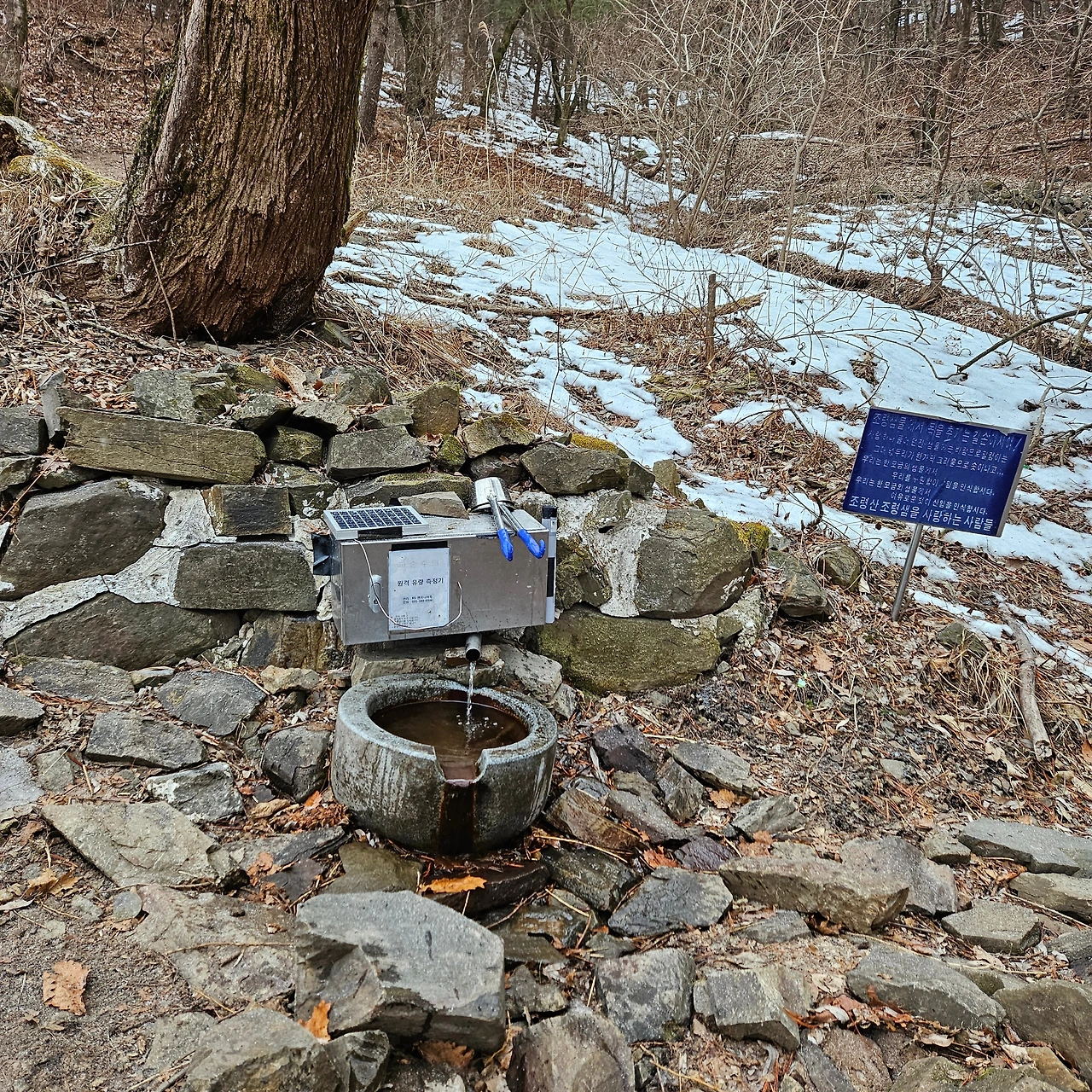 우리는 빨리 가고픈 생각으로 바로 가파른 길을 가면서 등산을 하는 모드로 들어섰다. 헬기장을 지나면서 얼음이 있어 어려움이 시작되었다. 햇빛이 있는 쪽은 눈이 완전히 녹아서 아무것도 없지만 음지는 눈이 녹아서 얼음이 된 것이다. 아이젠을 지인이 착용하였으나 나는 그냥 걸어본다. 조령산을 오르기 전까지 그대로 가볼 생각이었다. 갈림길을 지나 조령샘을 지나면서부터 일기예보에서 알려준 것과 같이 눈이 오기 시작한다. 조령샘에서 물맛을 보고 산을 오른다.