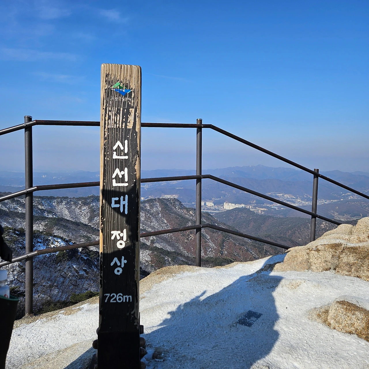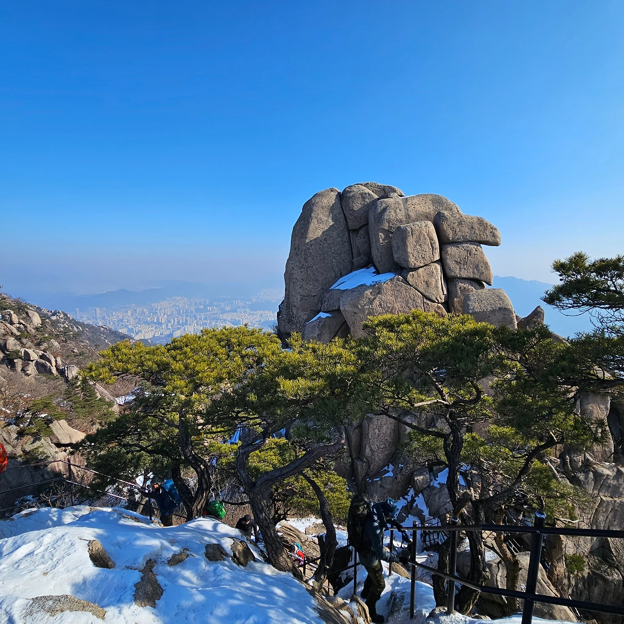 신선대 정상이 여느 때 보다 한산하다. 오늘은 그렇게 춥지 않았지만 북극 추위가 계속되어서 그런지 사람들이 산행을 많이 하지 않았다고 보아야 할 것이다. 미세먼지가 산아래는 그득하다. 도시가 잘 보이지 않는다. 그래도 북한산의 백운대, 인수봉은 그대로 보여서 그것을 배경으로 인증샷을 남긴다.