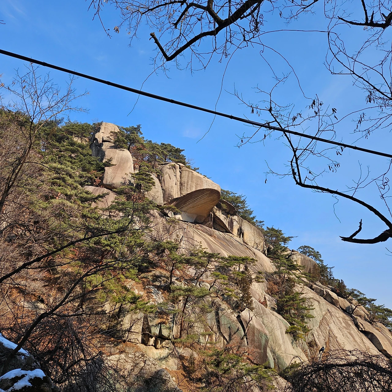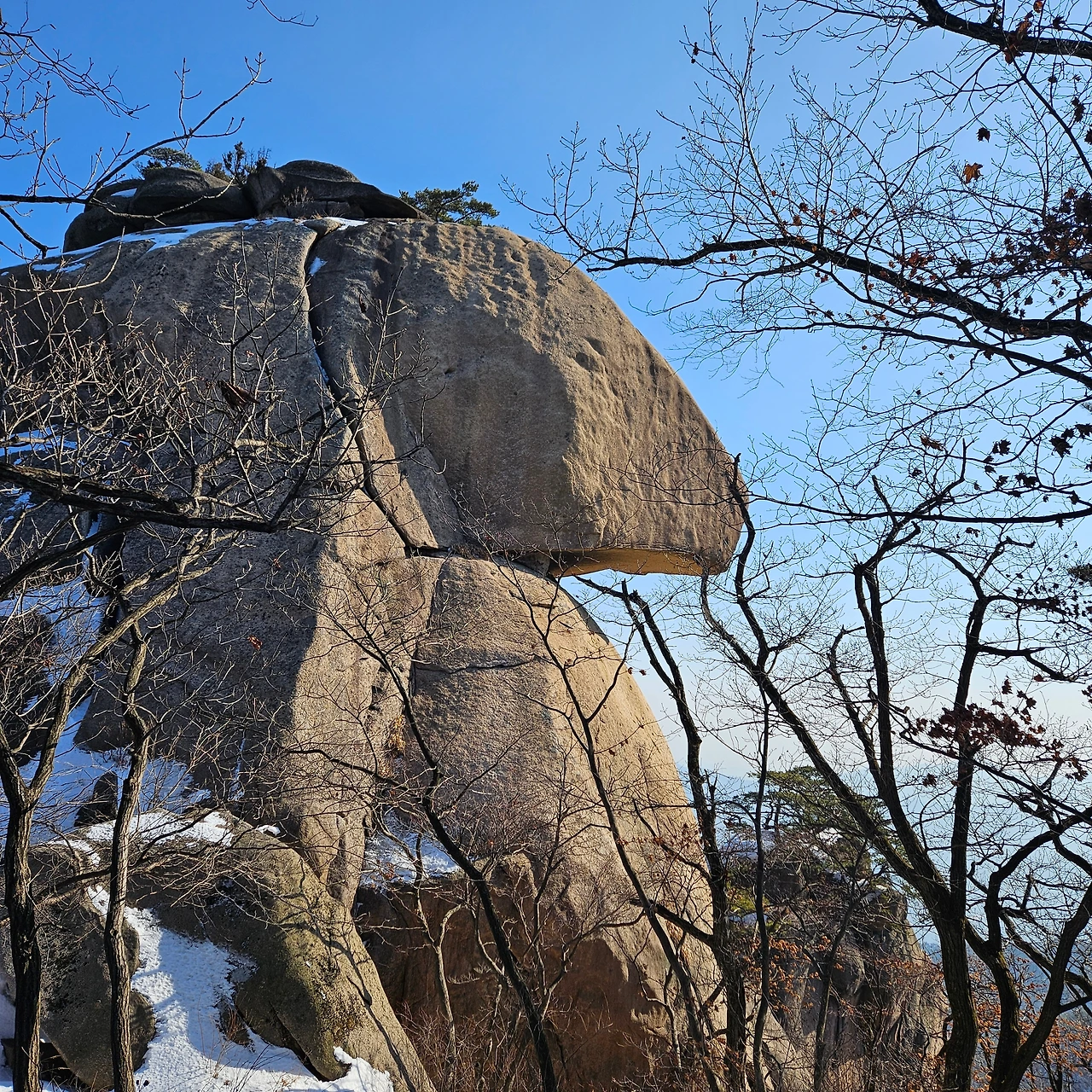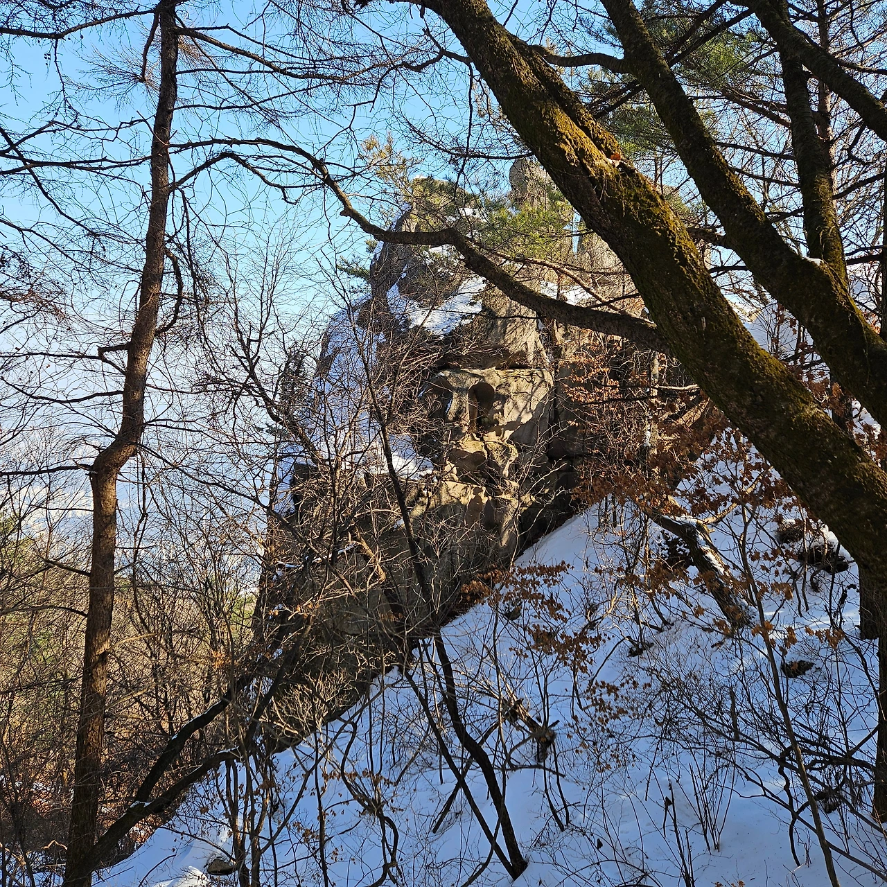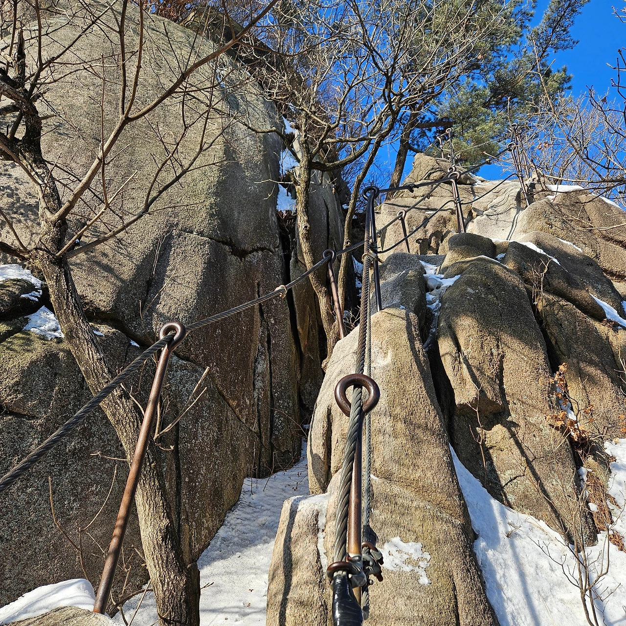 도봉산에는 많은 능선이 있다. 기본적으로 도봉주능선, 보문능선, 다락능선, 포대능선이 있다. 그중 가장 힘든 곳이 다락능선이라 한다. 그 길을 오늘 선택한 것이다. 도봉산에서 가장 어렵다는 코스를 선택한 것이다. 겨울산을 보면서 암릉의 묘미를 즐기겠다는 설계다. 다락능선을 오르면서 느끼는 것은 도봉산이 어려운 산이라는 것이다. 밧줄을 잡고 오르면서 안전시설의 중요시설을 인식한다. 그리고 곳곳에 있는 숨은 그림 찾기 같은 다양한 바위를 감상을 한다.