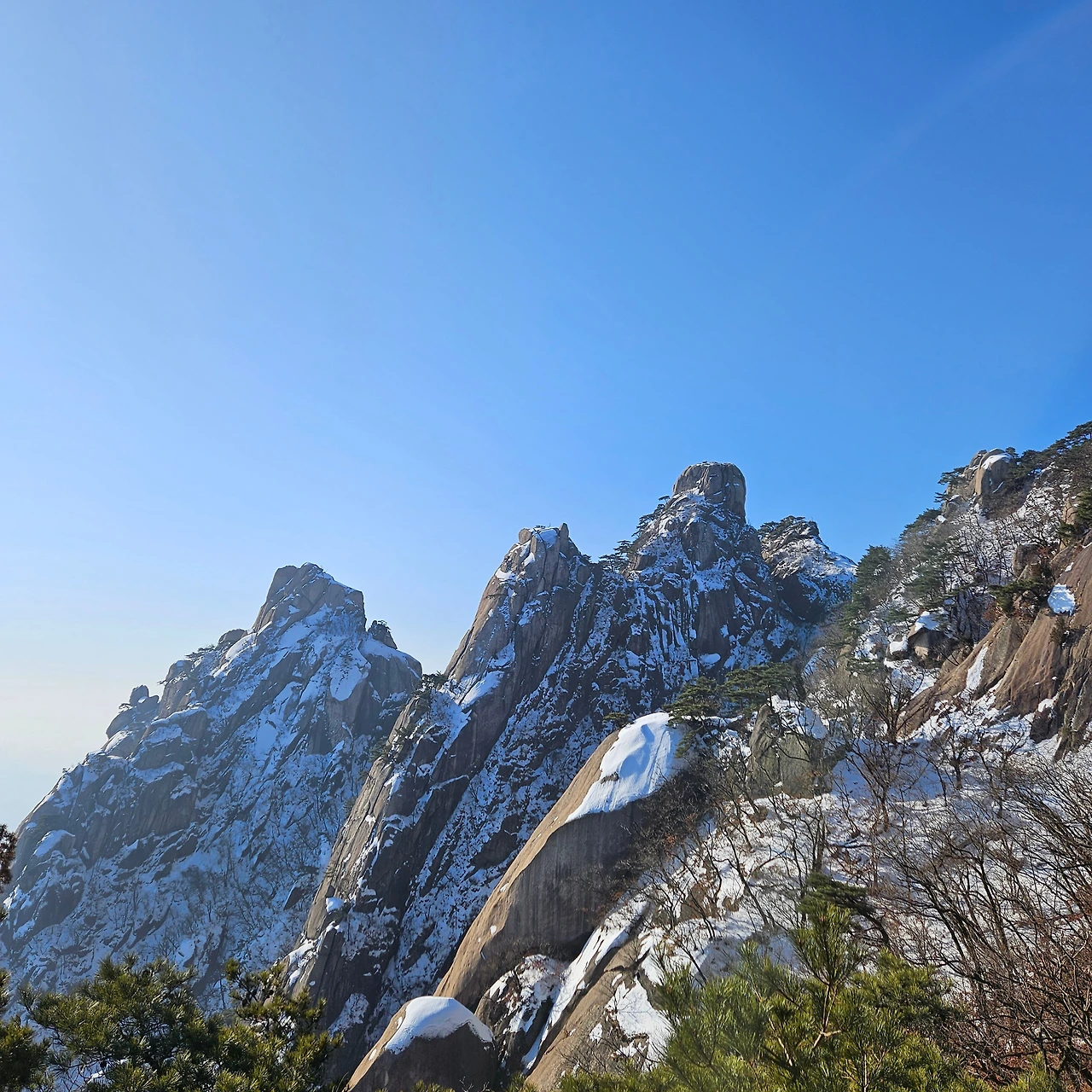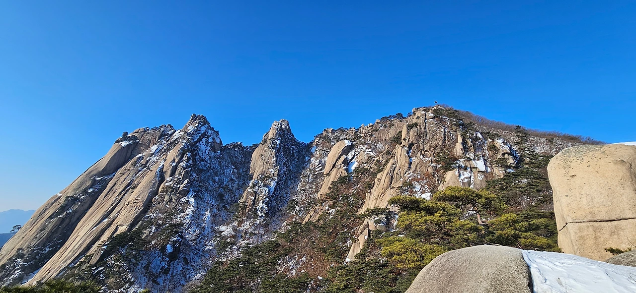 포대 정상을 가기 전에 신선대, 선인봉, 만장봉, 자운봉이 한눈에 들어오는 곳이 있다. 그곳에서 그것을 담고 포대정상에 올라서서 올라온 길을 돌아보고 포대능선을 바라다본 후 Y계곡으로 방향을 잡는다. 우리를 앞서있던 젊은 부부가 Y계곡의 위험을 알리는 경고판을 보고 우회길로 들어설 것인지 고민을 하다가 우리가 가는 것을 보고 용기를 내어 쫓아 온다. 우리는 내려만 가면 오를 수 있다고 이야기하면서 내려선다. 처음에는 아이젠이 불편하였는데 오를 때 얼음이 있어 유리하다. Y계곡 곳곳에 얼음이 있어 그 얼음에 아이젠을 이용하는 것이다.