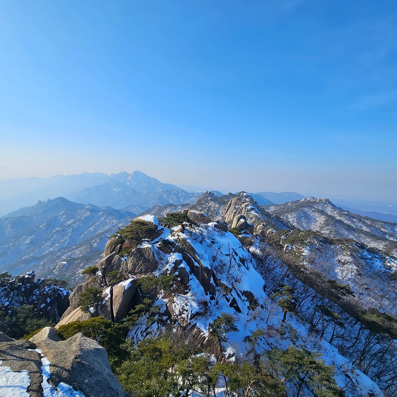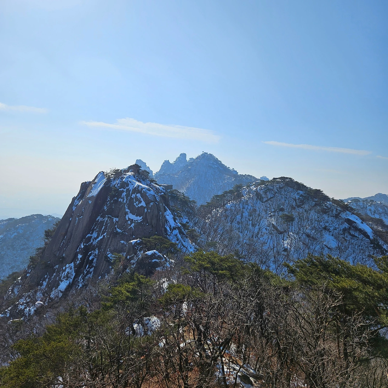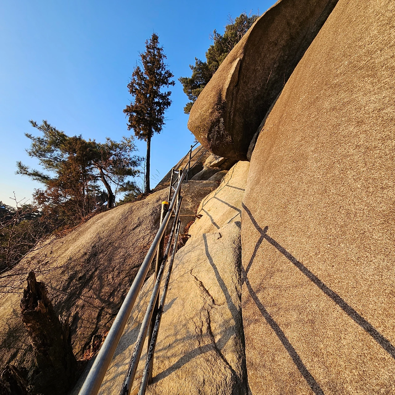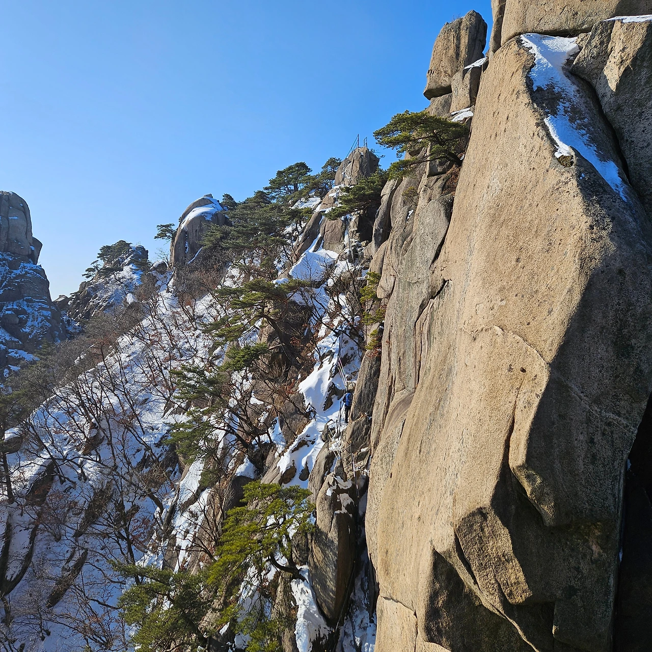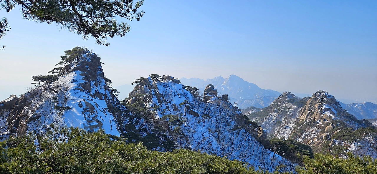 Y계곡을 지나고 벼랑길은 바람이 세다. 양쪽에 안전철책이 없다면 못 지나갈 것이다. 내가 그곳을 지날 수 있는 것은 안전철책이 있기 때문이다. 그리고 여유를 부릴 수 있는 것이다. 안전을 위한 한계선을 만들어 놓은 것이다. 신선대를 바로 앞에 두고 신선대를 조망할 수 있는 바위 위에 서서 신선대와 북한산을 동시에 담아 본다. 이곳에서 추위가 없을 때는 국립공원공단에서 일방통행을 위하여 통제를 하는데 오늘은 없다. Y계곡은 주말이나 공휴일에는 붐비기 때문에 포대정상에서 자운봉 방향으로만 이동을 할 수 있다. Y계곡을 반대편에 담아본다. 그곳을 넘는 사람은 그것을 넘었다는 성취감과 안도감을 갖고 있다. 나도 그랬다.
