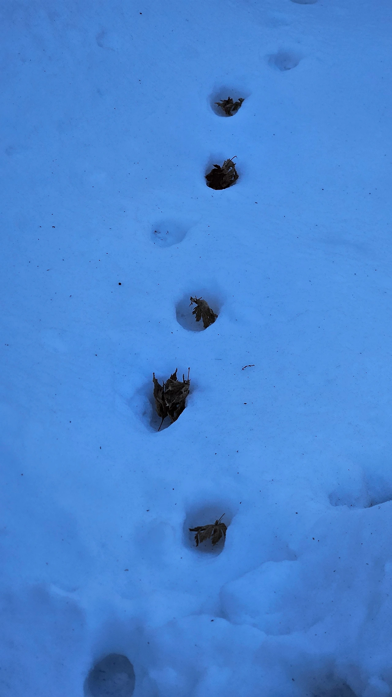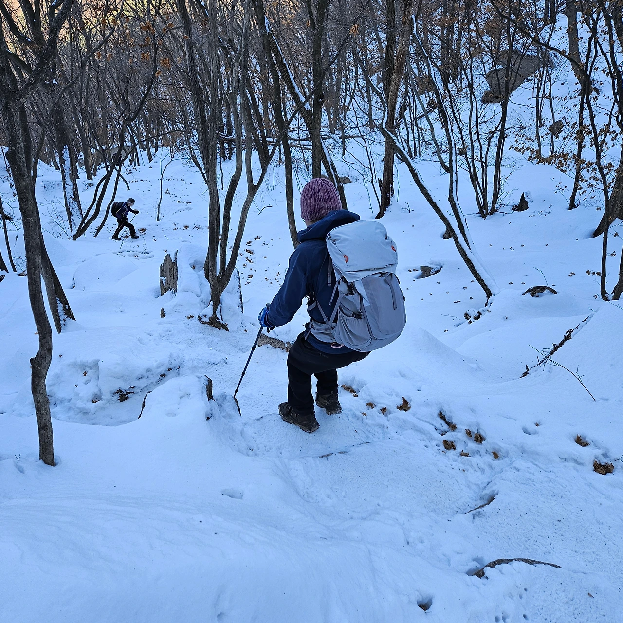 이제는 하산을 하여야 한다. Y계곡을 우회하여 아래로 내려가는 길이 있다. 그 길은 눈이 그득하다. 겨울산을 그대로 하산을 하면서 겨울산의 정취를 만끽한다. 동물이 지나간 자리에 낙엽이 하나씩 들어 있다. 문인인 J가 붕어빵 기계의 앙금을 넣는 것 같다고 하였다. 우회로는 포대능선을 오르는 오르막을 지나서 만난다.