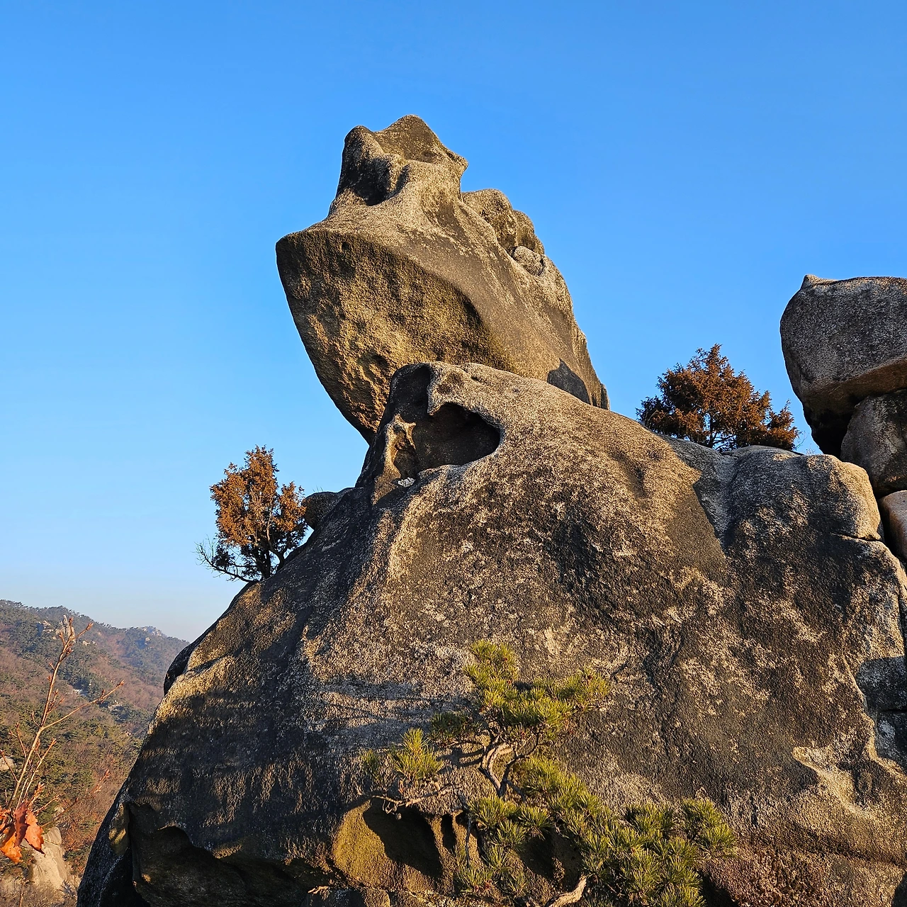 이곳에서 송추 쪽으로 등산로를 조금 벗어나면 물개바위가 있다. J가 말하기를 북극 근처에서 사는 물개 같다고 한다. 그만큼 크다. 그리고 내려간다. 원도봉을 지나고 망월사로 가는 갈림길 바로 전에 조망의 명소가 있다 이곳에서 도봉산 전체를 조망을 하고 산불감시초소로 이동을 하고 다시 한번 도봉산을 조망을 한다. 그리고 바로 아래에 있는 해골바위로 간다. 여름이면 거의 보이지 않고 낙엽이 떨어진 후 잘 보인다. 그것을 보고 바로 내려가면 어려운 절벽구간이 있어 우리는 망월사를 거쳐 하산한다.
