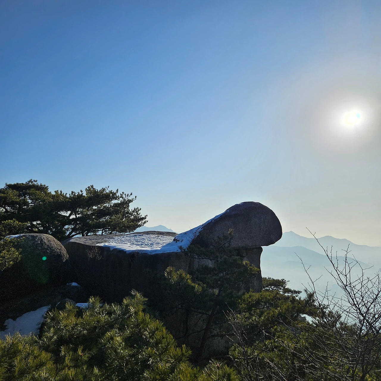 헬기장이다. 이곳에서 여름이면 너도나도 앉아서 단체로 식사를 하는 곳인데 겨울이라서 눈이 그득하다. 햇빛이 비추는 각도에 따라서 눈이 녹는 것이 차이가 있다. 햇빛이 그대로 내려다보고 있지만 평지는 그렇게 눈이 빨리 녹지 않는다. 비탈면이 먼저 녹는다. 그 이유가 궁금하여 chatGPT에게 물어보니 "경사면은 평평한 표면에 비해 직사광선을 더 많이 받는 경우가 많다. 햇빛은 열의 형태로 에너지를 제공하므로 눈을 녹이는 데 중요한 요소이다. 경사 각도와 태양을 기준으로 한 방향은 받는 햇빛의 양에 영향을 줄 수 있다"라고 답변을 한다. 결론적으로 직사광선을 더 많이 받기 때문이다.
