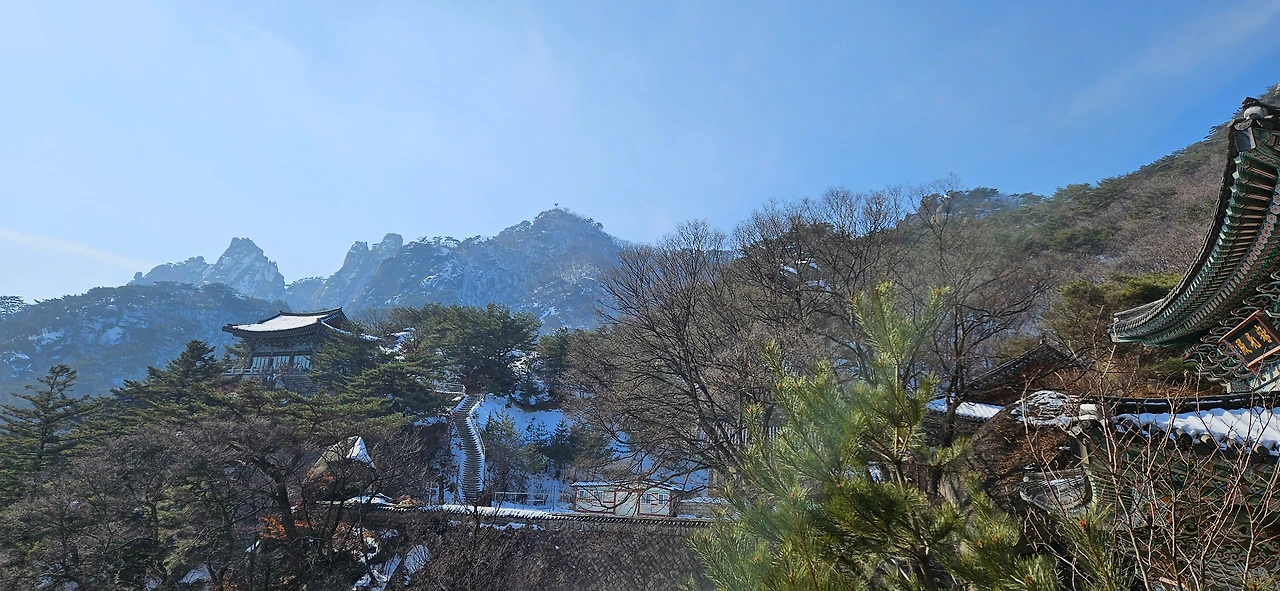건물들은 아래에 있는 건물 위에 설치되어 있다. 아래는 창고나 다양한 시설로 운영이 되고 위층은 정각으로 운영이 되고 있었다. 사찰아래는 스님들이 부지런히 눈이 오면 눈을 쓸어 눈이 없었으나, 조금 내려오니 스님들의 한계선을 넘어서서 그런지 얼음이다. 돌로 쌓은 계단이라서 미끄럼 방지 턱이 있는 것처럼 돌 들이 미끄럼을 방지하고 있어 그대로 내려온다. 편안하게 내려오는 사람들은 아이젠을 하고 내려온다.