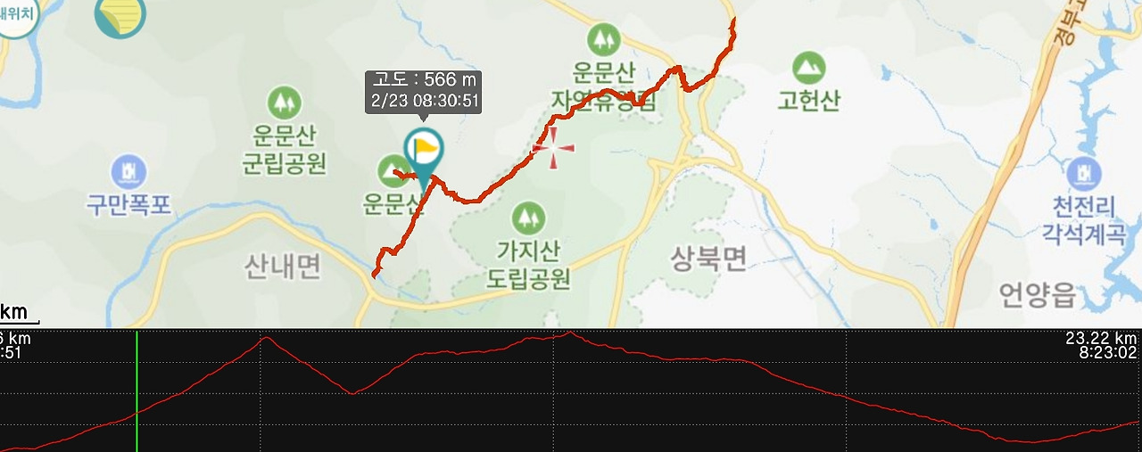 버스정류장 옆 음식점 주인이 드디어 우리에게 왔다. 그리고 우리를 불러서 음식점 앞의 자동차로 안내한다. 그리고 우리를 자동차에 탑승시키고 언양의 버스가 많이 오는 곳으로 데려다준다. 그리고 콜이 오지 않는 이유를 설명을 한다. 어제 눈이 와서 많은 사람들이 이곳에서 밤을 새웠다고 하였다. 우리는 감사를 하고 추후 이곳을 왔을 때 이 집에서 반드시 한 끼를 해결하겠다고 약속을 하였다. 그렇게 음식점 주인의 호의로 우리는 무사히 언양으로 내려왔고 그곳에서 밀양에 세워둔 승용차를 회수하기 위하여 카카오 택시를 콜 하니 온다. 높은 곳에서 콜 할 때 오지 않았는데... 아쉽다.