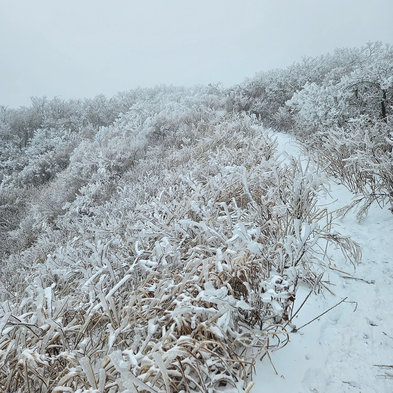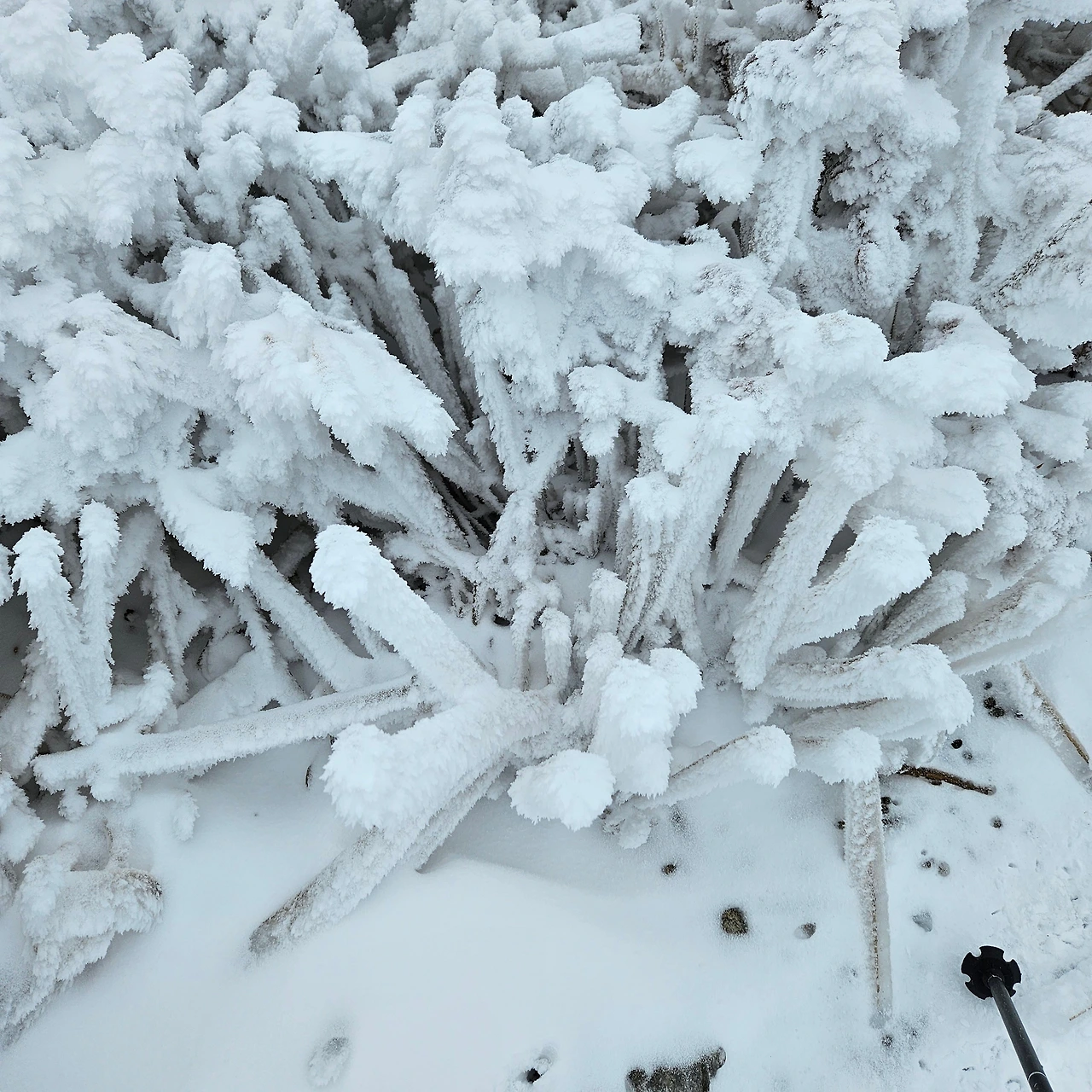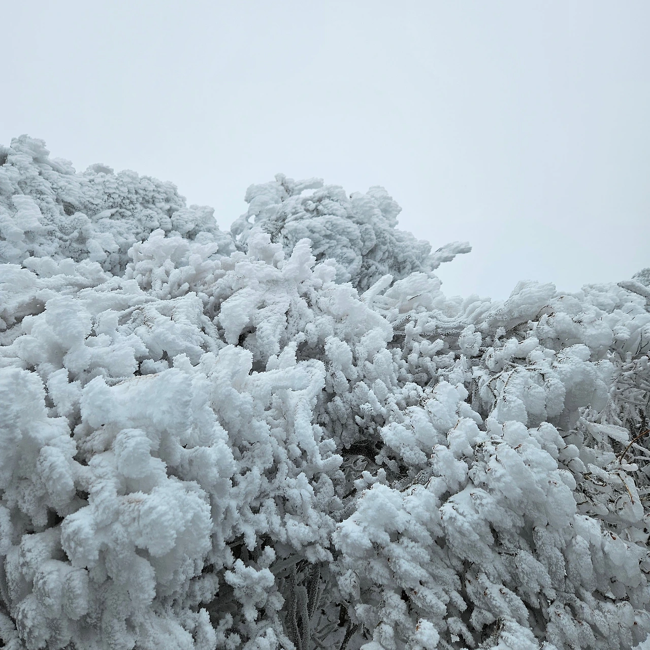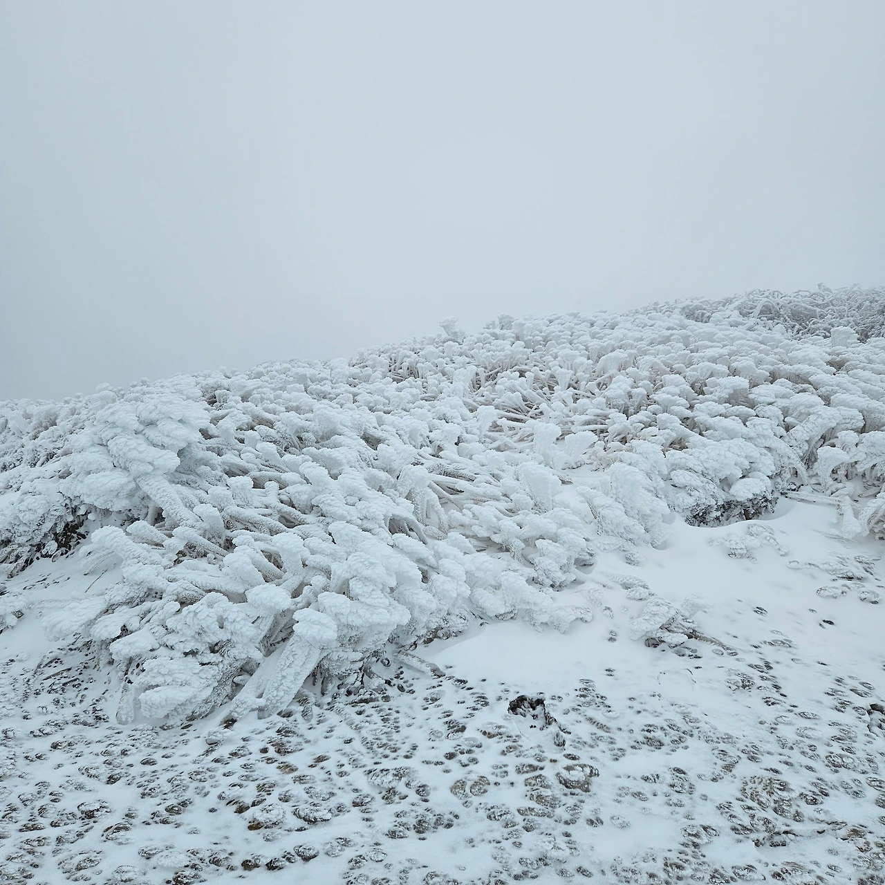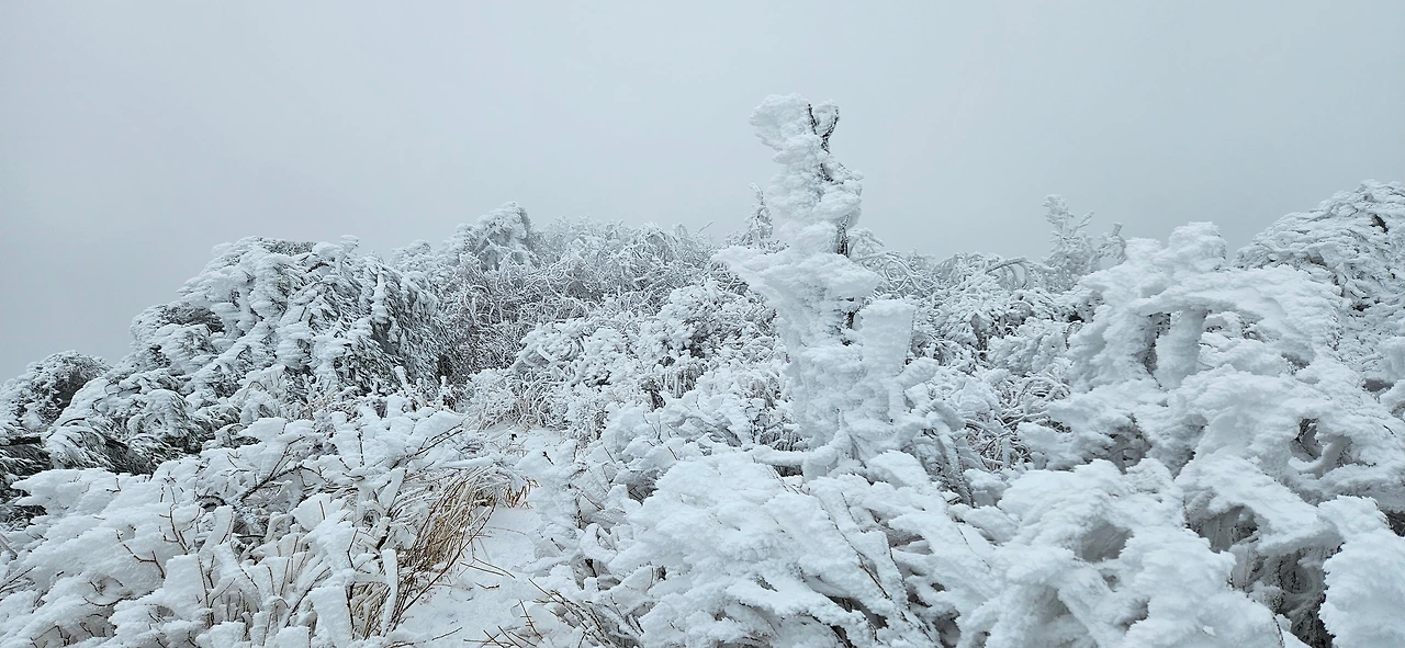 오늘의 원대한 꿈을 위하여 빠르게 운문산을 갔다 와야 한다는 욕심이 앞서서 그런지 갑자기 체력이 떨어지기 시작한다. 오버페이스를 한 것이다. 그래도 내가 산을 오르고 내린 지 10년이 넘었는데 포기할 수는 없다. 천천히 10분 정도 여유를 갖고서 다시 오른다. 상고대를 즐기면서 휴식을 하고 오른다. 겸손할 수밖에 없는 곳에서는 겸손하게 지나간다. 겸손하지 않으면 겸손하라고 응징을 받는다. 상고대 터널이 있고 상고대가 너무 많아서 나뭇가지가 부러진 것도 보았으며, 상고대가 다양한 모습을 연출한 것도 보았다.