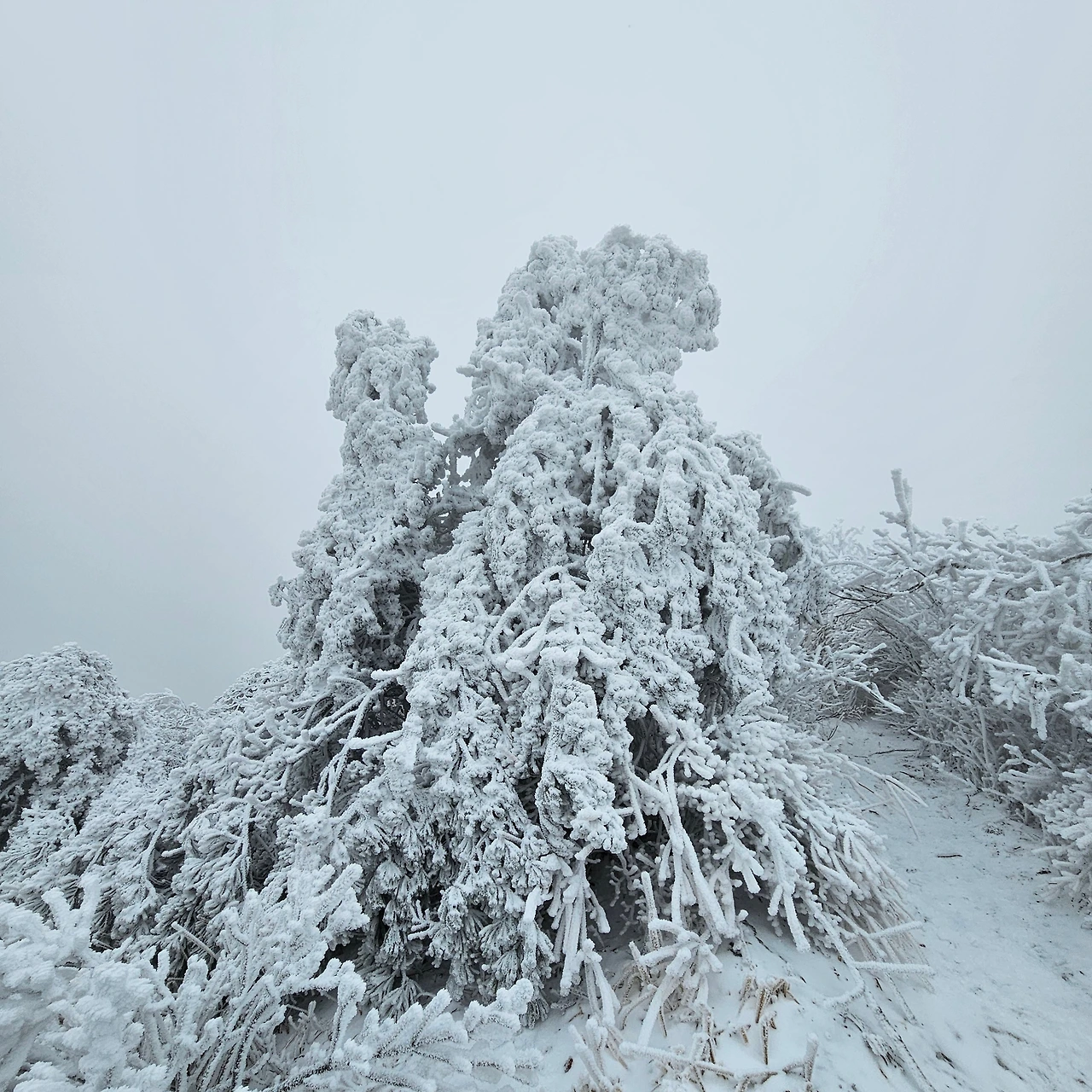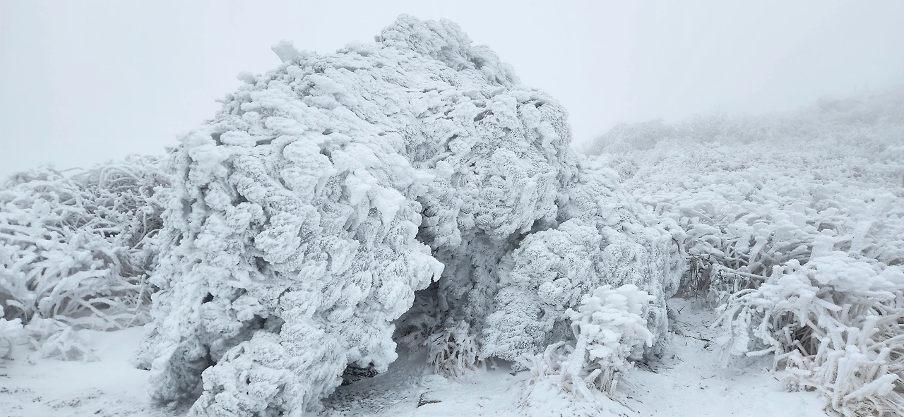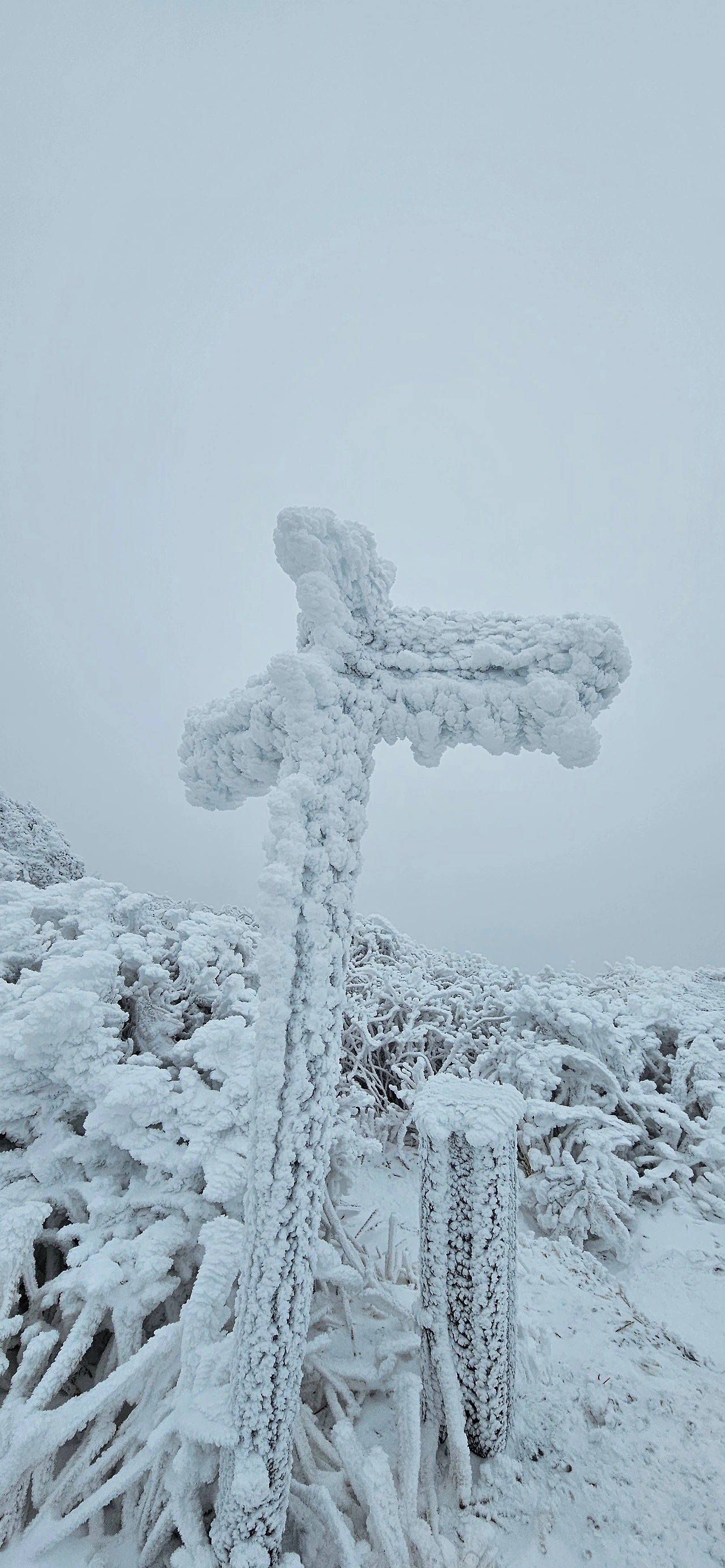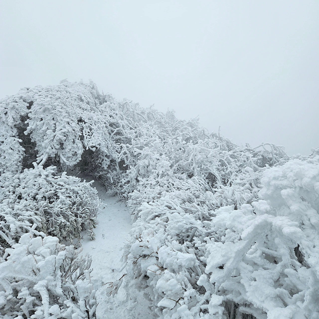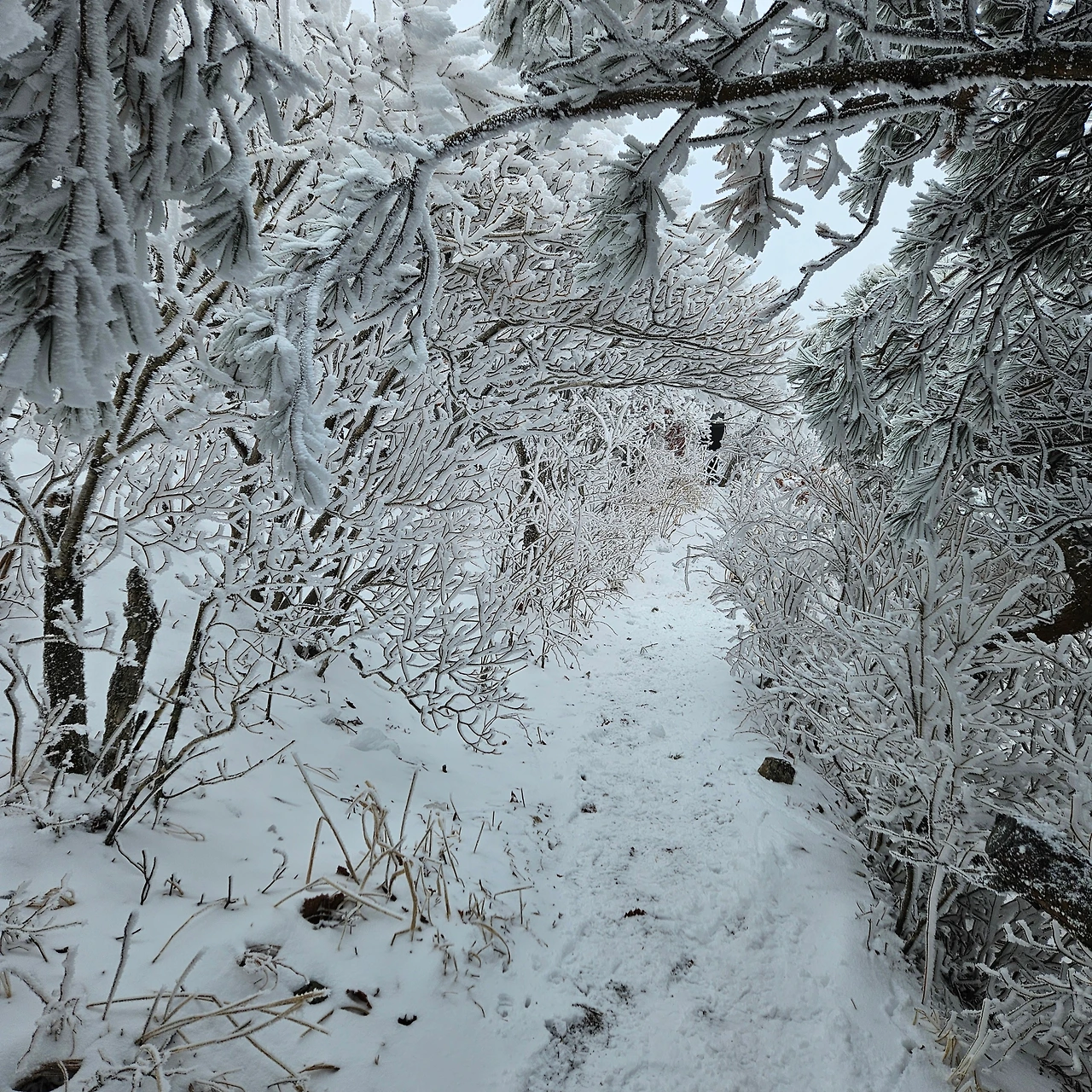 오늘의 원대한 꿈을 위하여 빠르게 운문산을 갔다 와야 한다는 욕심이 앞서서 그런지 갑자기 체력이 떨어지기 시작한다. 오버페이스를 한 것이다. 그래도 내가 산을 오르고 내린 지 10년이 넘었는데 포기할 수는 없다. 천천히 10분 정도 여유를 갖고서 다시 오른다. 상고대를 즐기면서 휴식을 하고 오른다. 겸손할 수밖에 없는 곳에서는 겸손하게 지나간다. 겸손하지 않으면 겸손하라고 응징을 받는다. 상고대 터널이 있고 상고대가 너무 많아서 나뭇가지가 부러진 것도 보았으며, 상고대가 다양한 모습을 연출한 것도 보았다.