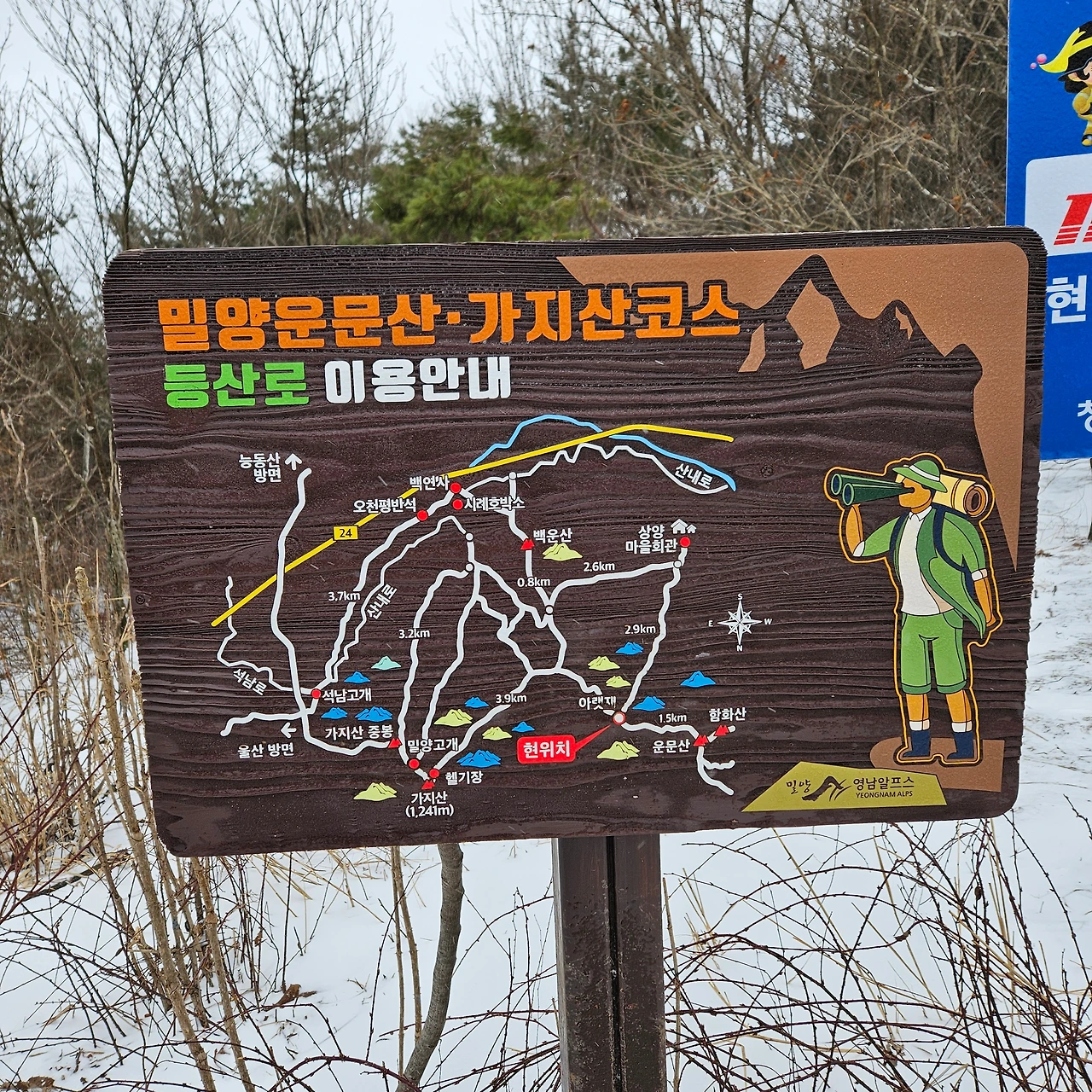 2024년 영남알프스를 두 번째 경험하기로 하였다. 이른 아침에 출발을 하고 밀양시 남명리 임시주차장을 찾았지만 이른 아침이라 아직 열리지 않아서 근처의 공터에 자동차를 주차시키고 이동한다. 오늘의 꿈은 이렇다. 운문산을 오르고 다음으로 가지산을 갔다가 걸어서 고현산까지 가보자는 것이다. 하루에 3 산을 경험하자는 것이다. 겨울산을 우습게 본 것이 우리들이다. 신발은 아이젠을 착용하고 있어서 평소보다 100g 이상 더 무겁다. 그리고 오르면서 겨울산의 경치가 우리를 불러 세워서 그것에 호응을 하여야 한다는 사실을 간과하였다. 그 결과는 마지막 산을 오르지 못하고 다음으로 미뤘다. 시간이 부족하였고 체력이 바닥난 것이다. 의지의 한국인이라고 하면서 오를 수도 있지만 우리는 마지막은 다음으로...