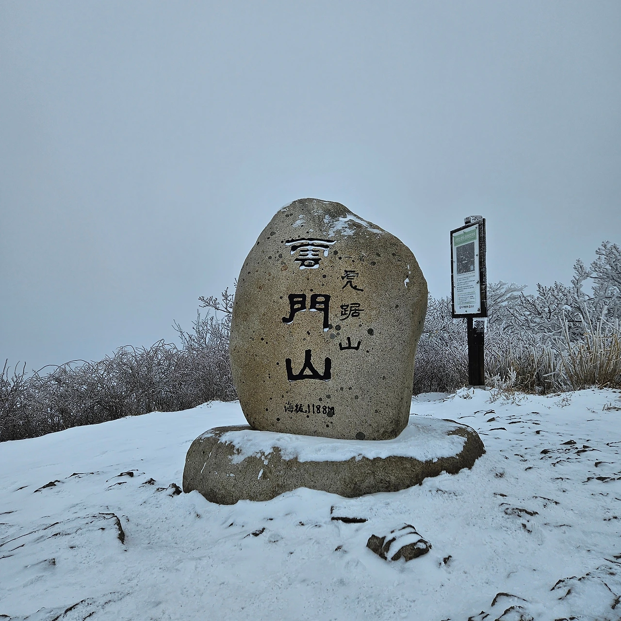 운문산 정상에 도착하기 전에 데크를 따라 걸어 올라가니 그곳이 겨울세상이다. 2월의 마지막 주에 이제는 겨울이 물러나야 하지만, 폭설이 오고 찬바람이 불고 하여서 그런지 덕유산 정상 등에 일부러 상고대를 보러 갔는데 그것과 유사하다. 다만, 하늘이 맑지 않아서 상고대만 보일 뿐이다. 머리에 흰 눈을 쓰고 있지만 운문산이라는 정상석이 두 곳에 자리 잡고 있다. 옛것도 담고 최근의 것도 담는다. 이른 아침이라 그렇게 많은 사람이 없어서 조용히 인증을 하고 하산을 한다. 내려오는데 누군가가 반갑게 인사를 한다. 우리가 아랫재에서 만나고 우리가 먼저 정상으로 간 후 천천히 올라오신 분들이 아랫재에서 본 것을 기억 삼아 우리에게 인사를 하면서 벌써 갔다 오냐고 한다. 다만, 올라올 때 보지 못하였던 경치를 다시 한번 보면서 아랫재에까지 내려왔다. 그리고 그 개를 다시 보게 된 것이다.