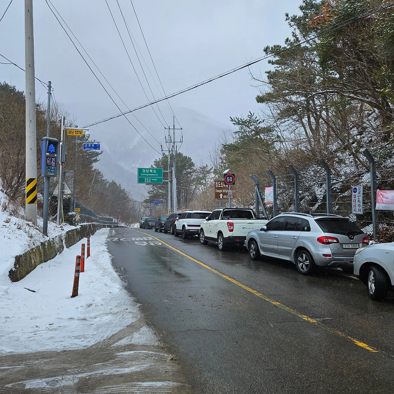 운문령에 도착하기까지 임도로 따라 내려가니 무릎도 보호된다. 사람들이 이길로 걸어서 올라오는 이유를 알 것 같다. 석남사에서 올라오면 힘들겠지만 운문령에서 올라오면 그렇게 힘들이지 않고 가지산을 올라갈 수 있을 것 같다. 운문령 도로 양편으로 승용차들이 가득하다. 운문령에서 산을 타고 넘어가면 되지만 요즈음은 폐쇄되어 있다고 안내되어 있다. 그리고 눈이 가득한 산을 막무가내로 걸어가기에는 어려움이 있어서 포기하고 도로를 따라 하산을 하였다. 하지만 그 길로 들어서서 편안하게 하산을 하였다가 외항만디로 갈 수 있을 것이라고 생각하였는데 거리가 8km 정도 되었다. 하산을 하는 중에 지인은 발에 어려움이 왔다. 신발이 단단히 고정이 되지 않아서라고 하였다. 중간중간에 가는 길을 한 번씩 확인을 하면서 하산을 하였다.
