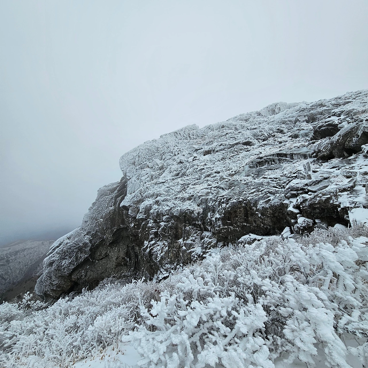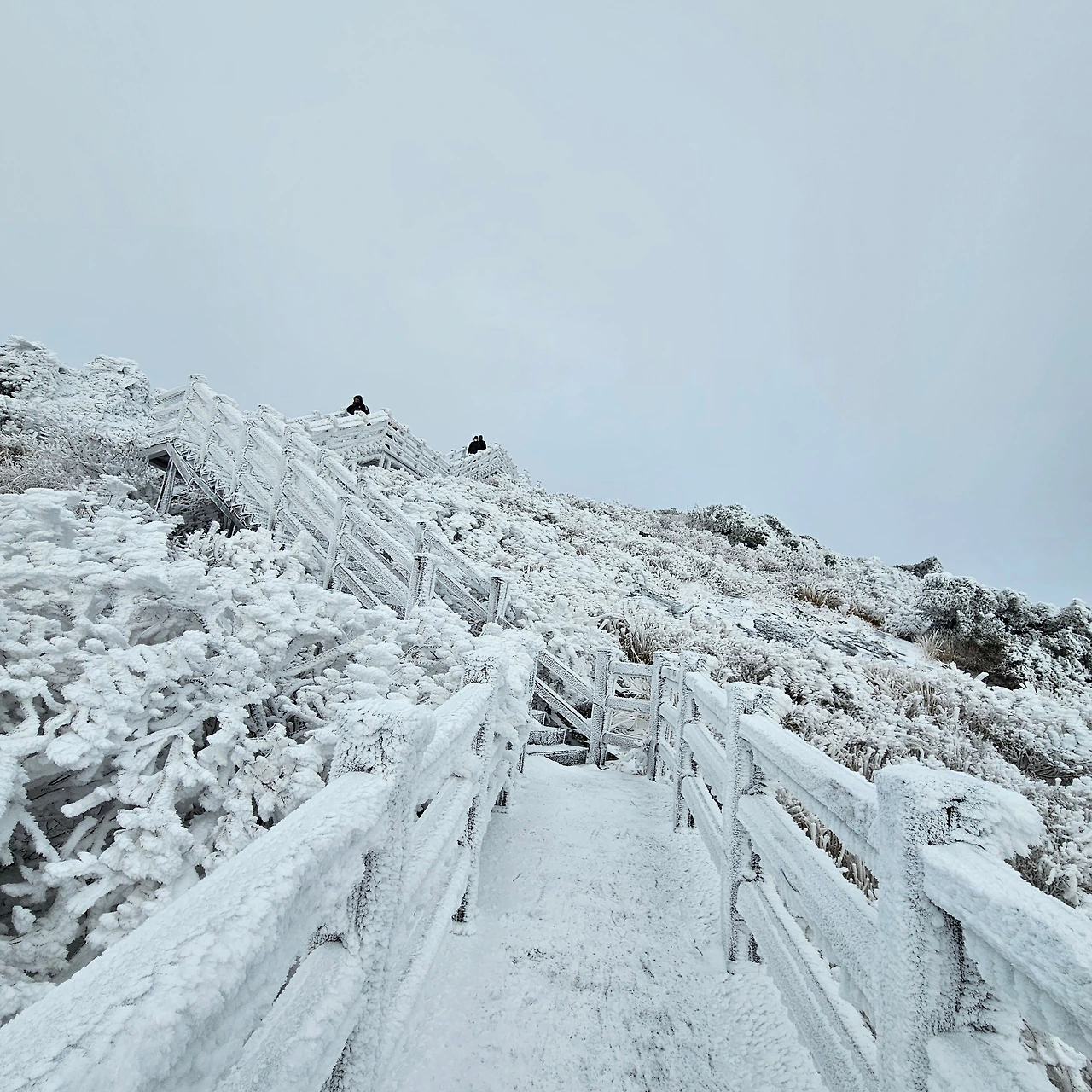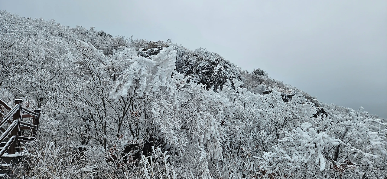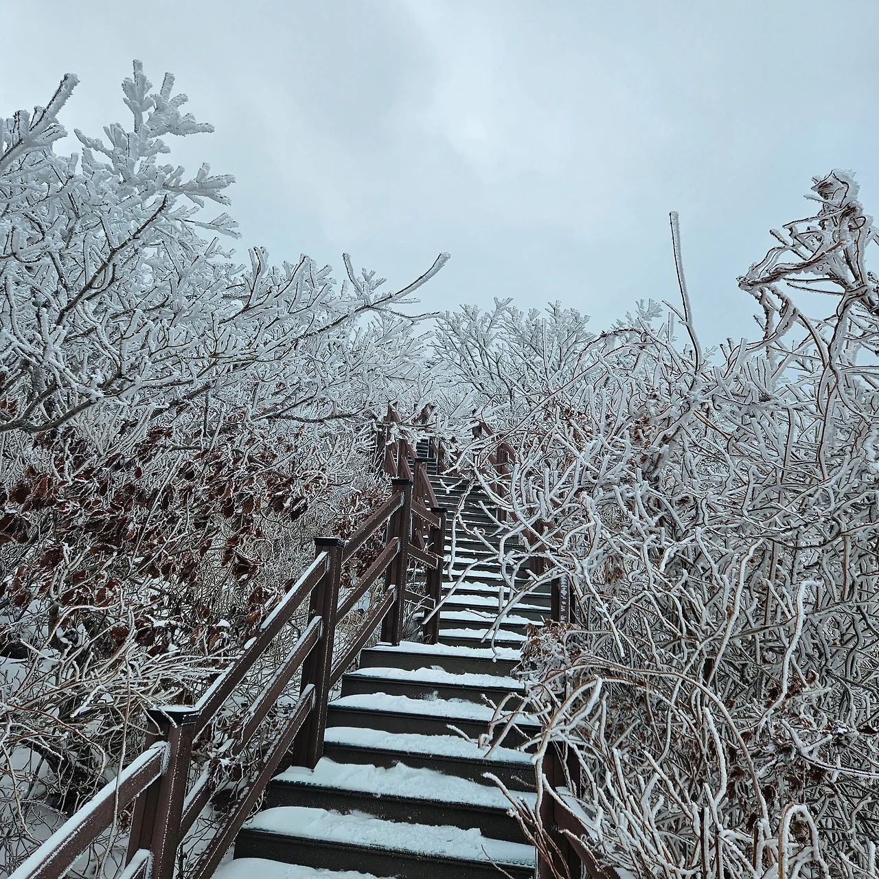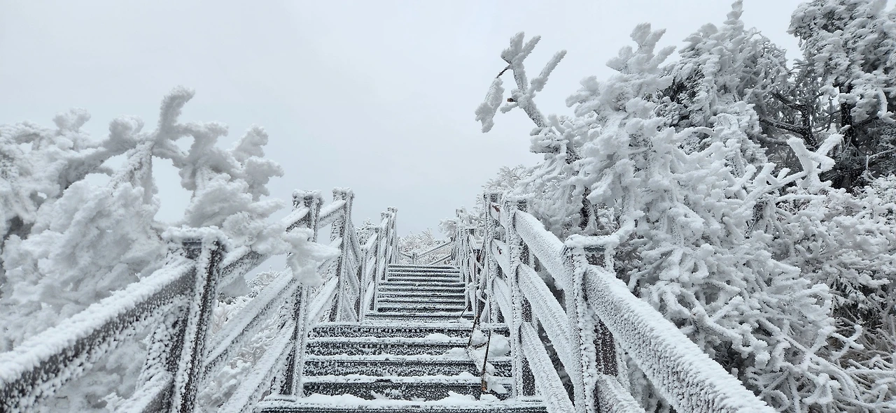 재약산을 오르는 계단에 도착하였다. 1km 남았다는 이정표가 있다. 계단만 1km면 63 빌딩을 오르는 것이다. 그것이 쉽지는 않다. 그래도 규칙적으로 오르기에 힘들면 쉬어가도 되고 아래로 내려다보면서 걷는다. 재약산을 내려올 때 그렇게 길게 느껴졌던 계단이 오늘은 그렇게 힘들게 오른다. 아침에 재약산을 오르는데 벌써 하산하는 사람들이 있다. 얼마나 일찍 시작하였는지 궁금하다. 재약산을 오르면서 가지산을 오를 때 느꼈던 감동을 다시 한번 느껴본다. 얼음과 눈과 바위가 어우러져 있고 나무들이 눈과 얼음으로 새로운 모양을 만들고 있다.