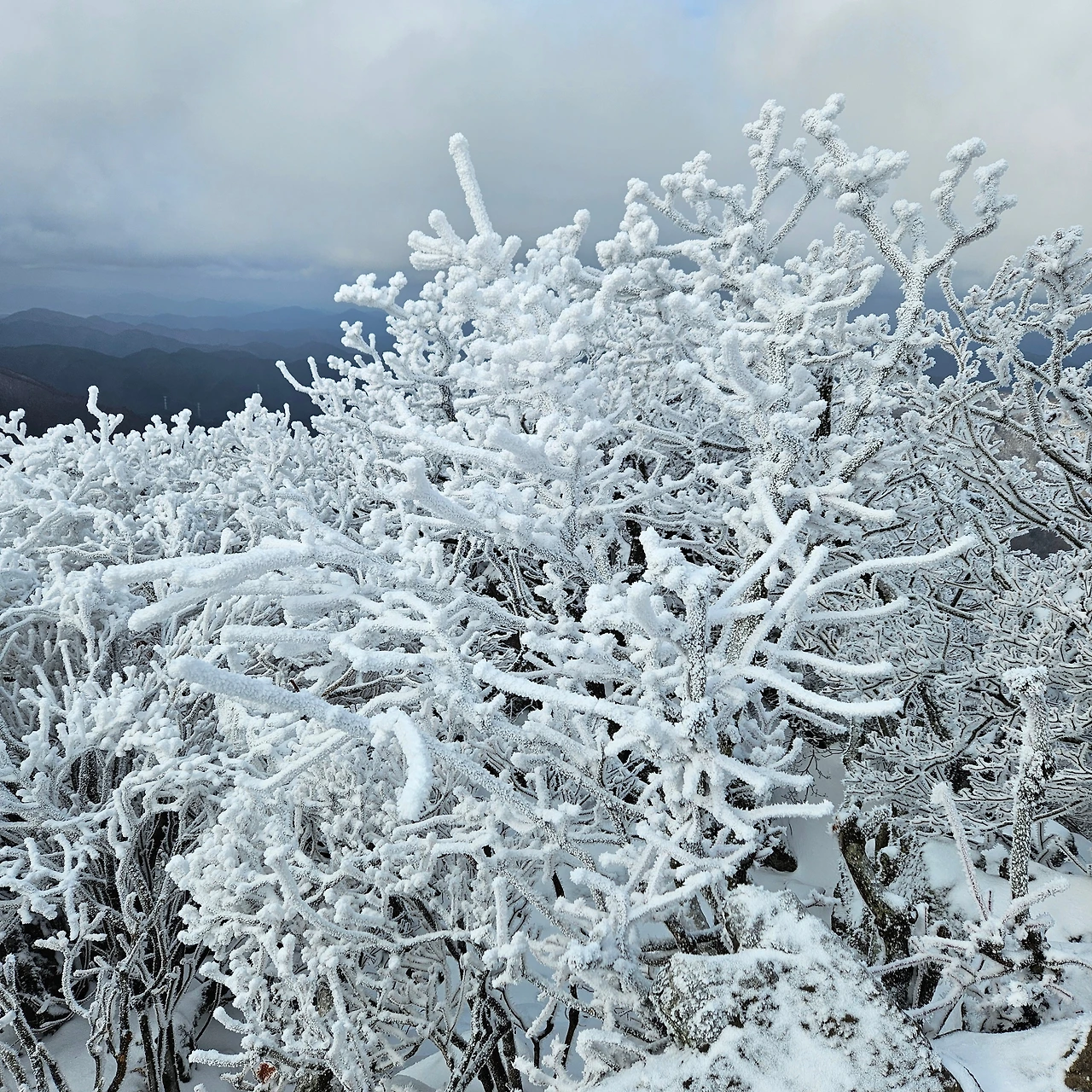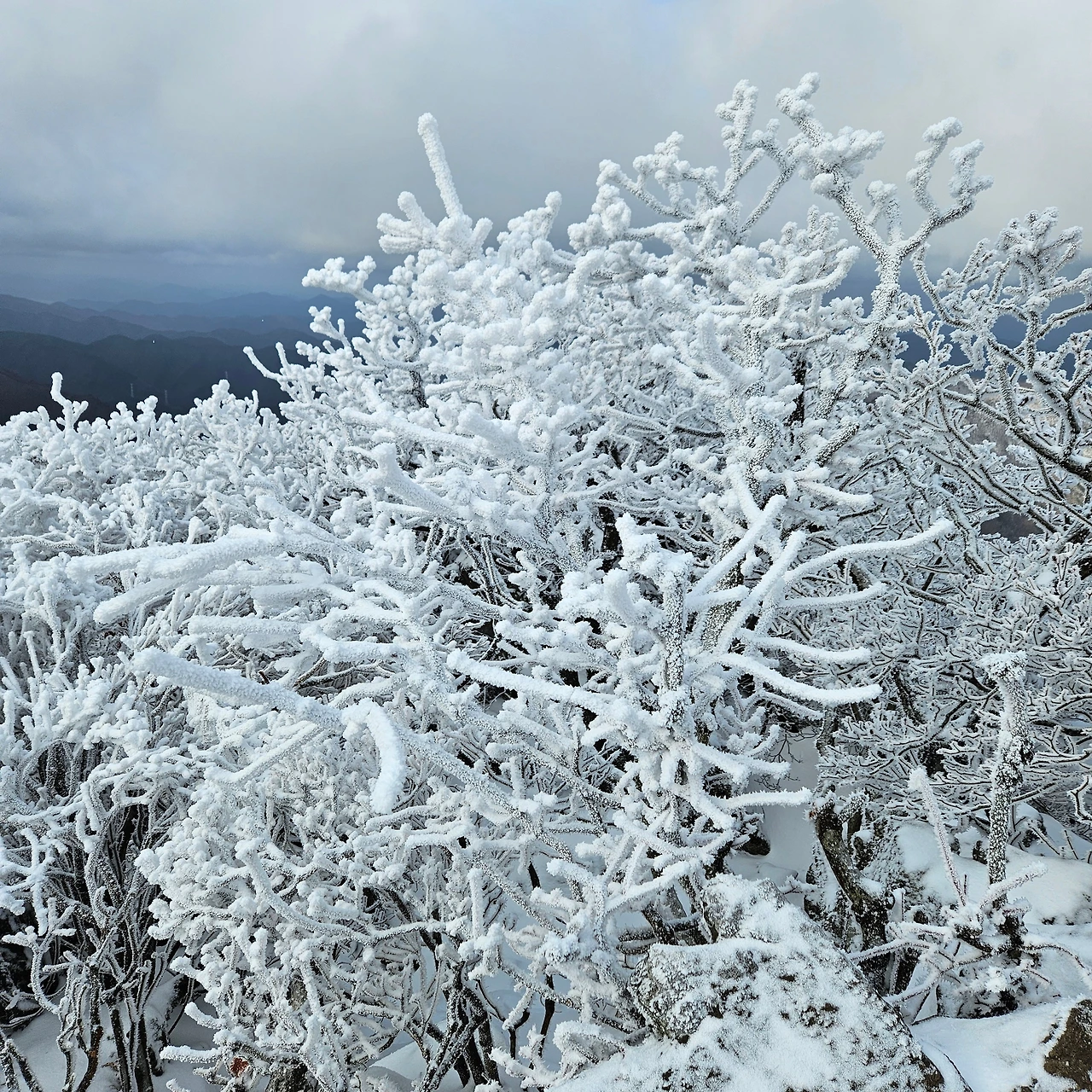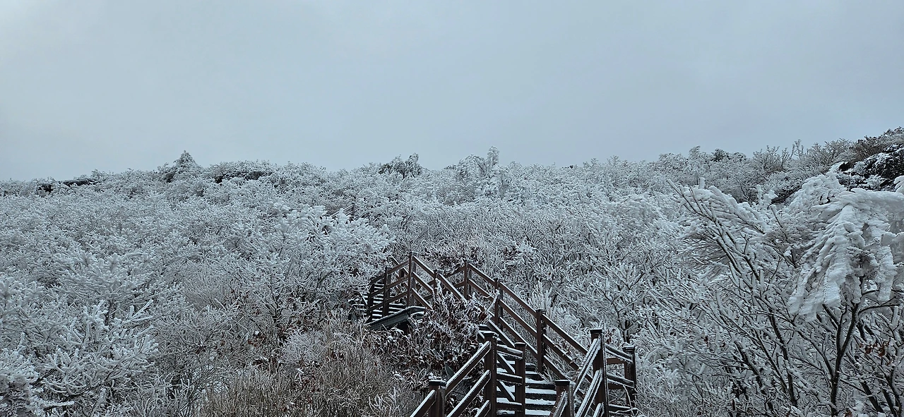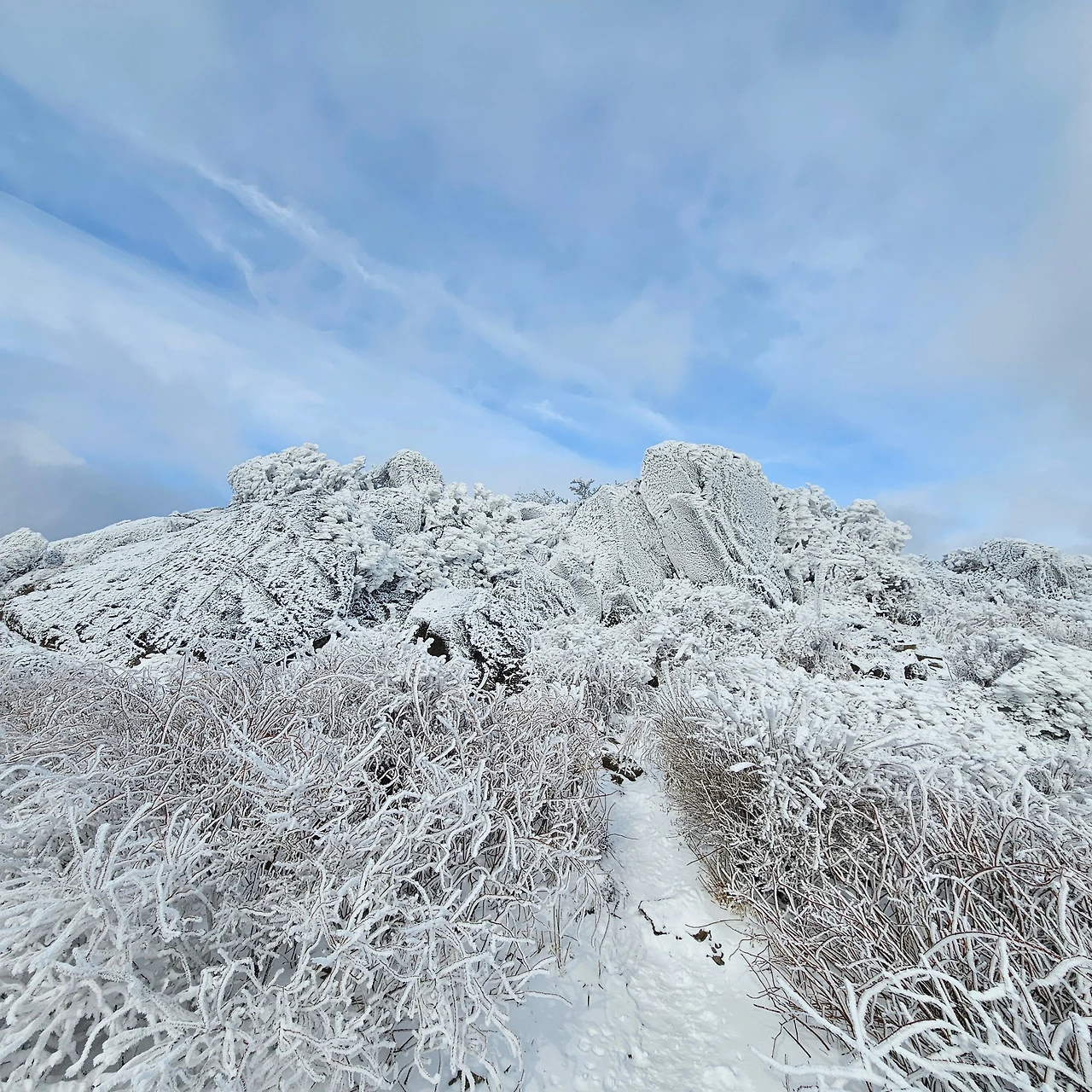 재약산을 오르는 계단에 도착하였다. 1km 남았다는 이정표가 있다. 계단만 1km면 63 빌딩을 오르는 것이다. 그것이 쉽지는 않다. 그래도 규칙적으로 오르기에 힘들면 쉬어가도 되고 아래로 내려다보면서 걷는다. 재약산을 내려올 때 그렇게 길게 느껴졌던 계단이 오늘은 그렇게 힘들게 오른다. 아침에 재약산을 오르는데 벌써 하산하는 사람들이 있다. 얼마나 일찍 시작하였는지 궁금하다. 재약산을 오르면서 가지산을 오를 때 느꼈던 감동을 다시 한번 느껴본다. 얼음과 눈과 바위가 어우러져 있고 나무들이 눈과 얼음으로 새로운 모양을 만들고 있다.