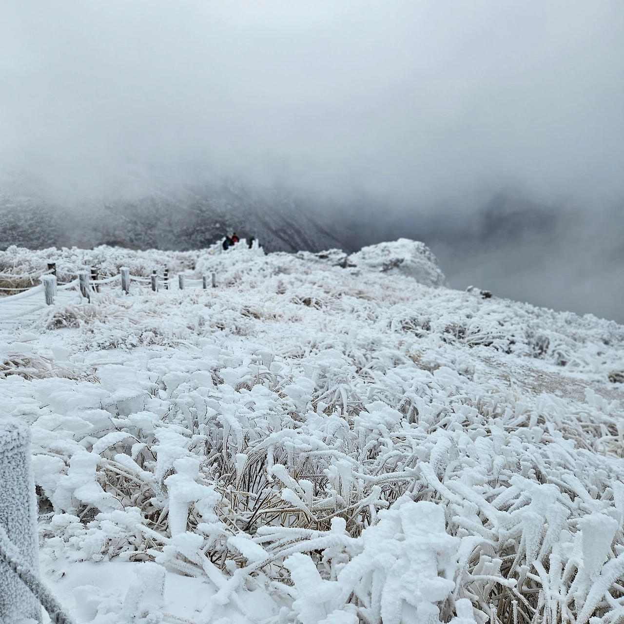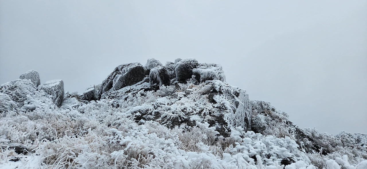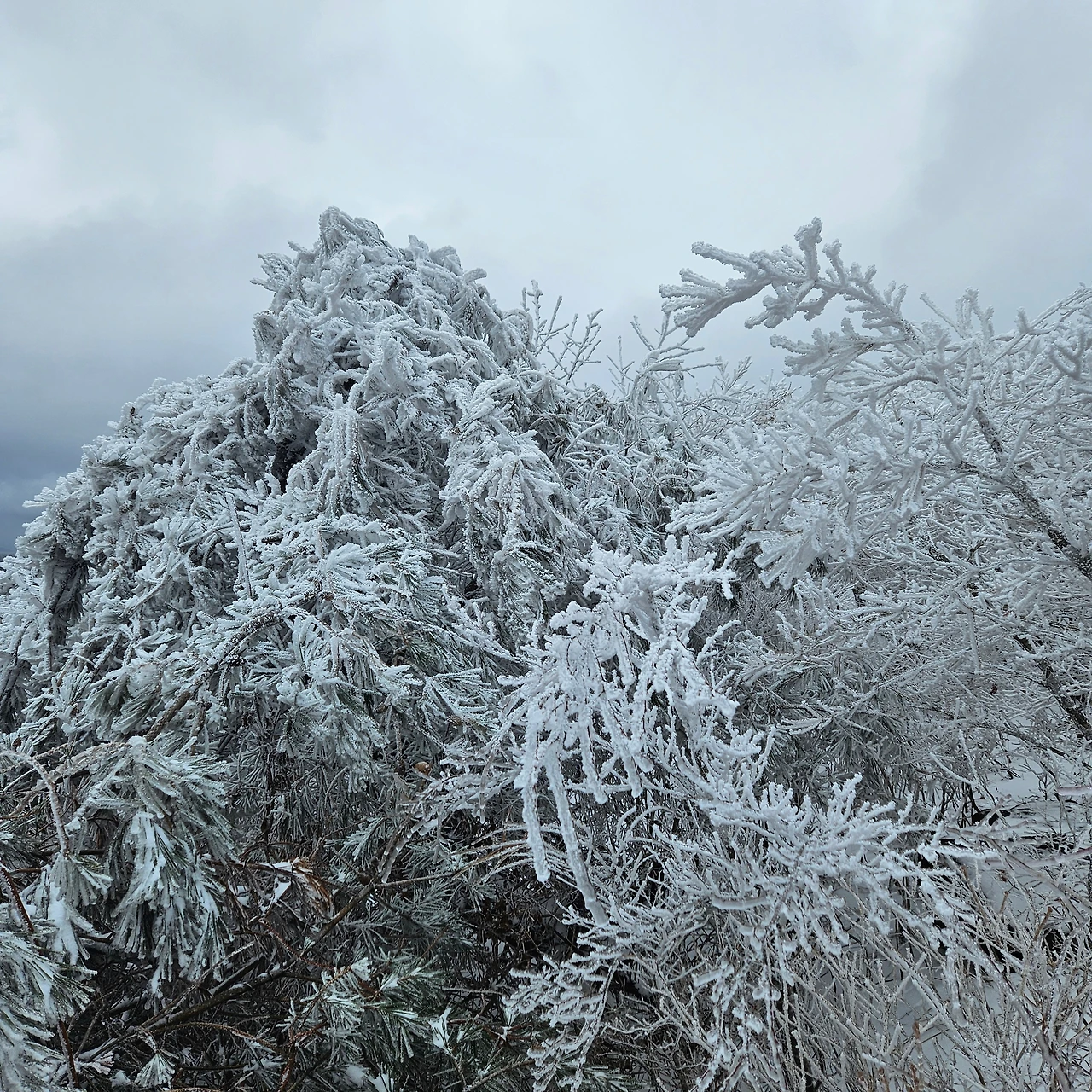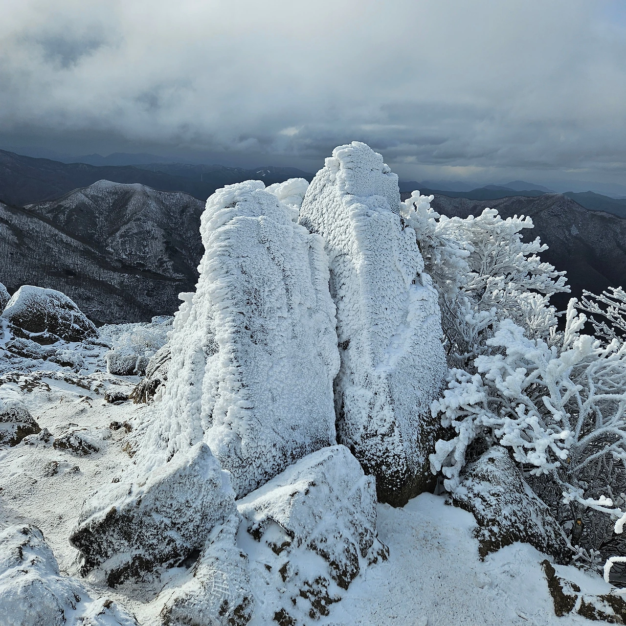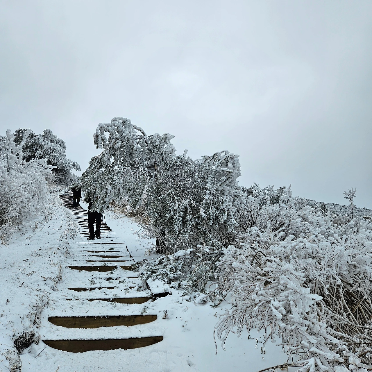 재약산을 오르는 계단에 도착하였다. 1km 남았다는 이정표가 있다. 계단만 1km면 63 빌딩을 오르는 것이다. 그것이 쉽지는 않다. 그래도 규칙적으로 오르기에 힘들면 쉬어가도 되고 아래로 내려다보면서 걷는다. 재약산을 내려올 때 그렇게 길게 느껴졌던 계단이 오늘은 그렇게 힘들게 오른다. 아침에 재약산을 오르는데 벌써 하산하는 사람들이 있다. 얼마나 일찍 시작하였는지 궁금하다. 재약산을 오르면서 가지산을 오를 때 느꼈던 감동을 다시 한번 느껴본다. 얼음과 눈과 바위가 어우러져 있고 나무들이 눈과 얼음으로 새로운 모양을 만들고 있다.