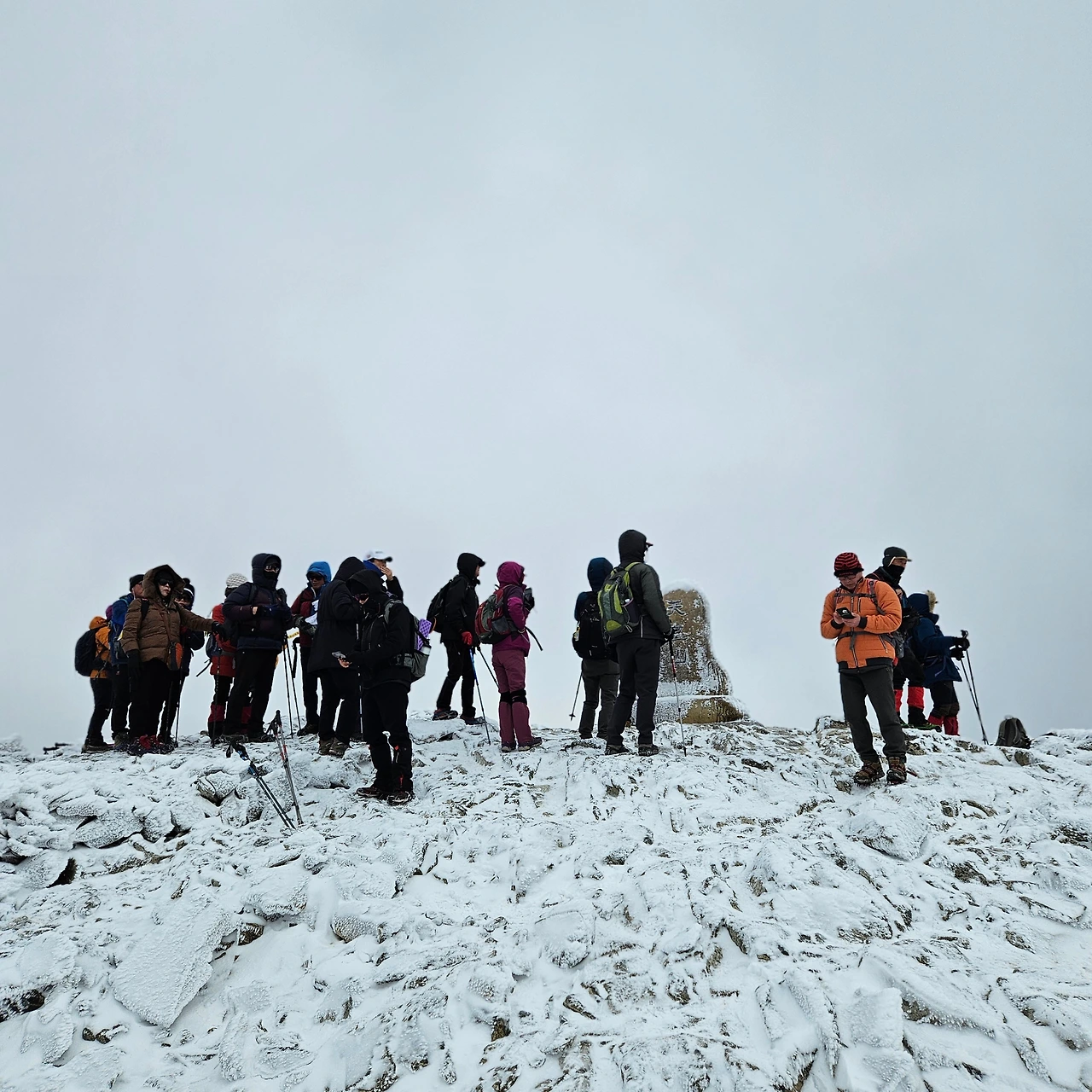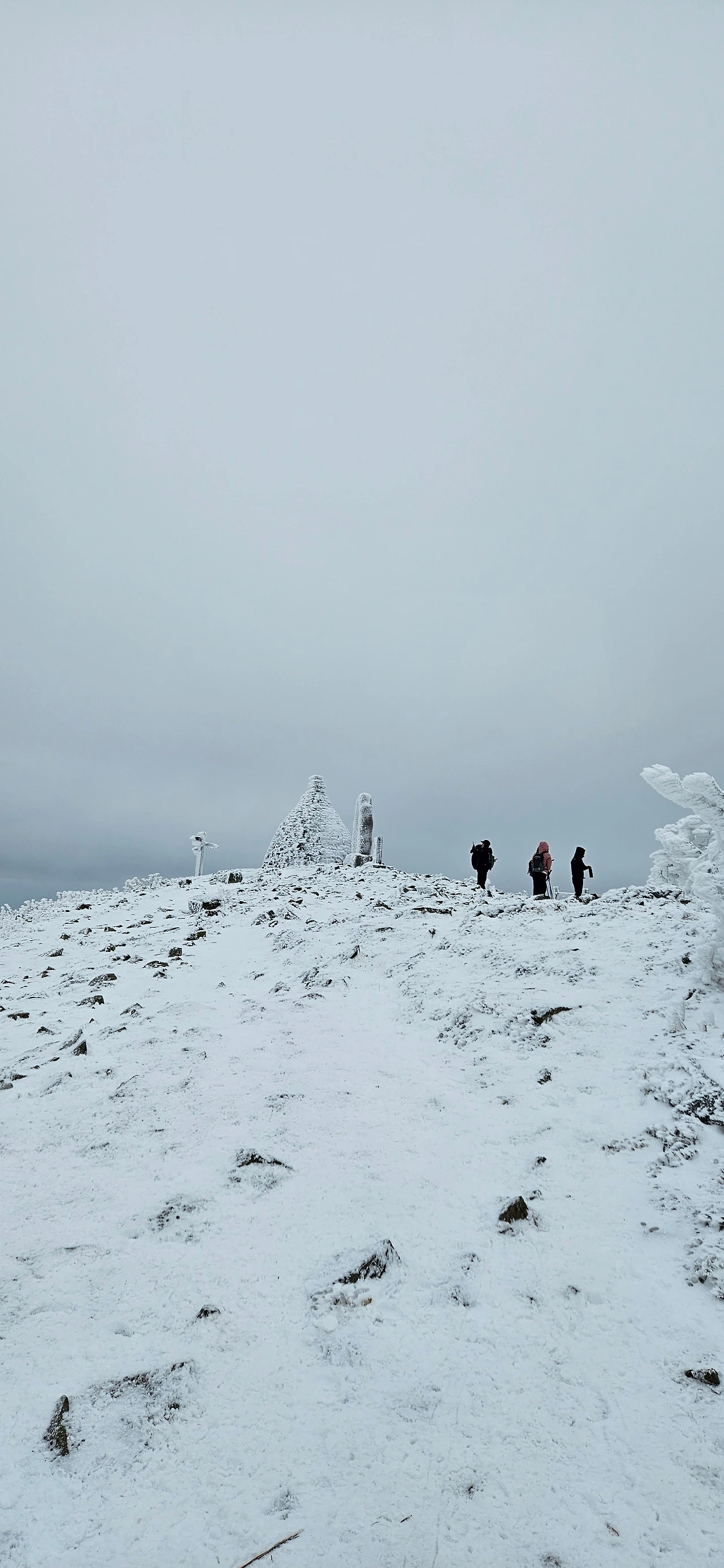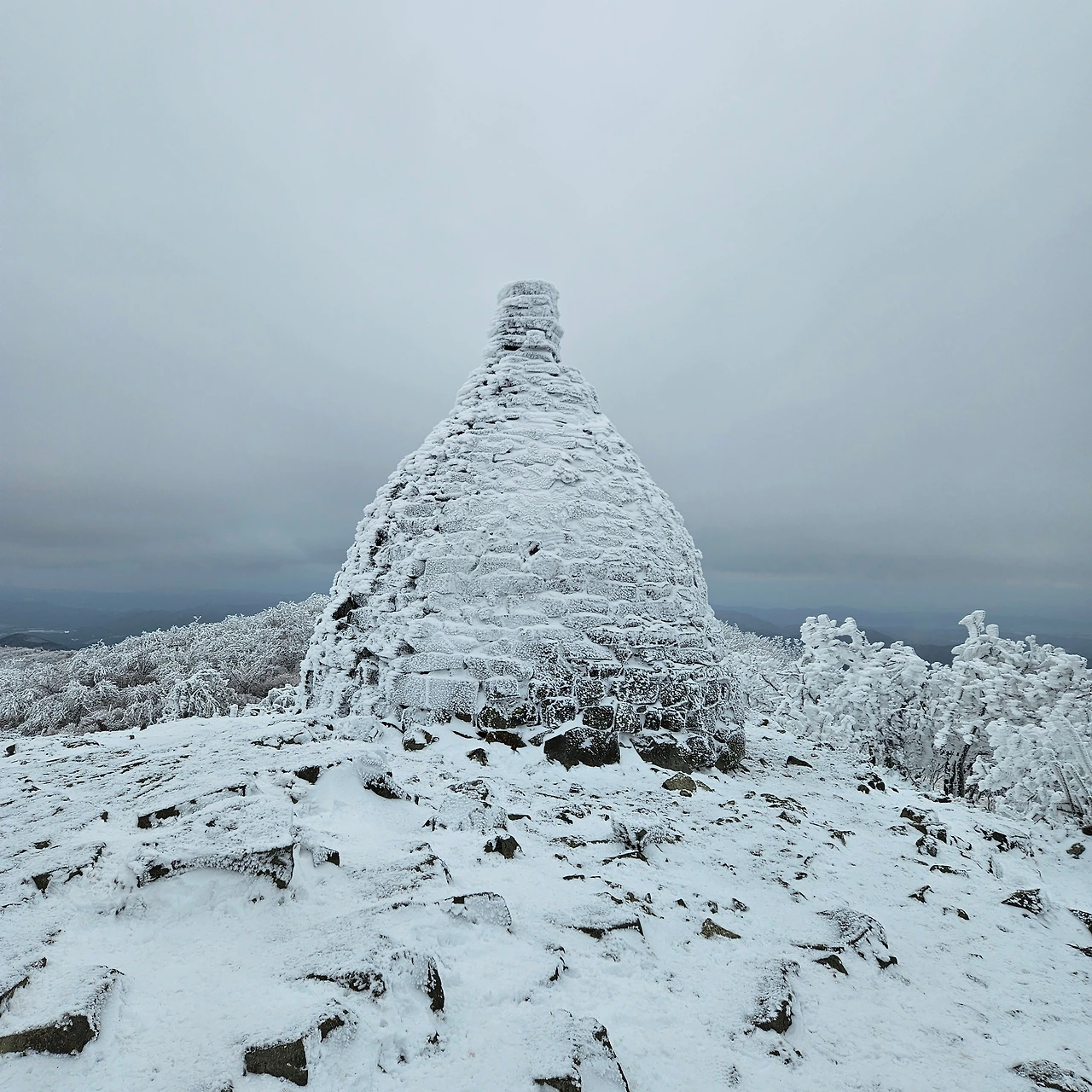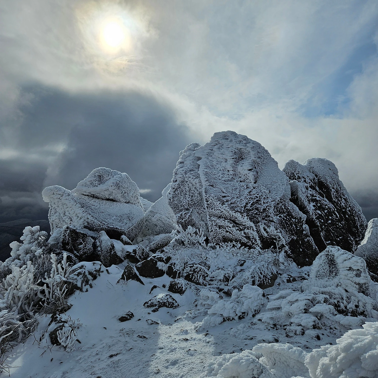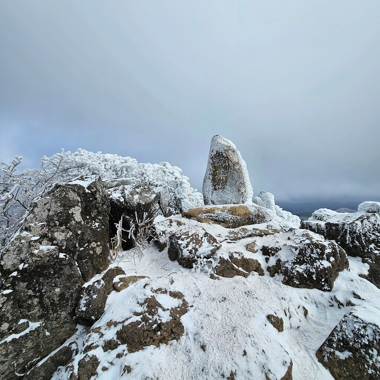 천황산을 오르면서 이렇게 멀다고 느껴보지 않았는데 멀다고 느끼면서 여름날 돌탑이 지금은 한 덩어리가 되어 있는 모습을 본다. 눈이 왔을 때 쌓였던 눈이 녹아서 얼음이 되고 그 얼음덩어리 속에 돌이 한 덩어리가 되어서 서있다. 그리고 재약산은 이제 구름에 가려져 있고 천황산 정상도 구름에 가려져 있다. 천황산 정상을 바로 앞에 두고 사람들이 하나둘 보인다. 정상인증을 하기 위하여 찬바람을 무릅쓰고 기다리고 있다. 우리도 기다려본다. 천황산 정상석도 가지산 정상석처럼 탁본을 하지 않으면 안 될 정도로 눈보라가 글자를 숨겼다.