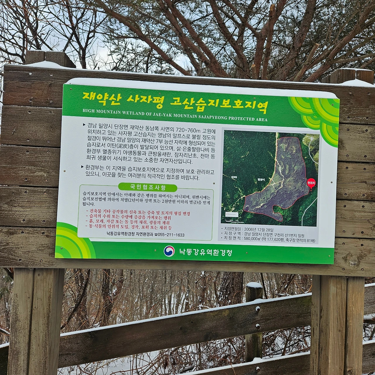 능선에 오르고 감탄을 하였다. 재약산, 천황산의 모습이 그대로 보여준다. 햇빛이 살짝 비추는 재약산의 모습이 경이롭다. 하지만, 사진으로 담기에는 앞에 있는 나무들이 아쉽다. 내 친구 H는 조망을 위하여 살짝 나무를 제거하였으면 할 것이다. 나는 반대다. 그대로의 모습이 좋다. 재약산을 가기 위하여 사자평의 재약산 등산로 입구를 향하여 능선을 살짝 오르고 내리면서 습지보호구역을 지난다. 이 드넓은 공간이 습지로 보전되고 있다. 해발 720-760m 고산지역이 습지로 관리되고 보존되고 있다. 사람들이 이곳에 올라오지 않으니 그대로 보존되고 있다. 예전에는 이곳에 화전민들이 살고 있었으나 이제는 동물과 식물들의 보고가 되고 있다. 그리고 전체지역을 조망을 하고 이제 데크로 간다. 데크를 이용하여 길을 만들어 놓았다. 사람들이 습지보호구역에 접근하지 못하도록 만들어 놓았다. 그리고 그곳에서 재약산을 바라보니 겨울이 그대로다. 산은 설산이다. 우리가 설산을 보기 위하여 히말라야로 간다고 하지만 이곳에서 그것을 감상할 수 있다.
