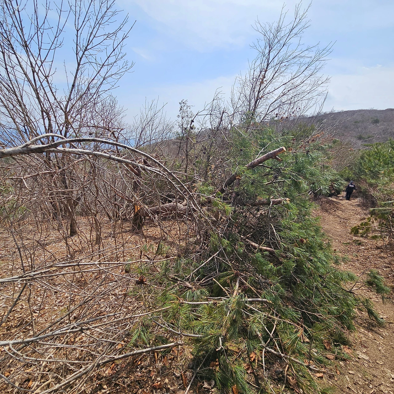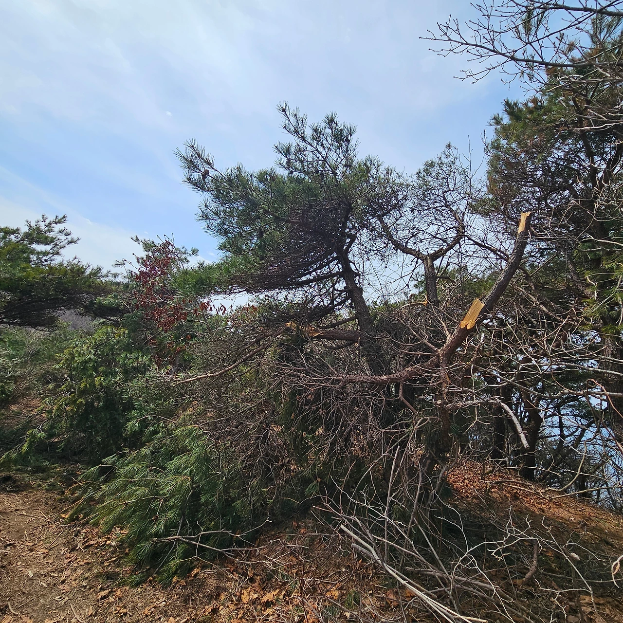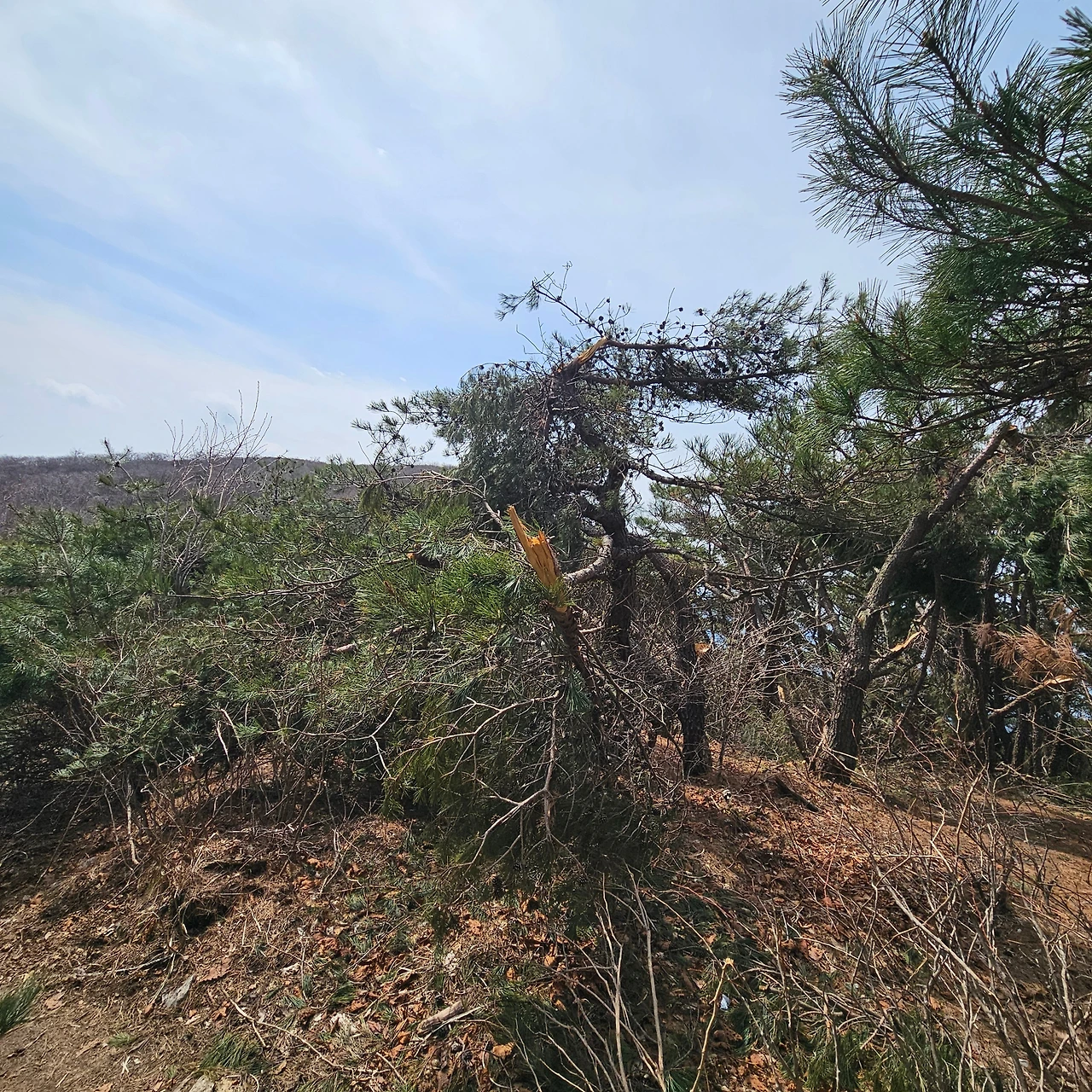 삼거리를 지나고 능선에 도착하였다. 용연사 방향에서 올라오는 등산로를 만난 것이다. 그리고 처음 만난 봉우리에서 우리는 1,047m에 도착한 것이다. 다음이 천왕봉이 1,084m인 만큼 다 올라온 것이다. 비슬산 정상 천왕봉에 도착하면서 지난겨울 눈으로 인한 참극을 또 보았다. 가야산에서도 보았던 그 광경을 또 본 것이다. 소나무들이 2월 내린 습기 그득한 눈에 의하여 가지가 잘려나가는 아픔을 겪은 것이다. 겨울에는 겨울정취가 그대로였지만 그 겨울이 나무들에게는 아픔이었다. 아름다움의 역설이라고 해야 될 것 같다. 그 아픔의 상처는 J가 말하기를 눈폭탄의 융단폭격을 받은 처참함 그대로라고 해야 될 것이다. 천왕봉 일대에 많은 소나무, 참나무들이 이렇게 원시림이 되어 가고 있다. 그것을 그대로 남겨두면 원시림이 될 것이다. 이것을 정리하면 아픔을 모를 것이다.