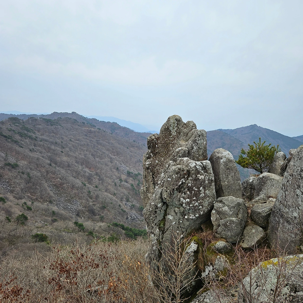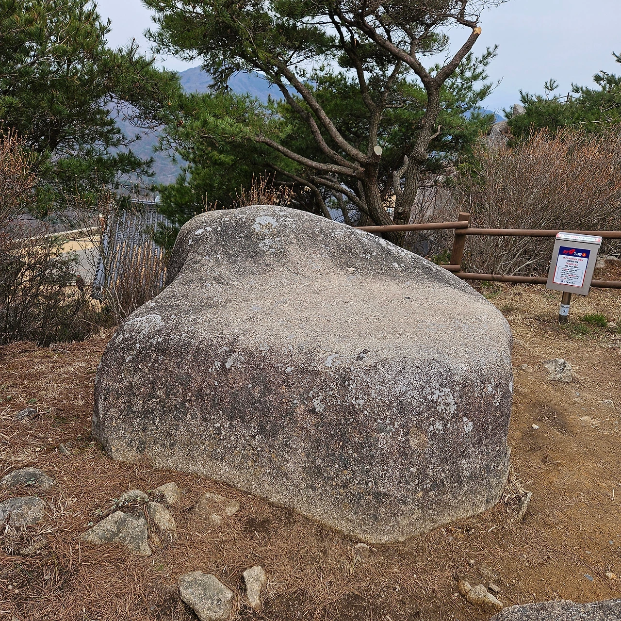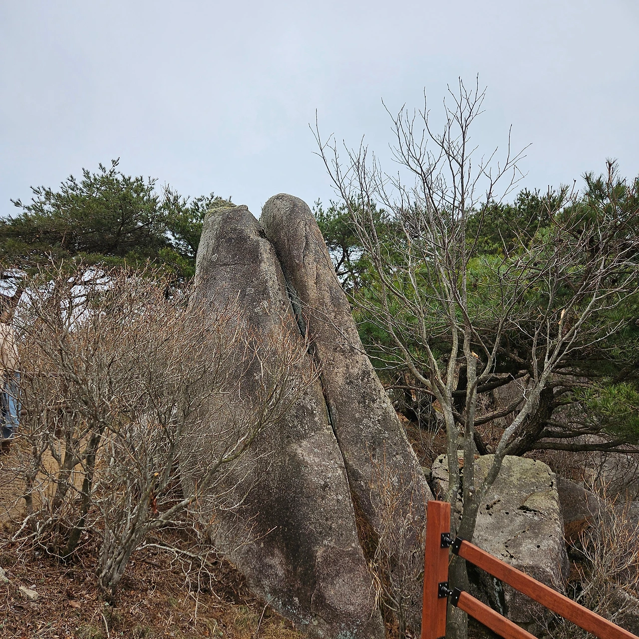 대견봉에 가기 전에 대견사로 간다. 조화봉 근처에서 대견사를 바라다보니 삼층석탑이 세상을 돌아다보고 있다. 그리고 대견사로 내려가는 곳에 유튜브로 진달래 군락지를 중계하는 곳이 있다. 카메라 두대가 그대로 그곳을 감시하고 있다. 산림청에서도 이곳을 열심히 쳐다보고 있으면 좋을 것 같다. 오르지 않고서도 산불감시를 할 수 있을 것 같다. 좋은 곳에서 유튜브 중계를 하고 있다. 많은 사람들이 지나가고 있다. 달성군에서 이곳저곳에 있는 바위에 비와 바람과 세월이 조각한 이름을 붙여 놓았다. 그것을 담고 상상을 해본다. 그 바위 사진을 AI에 입력하고 무엇이야고 물어보니