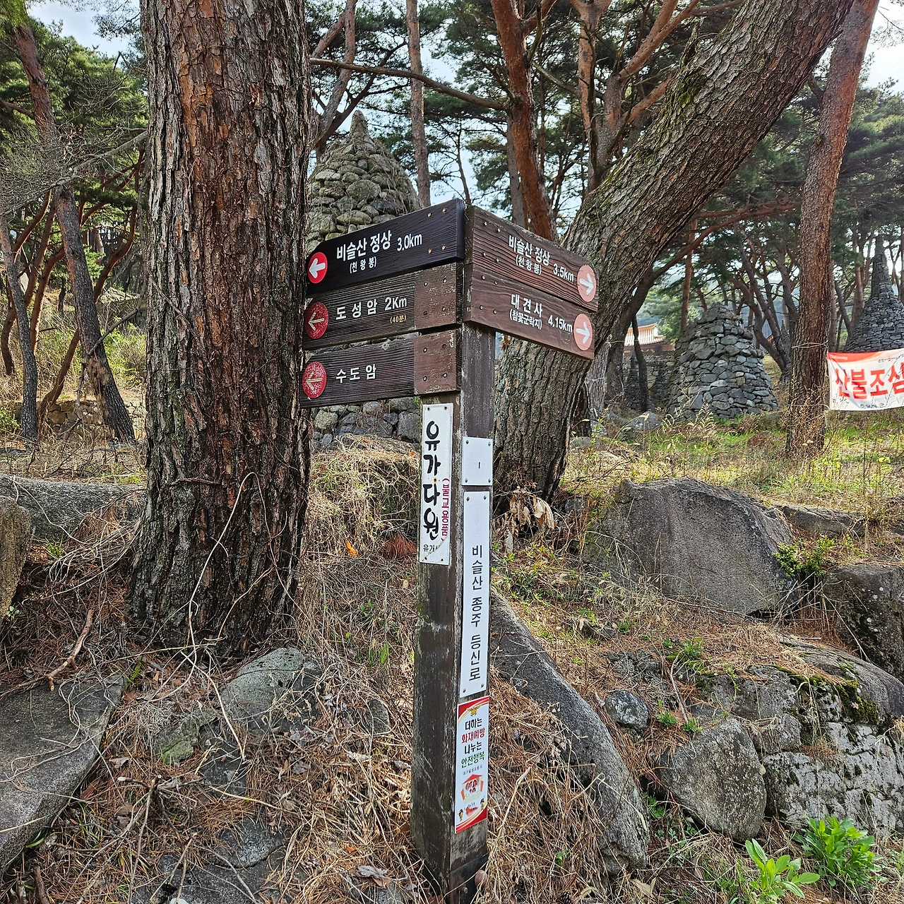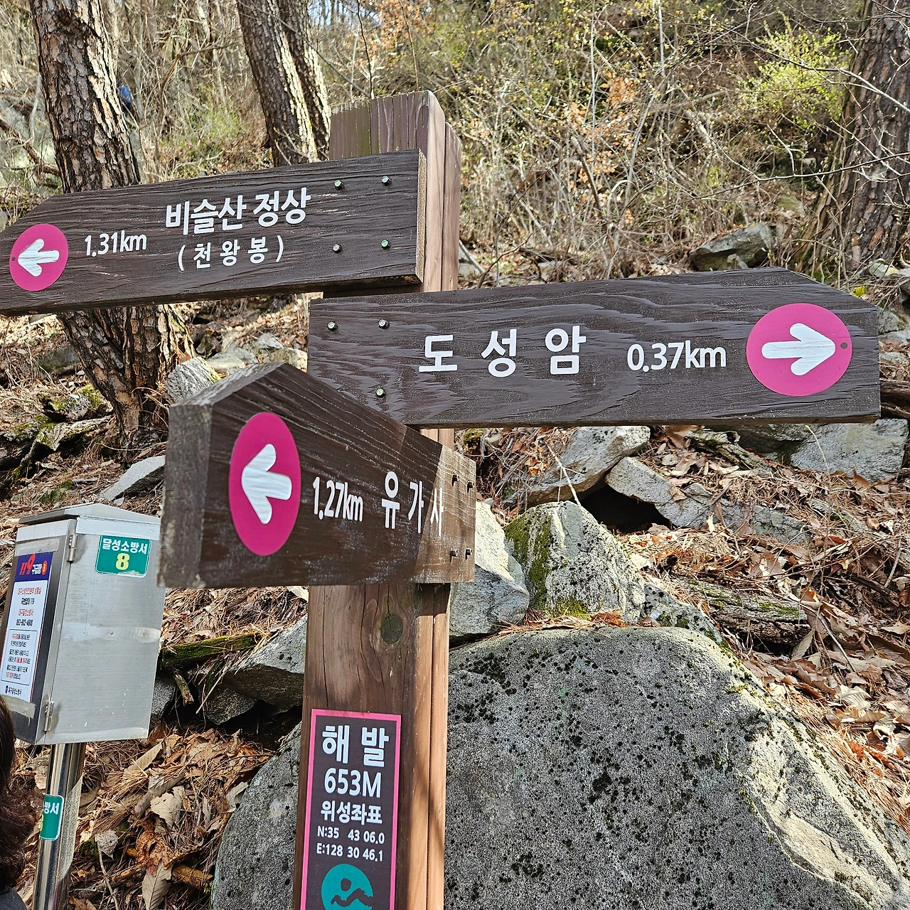 길을 가면서 박근혜 전 대통령이 기거하고 있는 곳을 지나친다. 그곳에서 사진을 남기는 사람도 있지만 나는 그냥 지나친다. 사람들이 추억을 담고 있지만, 나는 추억을 남기지 않고 지나친다. 유가사 바로 아래에 있는 주차장이 있는 150m 아래에 있는 주차장에 주차를 한다. 주변에 벚꽃이 흐드러지게 피어 있다. 그 꽃보다 우리는 진달래를 보기 위하여 왔으니 살짝 담고 유가사 입구에 도착하였다. 산문이 있고 주차장이 있다. 우리가 가야 할 길은 수도암 옆을 지나서 도성암 근처를 지나서 비슬산 정상인 천왕봉을 가려고 한다.