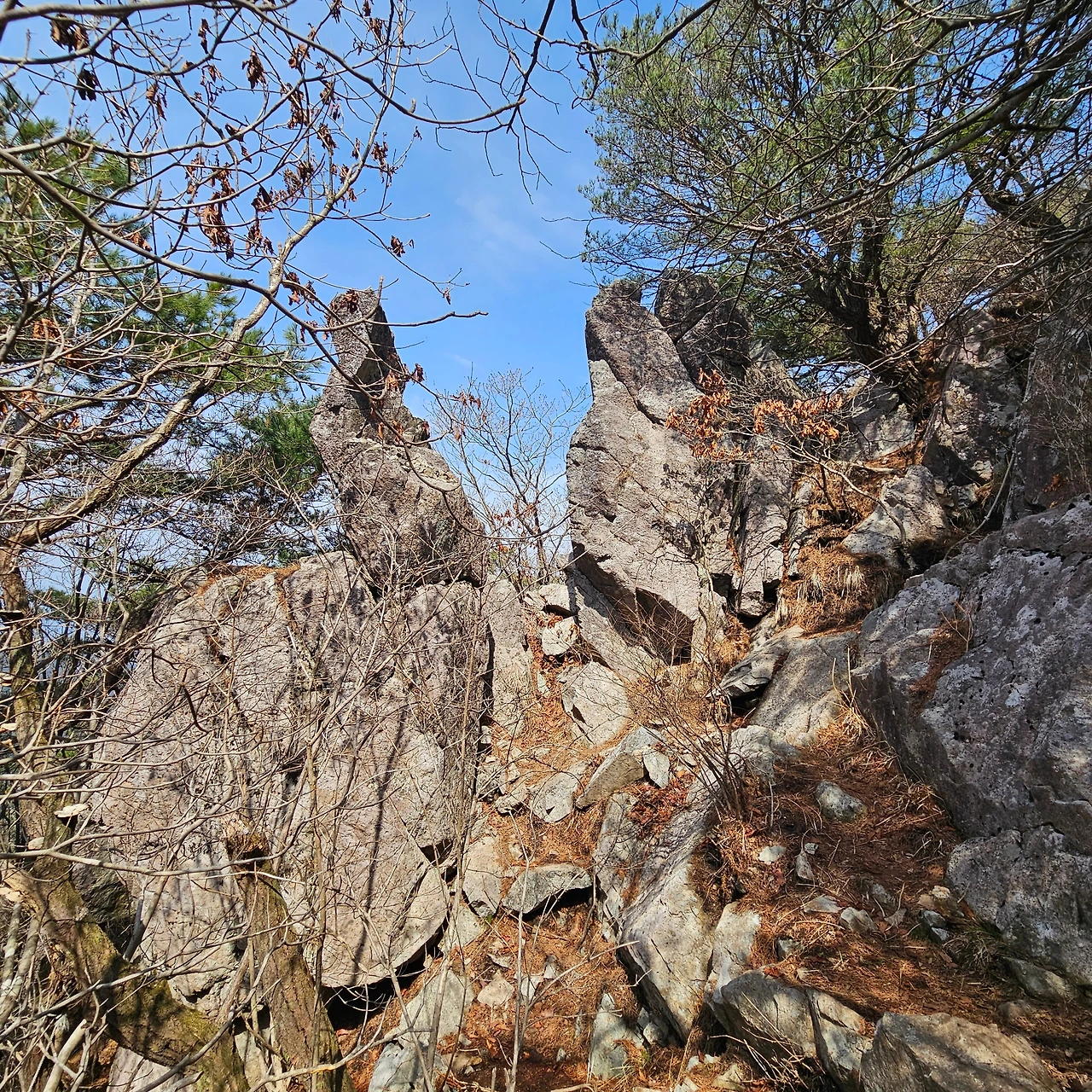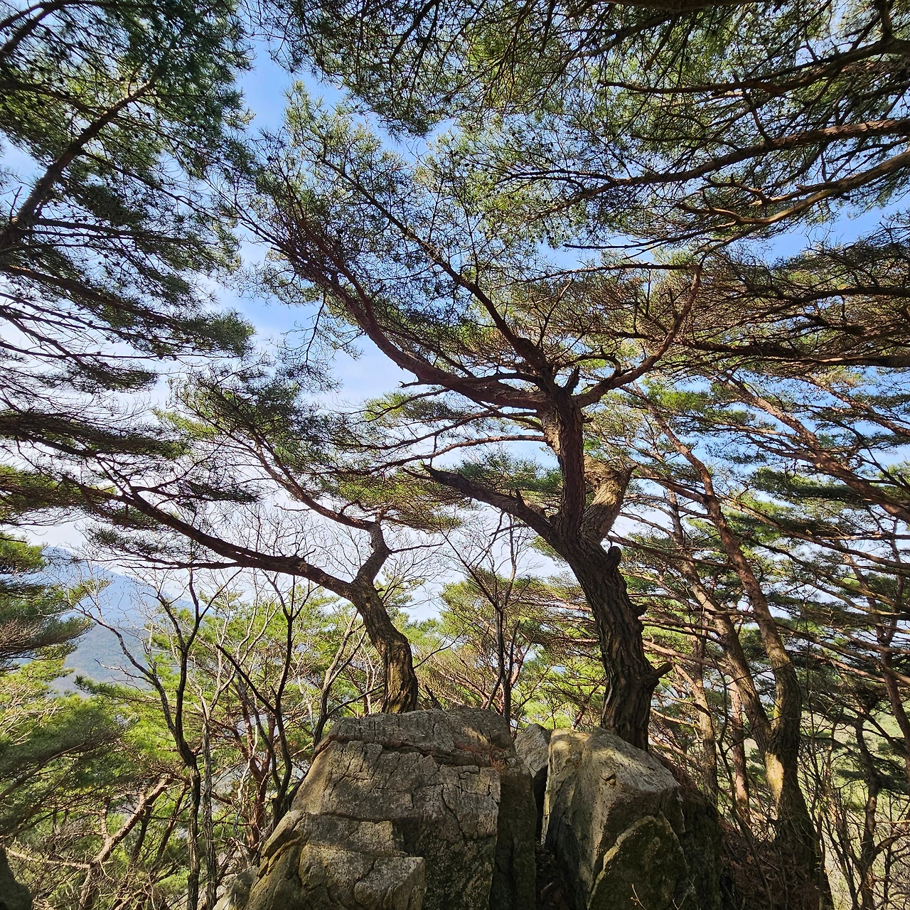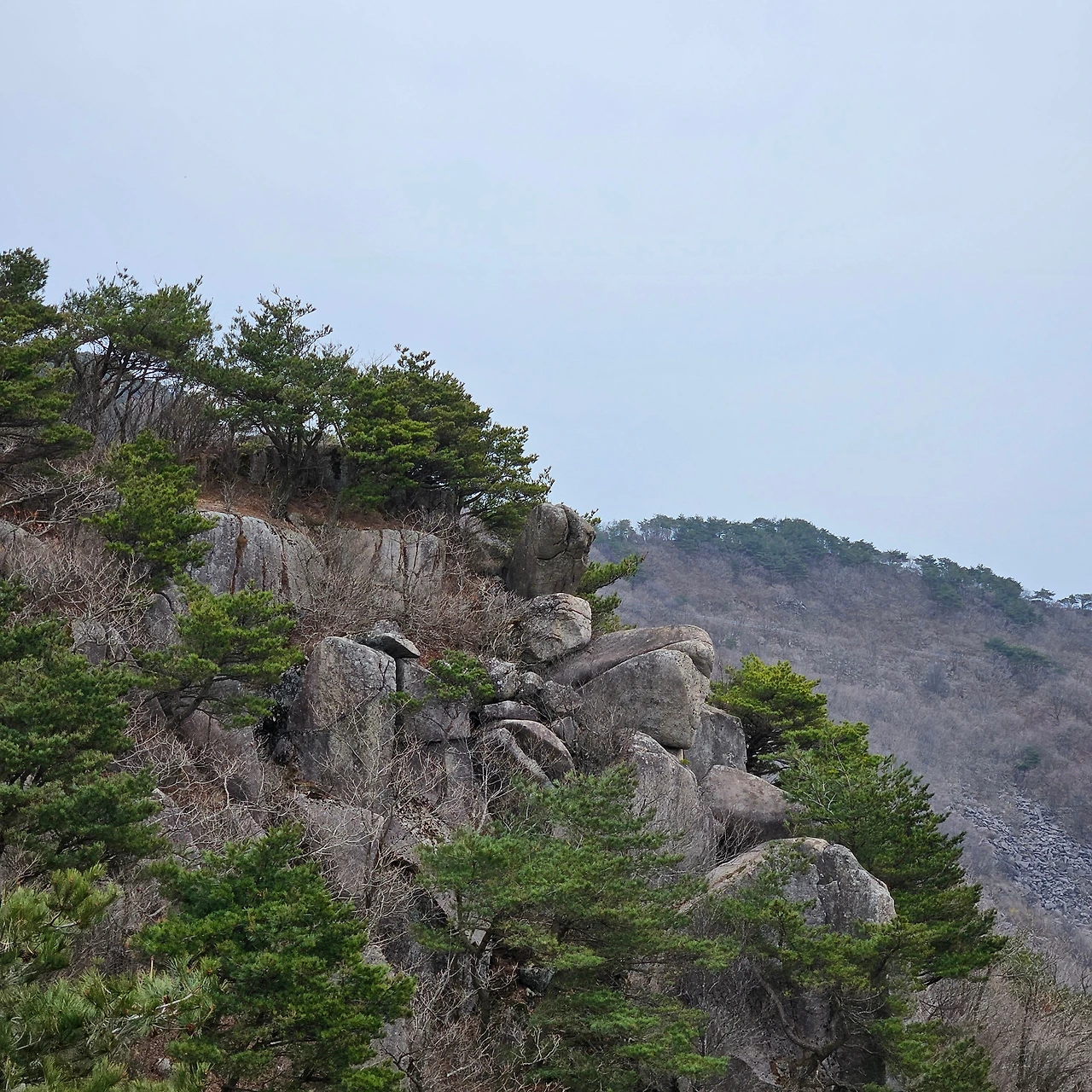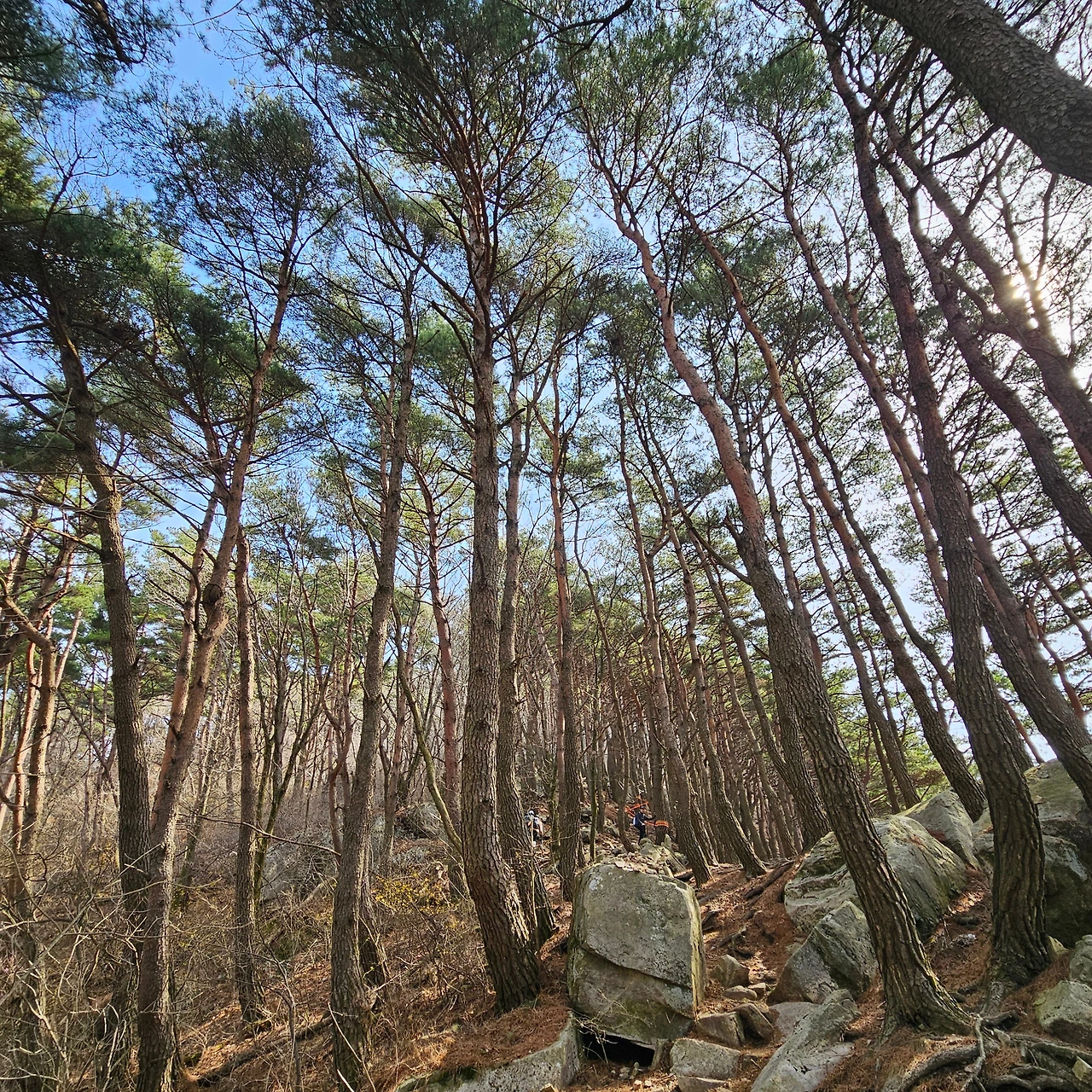 어느쯤에서 정상등산로와 도성암 갈림길이 나온다. 대부분 도성암이 아닌 정상등산로로 들어선다. 길은 이제부터 가팔라진다. 그 길을 따라서 오를 뿐이다. 소나무와 참나무가 하늘을 향해 손을 벌리고 있다. 그 나무들이 너무 좋다. 비슬산의 소나무들은 하늘 향해 참나무와 경쟁하듯이 하늘로 향하고 있다.