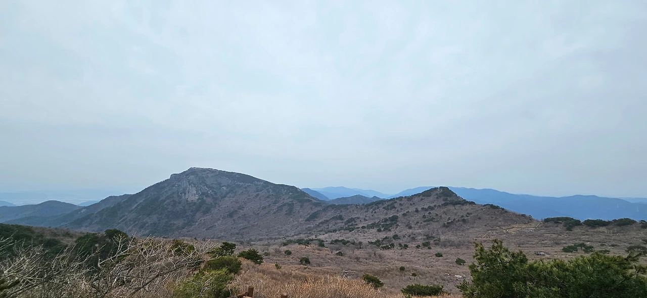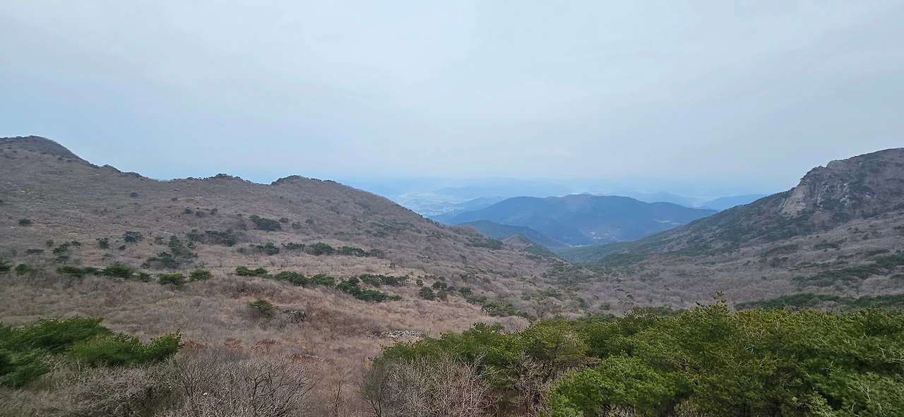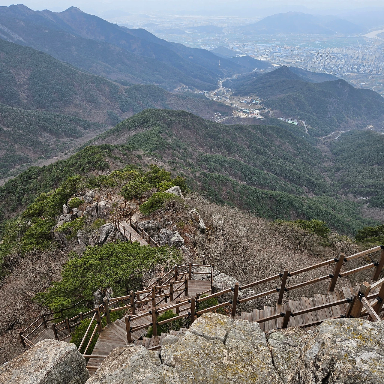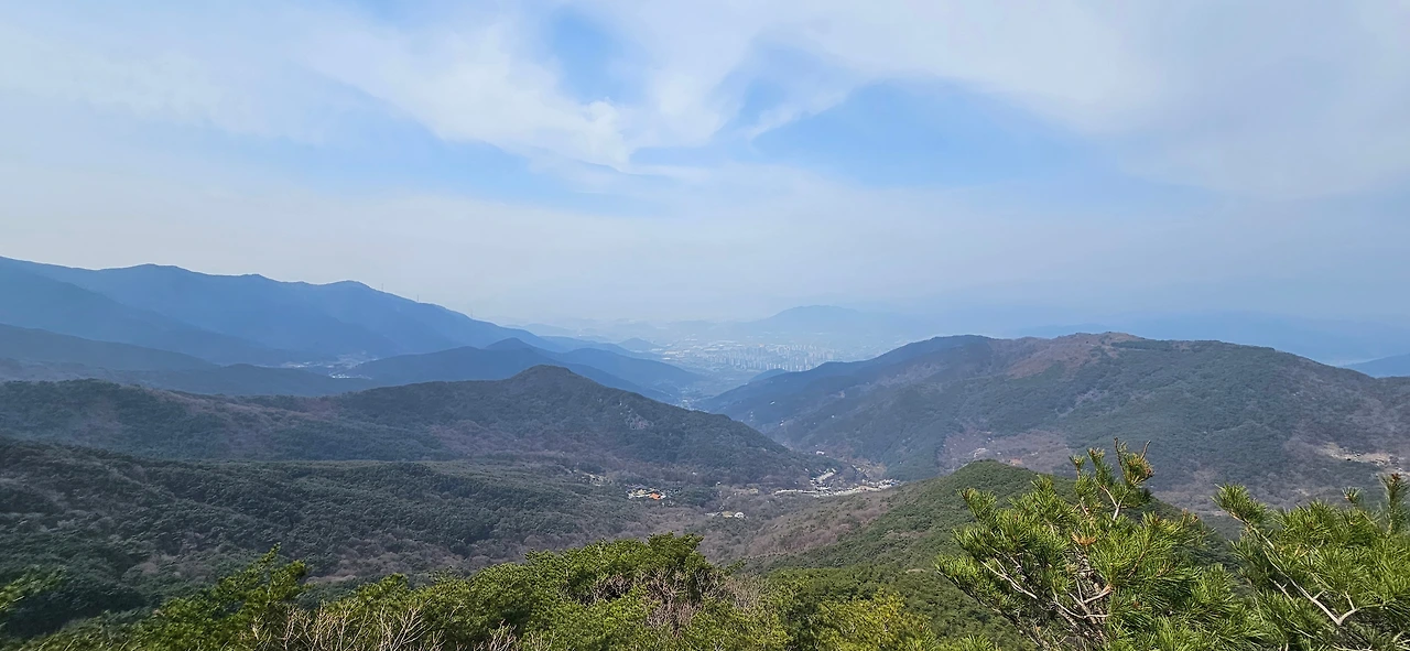 대견봉에 도착하였다. 대견봉에서 휴양림으로 가던가 아니면 유가사로 내려갈 수 있다. 휴양림으로 내려가는 계단이 보이지만 우리는 유가사로 내려간다. 유가사로 가는 길이 하산길로 제격이라고 할 것이다. 산을 하산하면서 편안한 하산길이라고 할 것이다. 하산하면서 전망이 좋은 곳이라 서서 주변을 담아 본다. 진달래군락지 곳곳에 전망대가 설치되어 있다. 그곳에 사람들이 한 번씩 갔다가 온다.