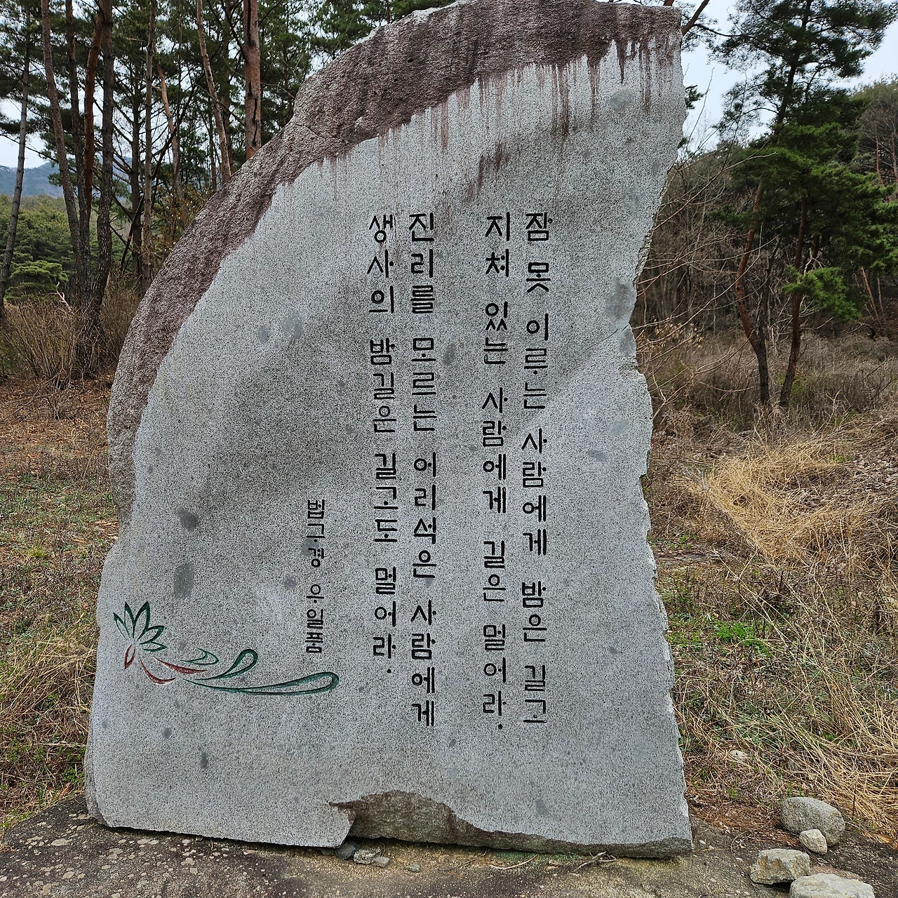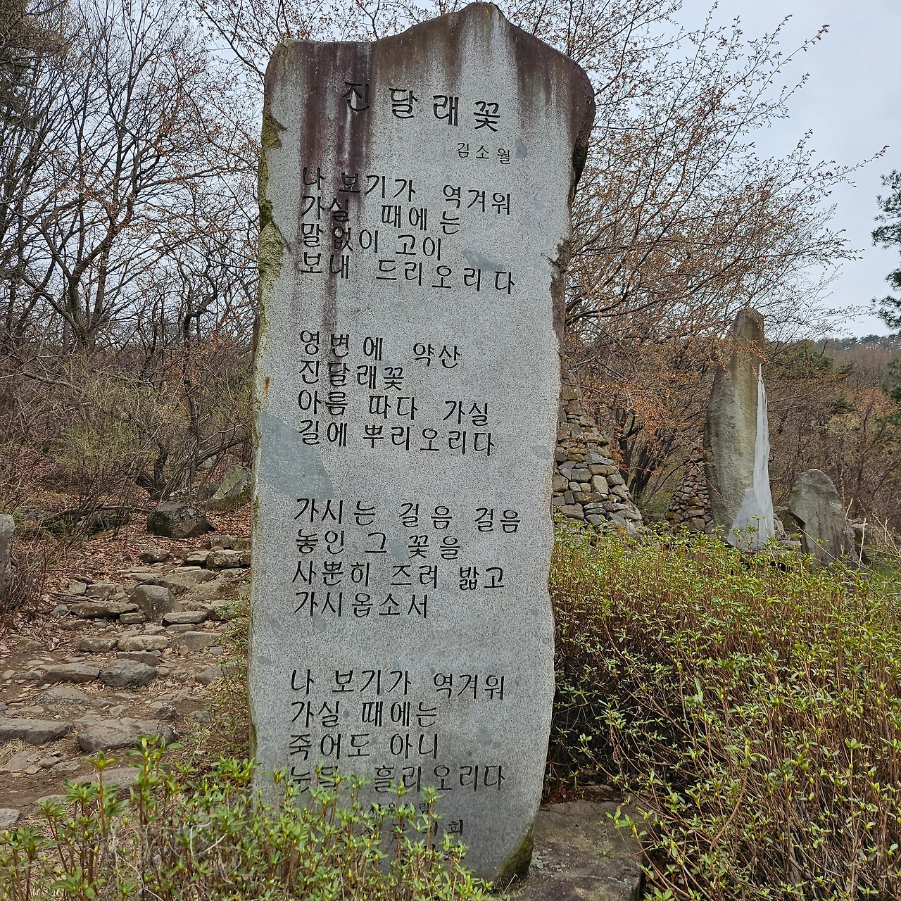 그리고 내려가면서 천왕봉에 정상에서 내려오는 갈림길을 만났다. 그리고 1km를 걸으면 유가사다. 유가사 근처에 도착하니 시비가 많이 세워져 있다. 처음 만나는 것이 김소월 님의 '진달래 꽃'이다. 그렇게 진달래를 보려고 하였지만 진달래는 유가사를 내려오면서 보았다. J는 진달래와 천왕봉을 동시에 사진을 담았다. 드문드문 피어있는 진달래의 아쉬움을 주차장 부근에 있는 벚꽃으로 달래었다.
