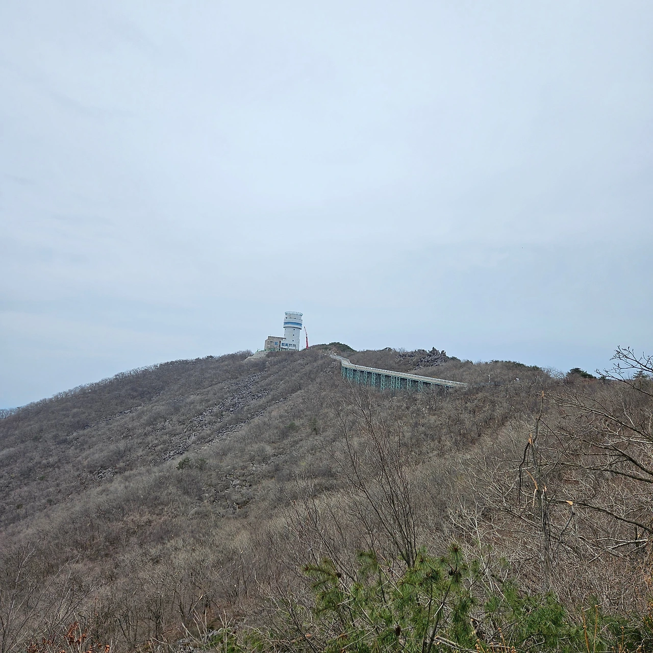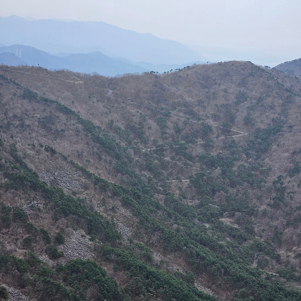 이제 조화봉으로 오르면서 살짝 비추어 보이는 진달래가 있지만 아직은 진달래가 제철이 아니다. 진달래는 2주 후에나 제철이라고 한다. 그래도 그 나무들이 갖고 있는 느낌을 그대로 가지고 조화봉을 오른다. 조화봉 정상에 있는 강우레이더기지는 수리 중이라 접근을 하지 말라고 한다. 하지만, 톱바위가 있어 근처로 갔다. 반대편에는 바로 아래까지 버스가 올라오고 있었다. 버스가 올라오니 사람들이 넘쳐날 수밖에 없다고 본다. 비슬산자연휴양림 입구에서 버스가 출발하고 있었다. 대견봉에서 바라다본 버스가 올라오는 길을 바라다보니 갈지자로 이어진 버스길이 보인다.