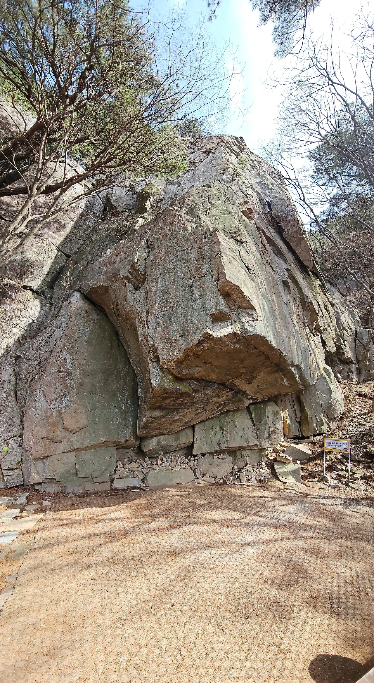 도성암에서 올라오는 등산로를 만나고 난 후 처음으로 만나는 것이 도통바위다. 그 바위로 이동을 한다. J도 좋아한다. 가파르게 올라온 후 한숨을 들일킬 수 있도록 옆으로 이동을 하여서 그 바위를 보는 것이다. 옛적 이곳 바위아래에서 도를 통하였다는 전설이 이야기한다. 아래에는 도성암이 보이고 그곳에서 무엇을 하는지 바라소리가 요란하다.