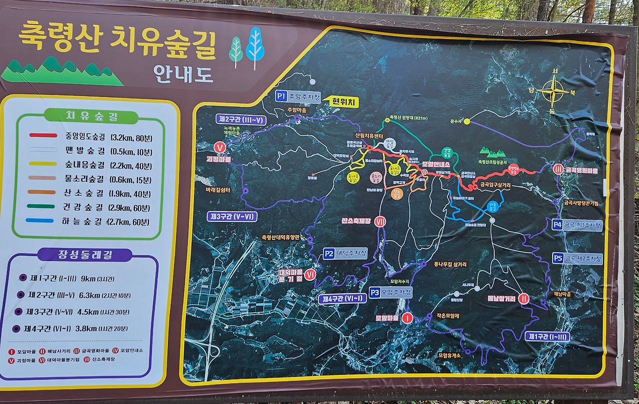 마을입구가 있는 주차장에 자동차를 주차시키고 이동을 시작한다. 여기에서 어디로 가야 하는지 안내그림이 있고 등산객이 있고 주민들이 올라가는 길을 따라 바로 올라간다. 포장된 길을 따라간다. 축령산 정상을 밟고 난 다음 숲을 체험하면서 삼림욕을 즐길 것이다. 치유센터가 있으며 그곳을 기점으로 산으로 올라갔다가 삼림욕을 즐기는 것이다. 치유센터로 이동을 하면서 주변을 돌아보고 편백숲이 있지만 남겨두고 간다. 다시 올 때 그것을 즐기려 하는 것이다.