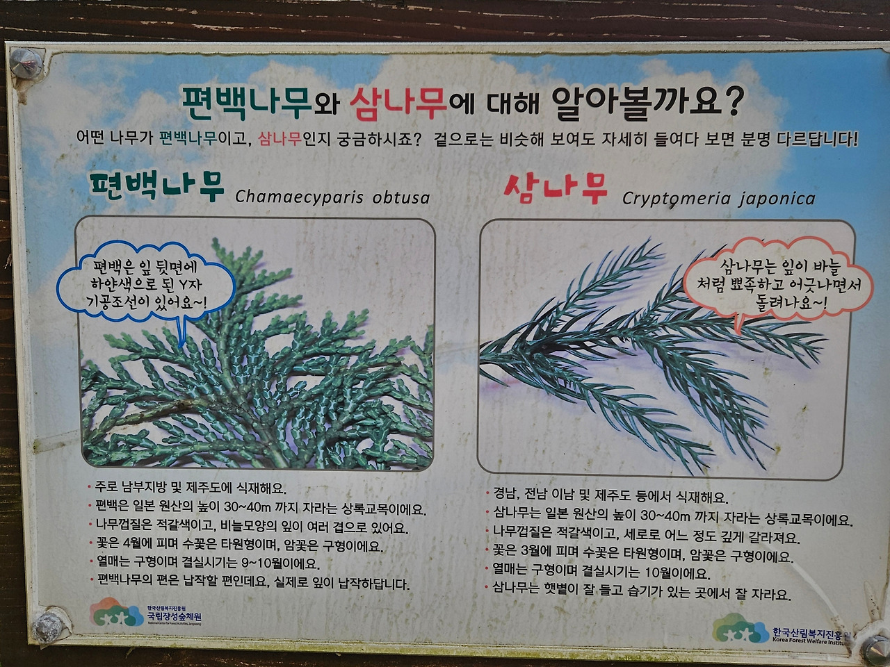 삼나무와 편백나무는 모두 측백과에 속하는 침엽수 나무이다. 원산지는 편백나무는 일본이며 히노끼나무라 불리며, 삼나무는 동부 아시아지역이다. 얼른 보면 비슷한 부분이 있으나 나무의 주성분 및 잎의 모양 내인성 내수성이 차이가 많이 난다. 내수성이 강한 성질 때문에 히노끼탕 욕조로도 사용되고 있다. 편백나무는 정유분을 많이 가지고 있으며, 식물이 분비하는 살균물질이라는 " 피톤치드"를 원목 중에 최고로 많이 방출한다. 편백은 잎뒷면에 하얀색으로 된 Y자 기공조선이 있다. 삼나무는 잎이 바늘처럼 뾰족하고 어긋나면서 돌려난다.