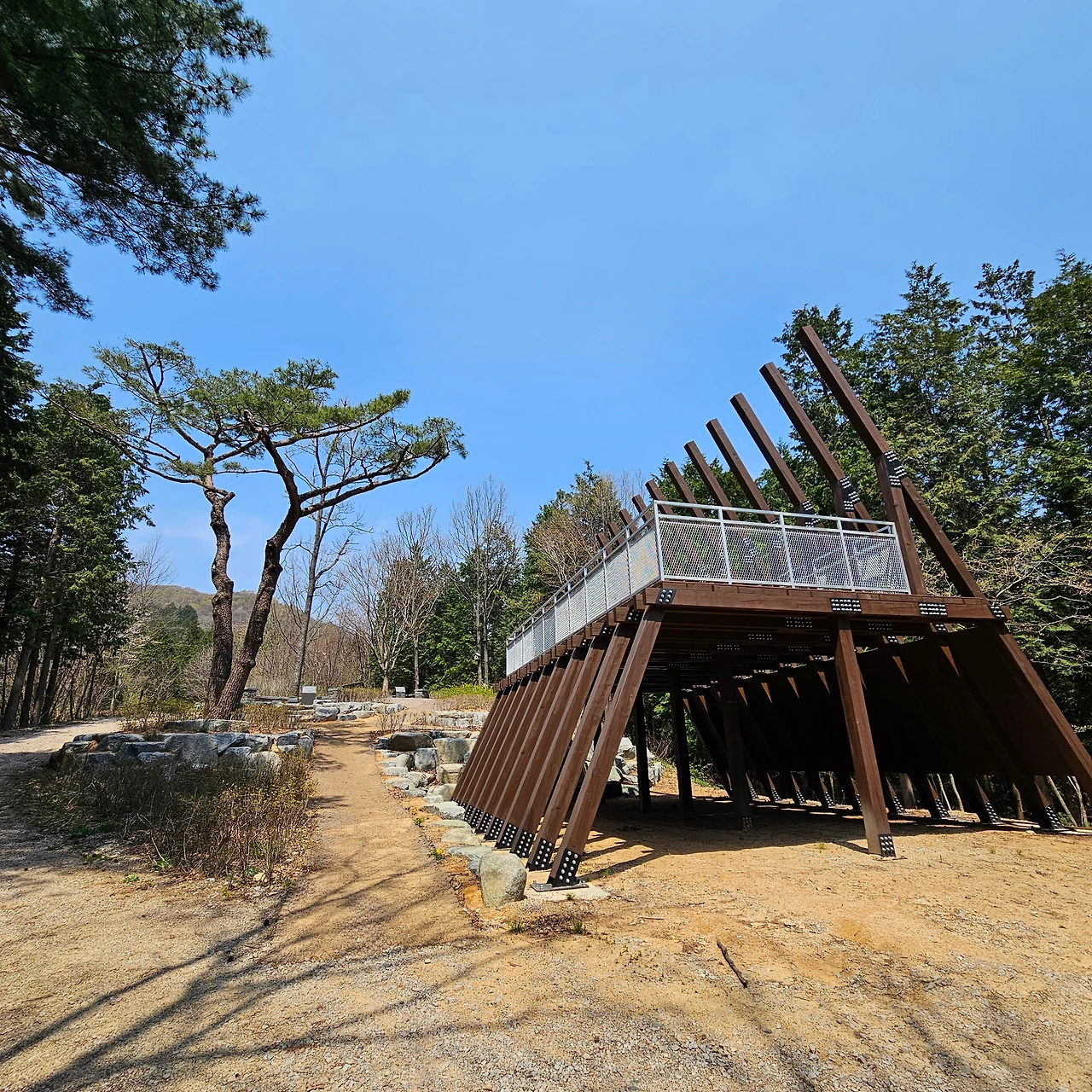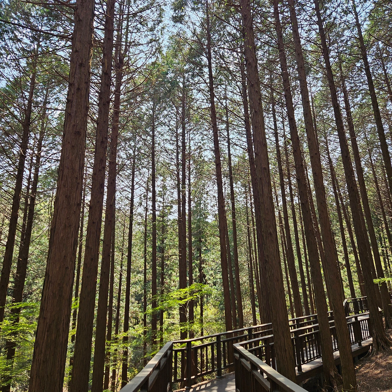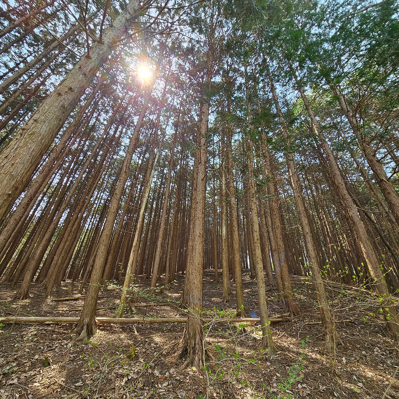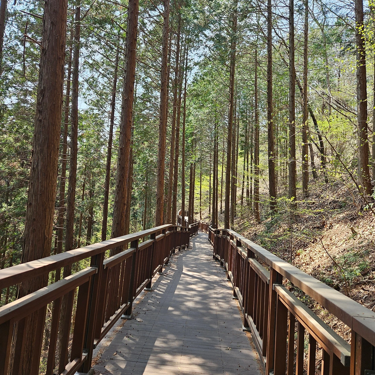 이웃한 산소숲길을 걸어본다. 산소가 많이 나는 나무는 어린나무들이라고 한다. 그리고 그 나무들 주변에 자연적으로 자라나고 있는 묘목을 본다. 이렇게 많이 나는 어린나무들이 자라고 그것을 옮겨 심을 것이라고 본다. 휴양림이 있다고 하여 내려가보니 별도로 감흥이 없다. 아무도 없는 곳에 내려가서 즐기면서 숲을 가까이 보고 그것을 알고 다시 올라온다. 그리고 우물이 있는 주변으로 돌아오는데 숲내음길이 있다. 오솔길을 걸으면서 하늘을 향해 뻗은 편백과 삼나무 사이를 걷고 숲내음길로 들어선다.
