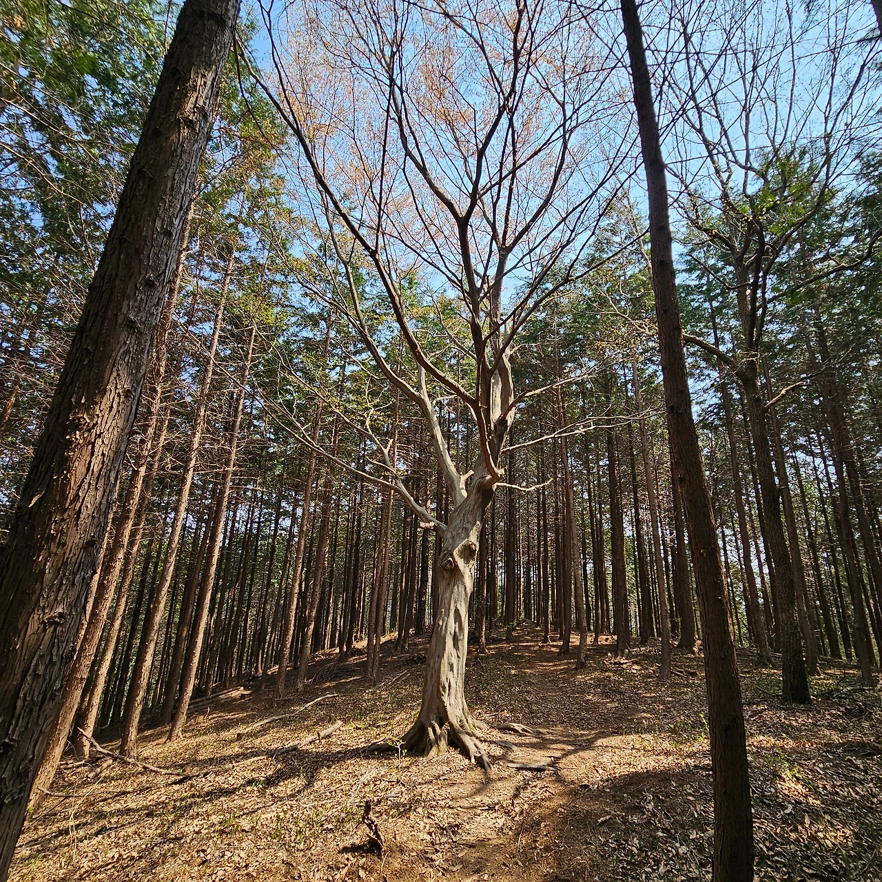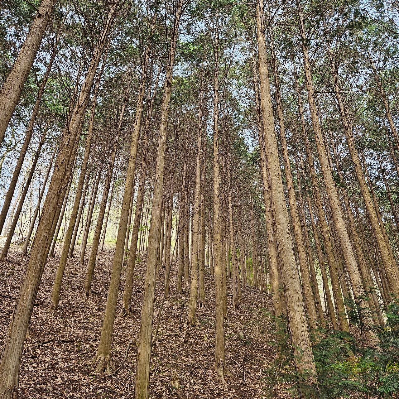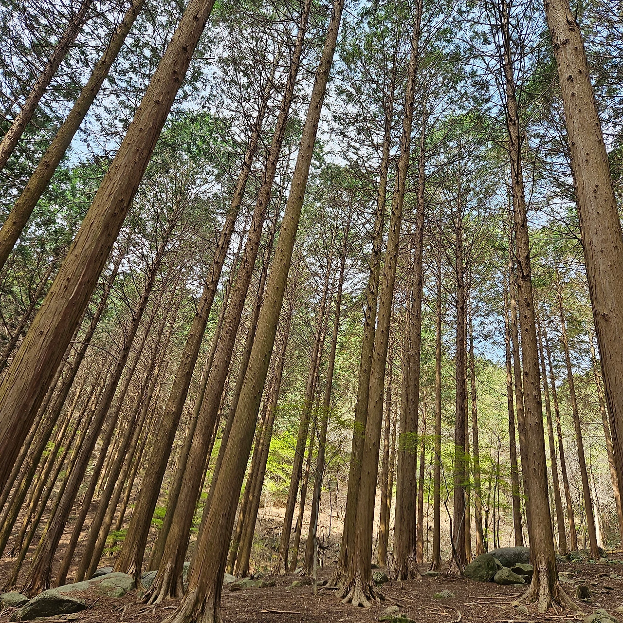 축령산 정상 바로 아래에 숲은 사람들이 접근하기 어려워 그런지 잘 자라고 있다. 어느 것이 삼나무인지 편백인지 구분이 잘 안 되지만 이곳은 삼나무 숲이라고 하였다. 이곳을 지나면서 이순신장군이 해전에서 승리한 이유가 생각이 난다는 지인의 이야기를 들어본다. 조선해군의 함선은 소나무로 건조되었고, 일본해군의 함선은 삼나무로 건조되어 크기는 크나 횡에서 가해지는 압력을 견디지 못하여 조선해군이 이길 수밖에 없었다고 한다. 삼나무가 소나무보다 빨리 크고 곧게 뻗는 것은 사실이나 소나무처럼 단단하지는 않은 것 같다.