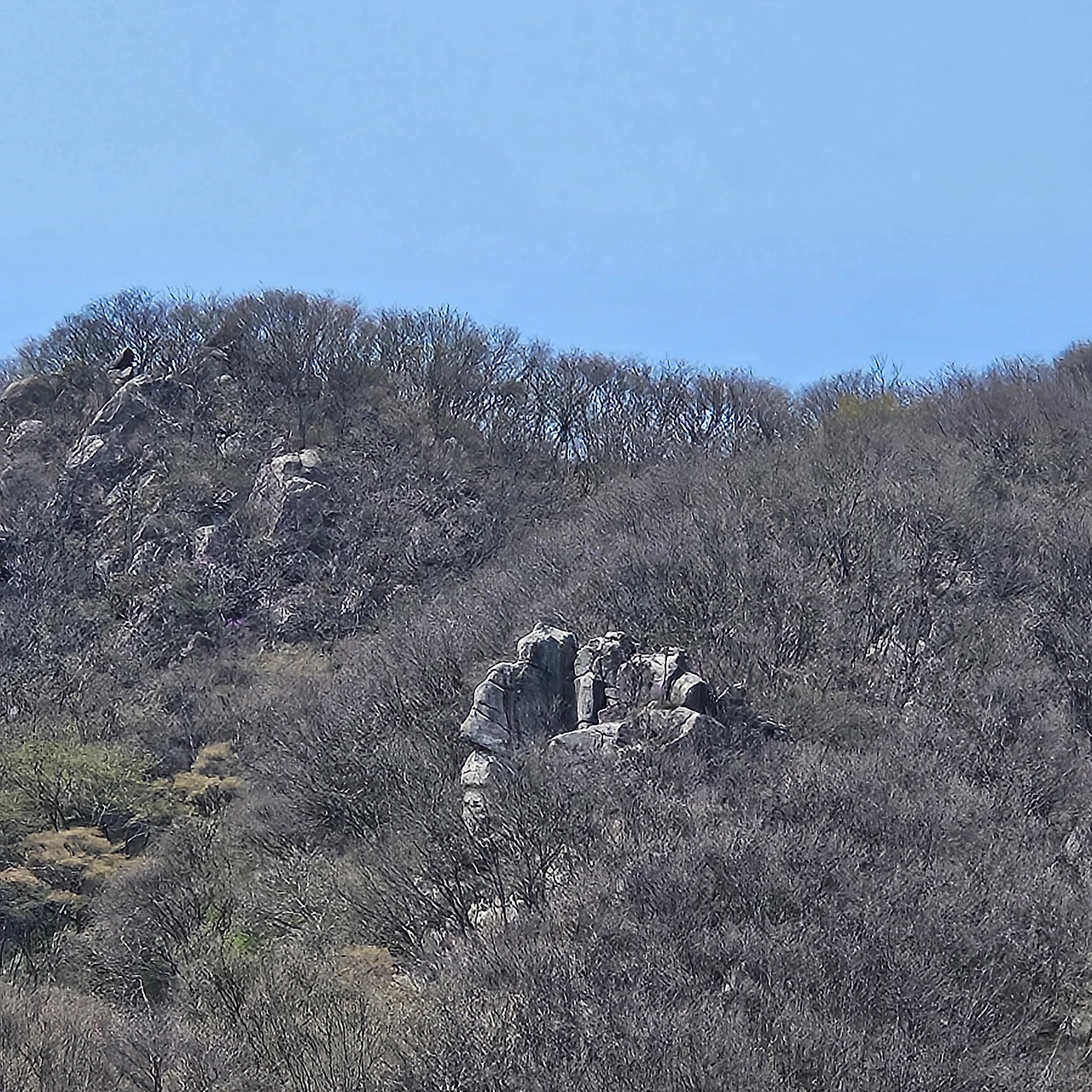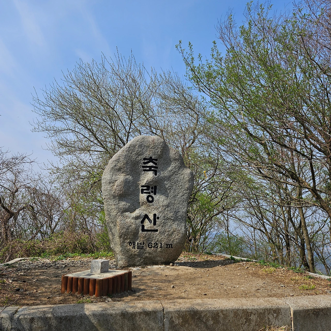 숲내음길이 데크로도 되어있고 오솔길도 있다. 우리는 데크로도 오솔길도 걸었다. 그렇게 이곳저곳을 걸었다. 추암마을에 있는 자동차가 있기에 추암마을 표시를 따라 걷다가 하늘 숲길을 만났다. 장성군에서 야심 차게 만들어 놓은 길이다. 며칠 전 산행기에는 폐쇄되어 있었는데 오늘은 열려 있다. 그리고 계속하여 연장을 하는 것 같다. 그 길을 따라 내려가면 그렇게 어렵지 않게 축령산 아래를 지나면서 즐기는 것이다. 하늘숲길이라고 한다. 우리는 오늘 이렇게 축령산을 즐겼다. 멀리 있는 바위 축령산 정상아래의 바위가 멋있어 당겨보았다.