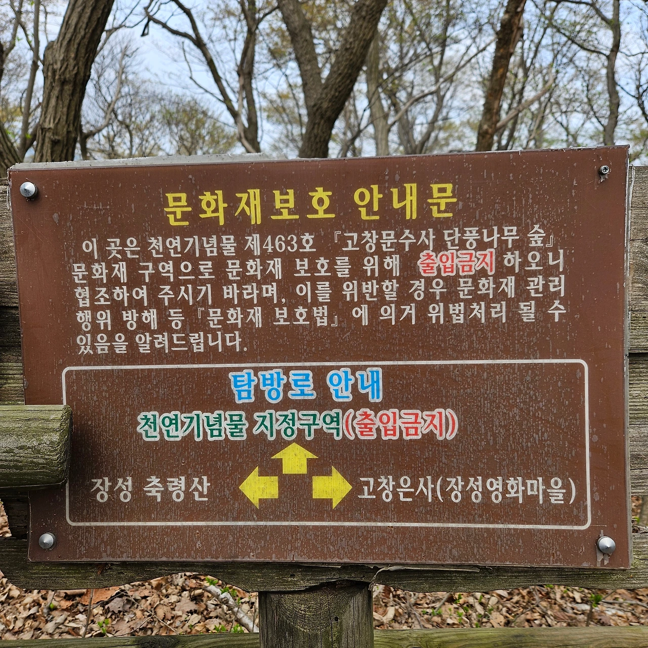 가평의 축령산처럼 이곳의 축령산도 한 방향은 가파르게 다른 방향은 여리게 되어 있다. 치유센터에서 접근할 때는 가파르게 되어 있지만 금곡마을 등에서 접근할 때는 편안하게 접근할 수 있다. 우리는 가파르게 오르고 여리게 하산을 하는 것이다. 축령산 정상에 있는 팔각정은 오늘도 손님을 맞을 준비가 되어 있지 않다. 그 옆을 지나 금곡마을 입구까지는 아니지만 우물터가 있는 곳으로 하사하는 지점까지 천천히 걷는다. 왼쪽은 고창이다. 그리고 그 숲도 보전되어야 할 지역이라는 표시가 있다. 단풍나무를 보호하고 있다는 표지석이 있으며 들어가지 말라는 경고다. 그 경고 지주목이 오래되어 쓰러져 있으나 그 역할은 하고 있다. 가을이면 단풍도 보고 산림욕도 하고 일거양득이 될 것이다.