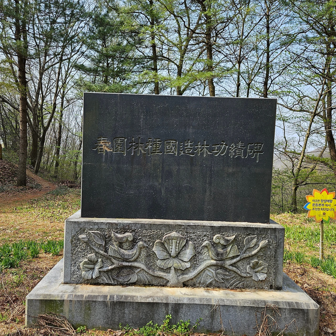 독림가 춘원 임종국 선생이 1956년부터 1987년까지 사재를 털어 한 그루, 한 그루 심혈을 기울여 조림사업을 펼쳐온 곳으로 축령산 일대에 50~70년생 편백나무와 삼나무 등 늘 푸른 상록수림대 1,150ha가 울창하게 조성한 것을 기리기 위한 기념비가 있고 그의 수목장지도 있다. 수목장지는 지나면서 보고 우선적으로 기념비를 보고 축령산 정상으로 발을 옮긴다. 상당히 가파르다. 치유센터에서 올라가는 길은 가파르다. 데크도 설치되어 있다. 축령상 정상을 가는 길 주변에 숲이 있는데 그 숲이름은 맨발숲길이다.