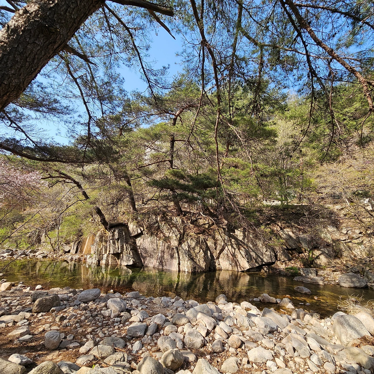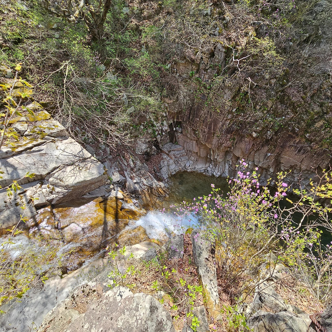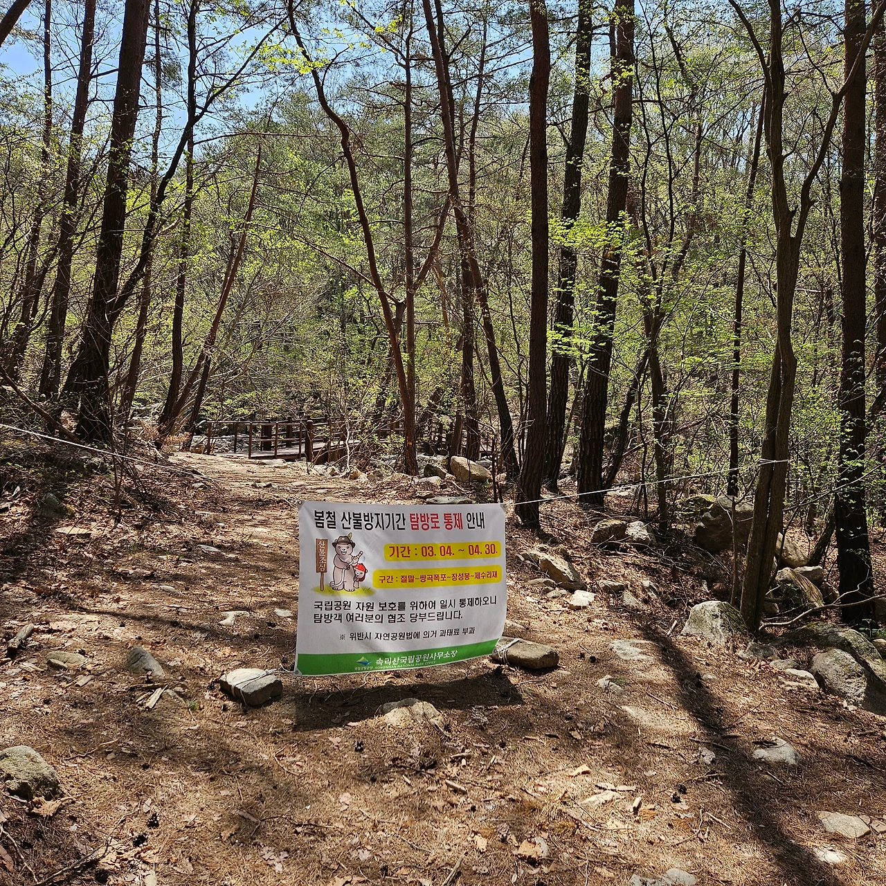 쌍곡폭포가 있다. 폭포를 위에서 내려다보는 것은 그렇게 즐겁지 않다. 폭포는 밑에서 보는 것인데 위에서 보는 것으로 전망대가 설치되어 있다. 그곳을 지나 조금 가면 폭포는 아니지만 밑에서 보는 폭포와 유사한 것이 있다. 그것이 더 아름답다. 이웃한 산벚나무와 개복숭아 나무에 꽃이 만발하다. 여름도 되기 전에 산은 덥다. 나무는 아직 옷을 입지 않았는데 태양은 이글거리고 등산로는 햇빛이 강하게 때리고 있다. 계곡을 들어가지 말라고 하지만 오르면서 그 더위를 이길 수가 없어서 머리와 얼굴에 시원한 물을 붓고 오른다. 이른 시간에 오르지 않고 점심을 먹고 오르는 것이 이렇게 힘들다는 것을 몸으로 느낀다. 점말이라는 곳에 도착하니 산불조심기간에 이곳에서 장성봉을 거쳐 제수리제까지가 입산통제를 한다는 안내가 있다.
