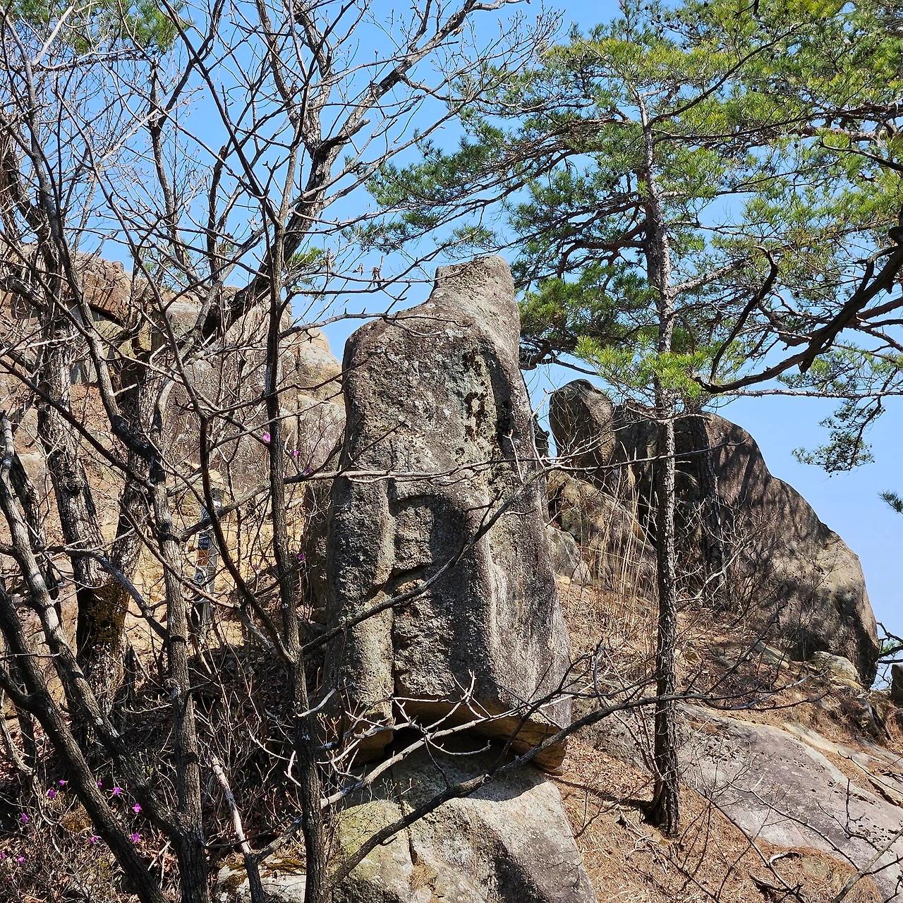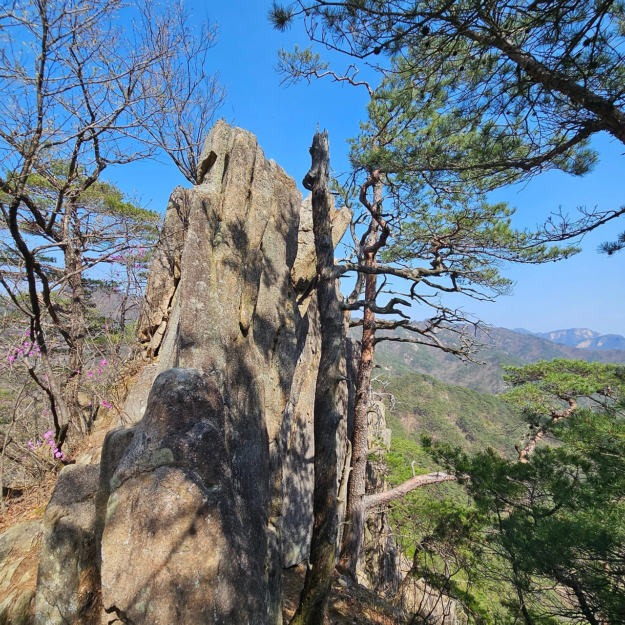 노란 제비꽃이 군락을 이루고 옆의 계곡을 벗어나면서 이제는 활목재를 오른다. 아직은 오르막이 아니지만 1시간 정도 걸으면서 더위와 싸우고 있는데 정상에서 내려오는 사람도 지쳐가는지 얼마나 가야 입구에 도착하는지 물어본다. 그렇게 힘들지 않은데 봄철 산행에서 더위와 싸우면서 천천히 내려가면 1시간이라고 알려준다. 활목재를 오르는 10분이 이렇게 힘들까 생각하는데 오르고 보니 시원한 바람이 불고 있다. 이곳에서 각연산구간도 산불조심기간에 통제라고 한다. 이제는 능선길로 정상까지 가면 된다. 가는 길은 바윗길이지만 데크가 있고 뒤를 돌아보면 봉우리가 있고 오르는 길은 바윗길을 굽이굽이 올라간다.