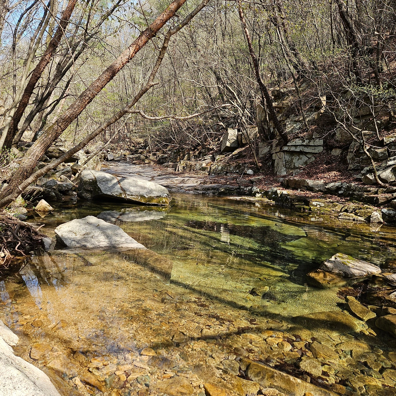 올라온 길을 다시 내려가다 보니 그렇게 감흥은 없다. 올라온 길이 더워서 내려가는 길이 덥지 않기를 바랄 뿐이다. 다만, 내려가면서 계곡에 도착하여 머리와 얼굴에 찬 계곡물을 덮어쓰는 것은 그대로다. 계곡으로 들어가지 말라는 경고가 있기 전에 계곡으로 들어가서 발도 담그는 사람들이 있다. 그 계곡에 앉아서 휴식을 취하고 있다. 휴게소로 가기 전 개울을 넘으면서 다시 한번 물을 덮어쓰고 산행의 흔적을 지워 본다. 그 흔적을 지우는 순간 바로 앞에 있는 경치가 너무 아름다워 사진으로 담아 본다. 그리고 휴게소 앞에 있는 봉우리가 아름다워 또 담는다.