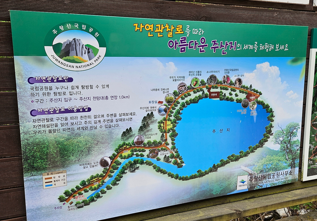주차를 하고 주산지를 걸어서 올라간다. 꽃마차를 타고 올라갈 수 있지만 오늘은 운행을 하지 않고 있다. 무공해 삼륜차도 있는데 이차도 운행을 하지 않고 있다. 대부분 사람들이 걸어서 올라가는데 나이 든 사람들은 어려움이 있다고 하는데 비가 오더라도 운행을 하였으면 좋겠다. 주산지는 조선시대 경종시절 건설한 저수지이다. 우리나라에는 자연적으로 형성된 호수가 없다. 주산지가 오래되었고 그곳에 200여 년 이상된 왕버들이 물속에 자리를 잡고 있어서 유명하다고 할 수 있다. 입구에 주산지를 건설한 것에 대한 공적비가 있다. 자연적으로 이루어진 호수나 저수지가 없지만 제천의 의림지, 청송의 주산지는 조상의 지혜를 볼 수 있는 곳이다.