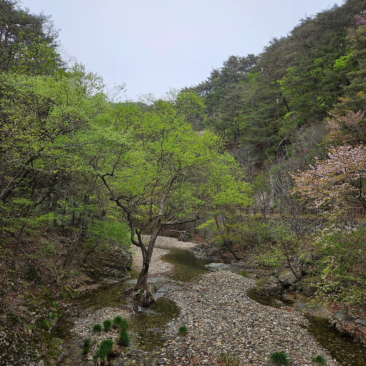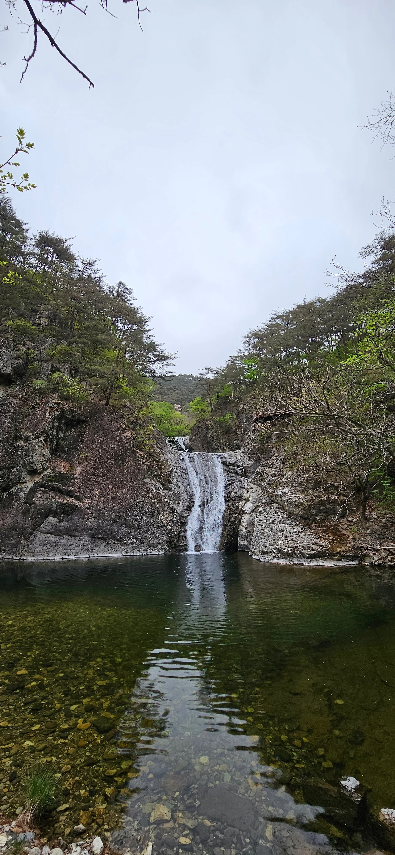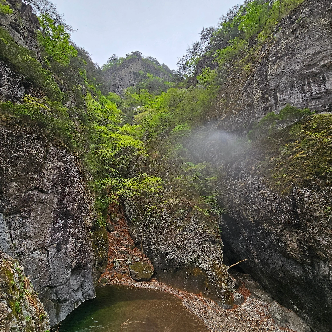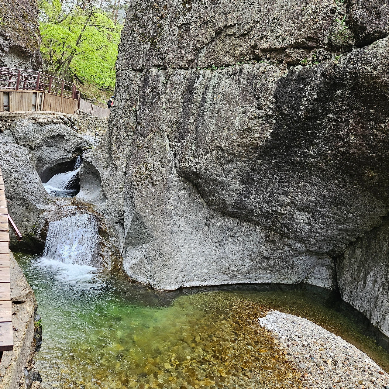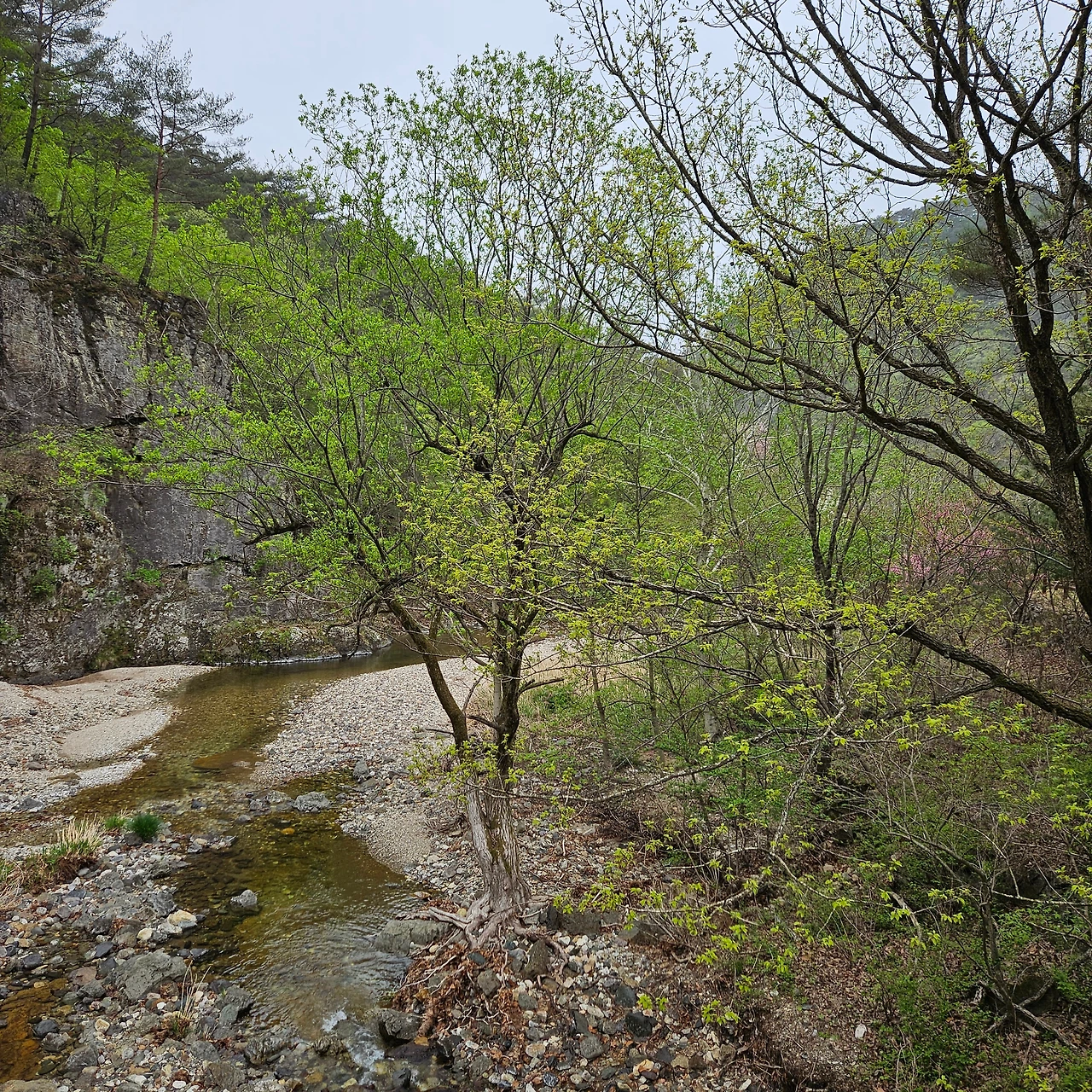 이제 용추협곡, 용추폭포로 간다. 다리를 건너면서 개울에 4년 이상 다리를 담그고 있는 버드나무를 담아본다. 주산지를 오늘 가니까 그곳에는 더 오래 족욕을 하고 있는 왕버들이 있는데 이곳은 그렇지 않지만, 내가 4년 전에 왔을 때도 그랬었는데 오늘도 그렇다. 하천이 넓어졌다가 다시 용추협곡에서 좁아진다. 그 협곡이 이제 우리를 기다린다. 비는 계속 오고 조심조심 걸을 뿐이다. 용추협곡에 쏟아지는 폭포를 보고 아래로 내려가면 학소대, 시루봉이 머리를 들고 기다리고 있다. 비가 오지만 사람들이 꾸준하게 오르내리고 있다. 주왕암이 있고 주왕굴을 보기 위하여 생태통로를 따라간다. 큰길을 걷는 것보다 좋다. 전망대가 있어서 그곳에서 다시 한번 주왕산의 멋진 경치를 본다. 비가 오면서 황사가 걷히고 바위들이 그 자태를 보여준다.