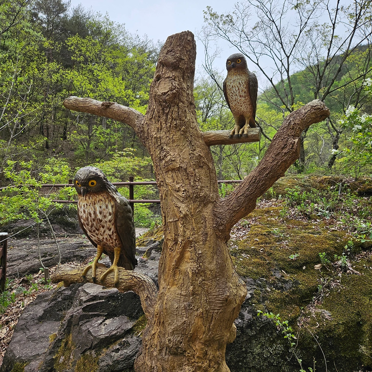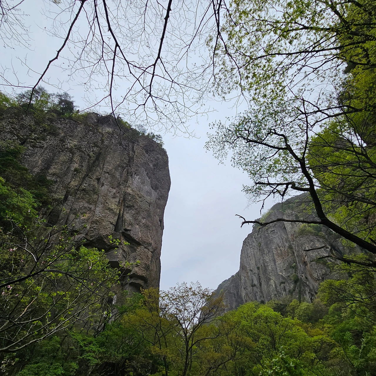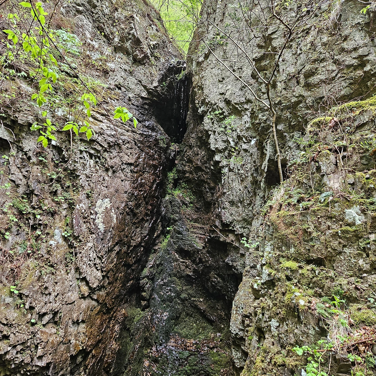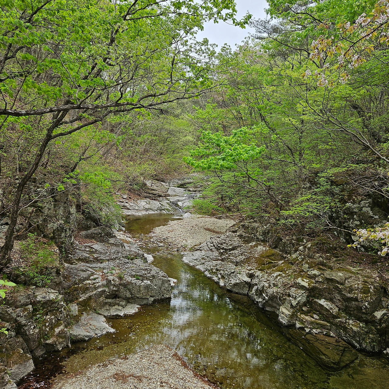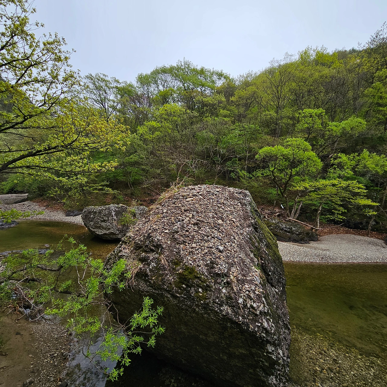 이제 용추협곡, 용추폭포로 간다. 다리를 건너면서 개울에 4년 이상 다리를 담그고 있는 버드나무를 담아본다. 주산지를 오늘 가니까 그곳에는 더 오래 족욕을 하고 있는 왕버들이 있는데 이곳은 그렇지 않지만, 내가 4년 전에 왔을 때도 그랬었는데 오늘도 그렇다. 하천이 넓어졌다가 다시 용추협곡에서 좁아진다. 그 협곡이 이제 우리를 기다린다. 비는 계속 오고 조심조심 걸을 뿐이다. 용추협곡에 쏟아지는 폭포를 보고 아래로 내려가면 학소대, 시루봉이 머리를 들고 기다리고 있다. 비가 오지만 사람들이 꾸준하게 오르내리고 있다. 주왕암이 있고 주왕굴을 보기 위하여 생태통로를 따라간다. 큰길을 걷는 것보다 좋다. 전망대가 있어서 그곳에서 다시 한번 주왕산의 멋진 경치를 본다. 비가 오면서 황사가 걷히고 바위들이 그 자태를 보여준다.