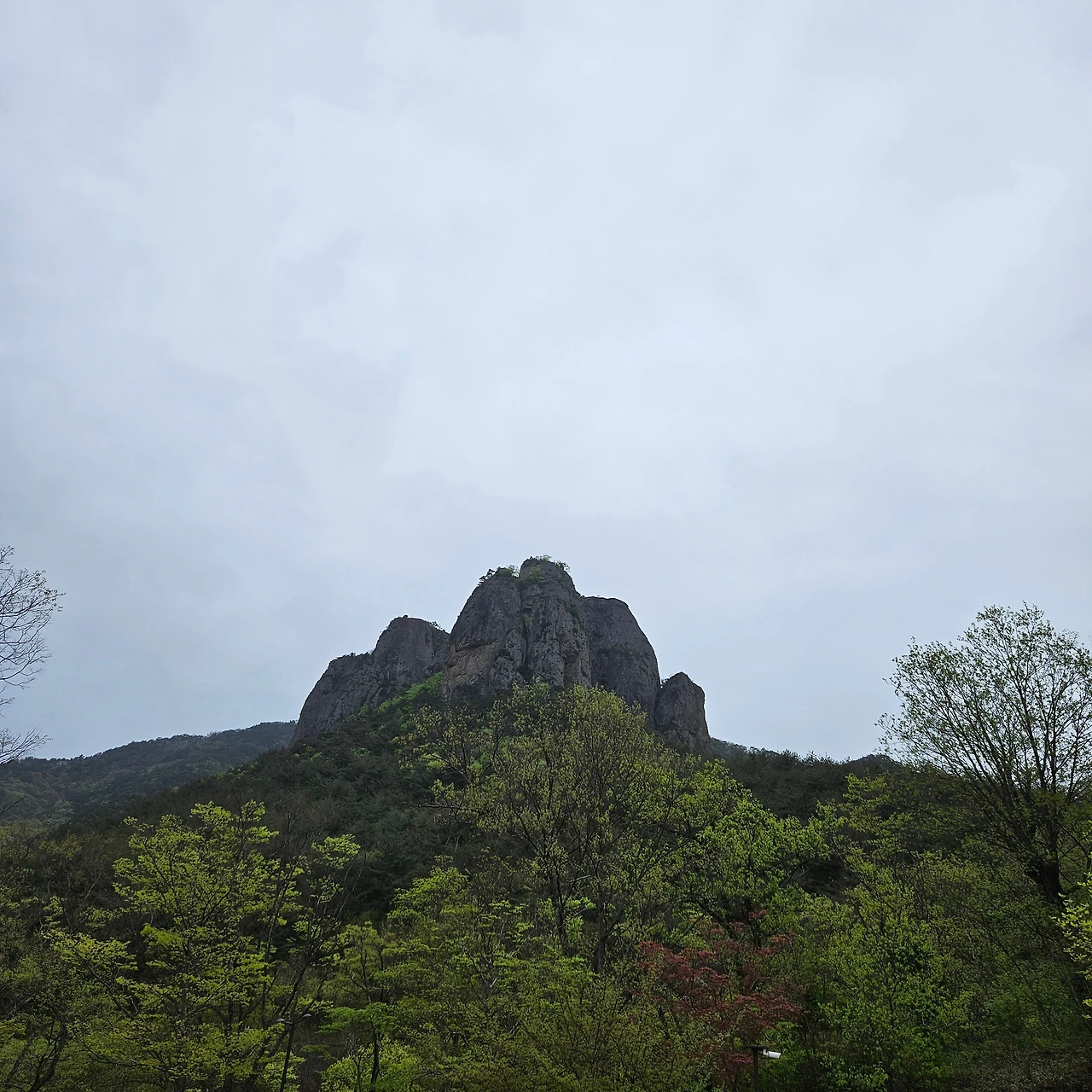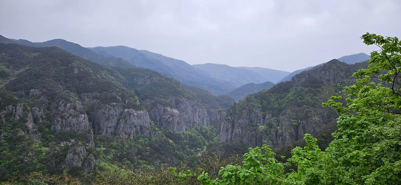 비가 오기 전의 황사의 뒤끝은 여전하다. 아직 아침 안개와 같이 섞여서 그렇게 깨끗하게 보이지 않지만 대전산에서 기암을 바라다보고 주봉으로 간다. 주봉을 오르면서 힘들다고 생각하면 전망대가 있다. 3번의 전망대를 지나면 주봉이 보이고 그곳을 오르면 된다.